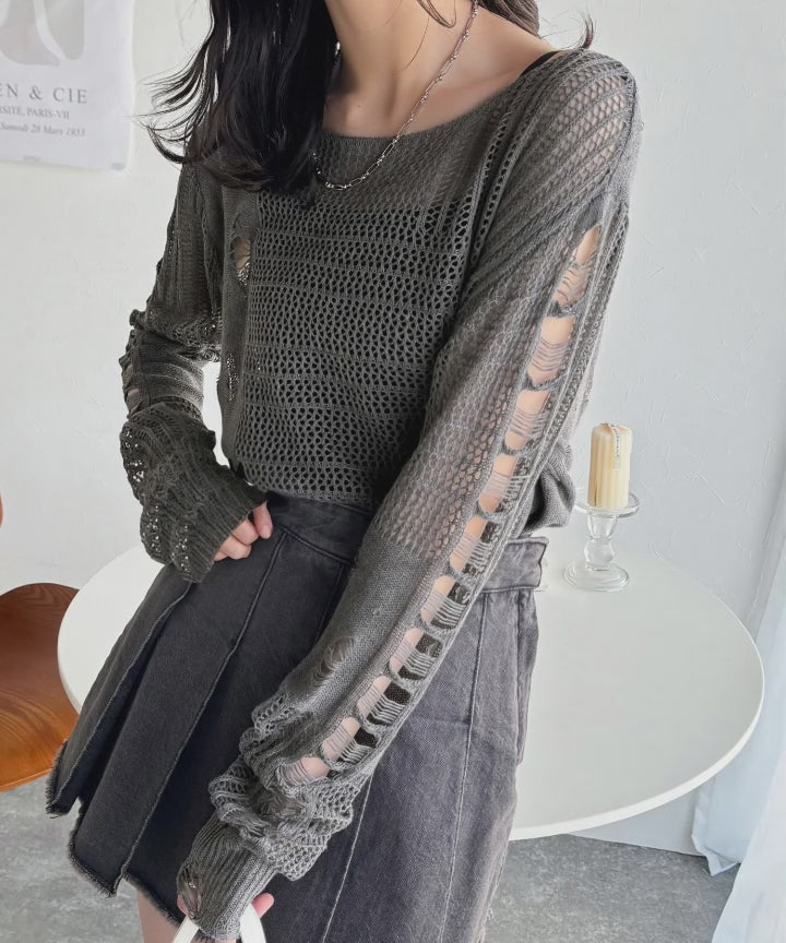 ランダムな透け感とダメージ加工がポイントの透かし編みニット。