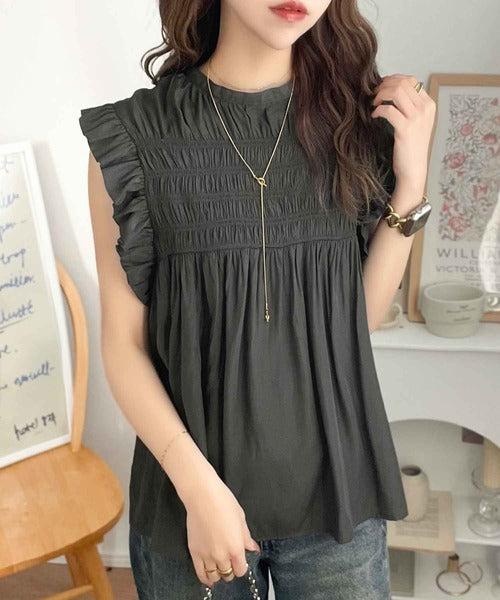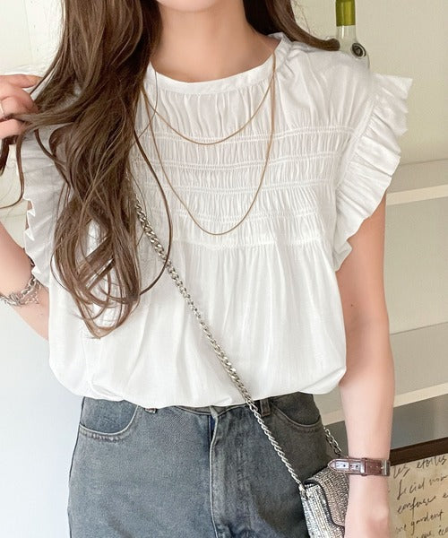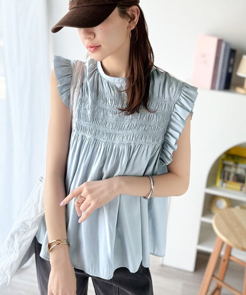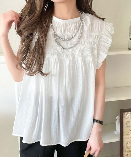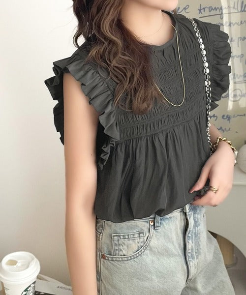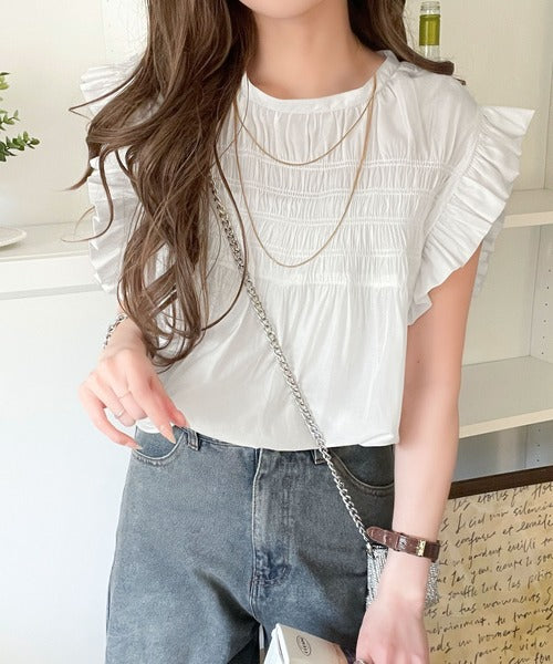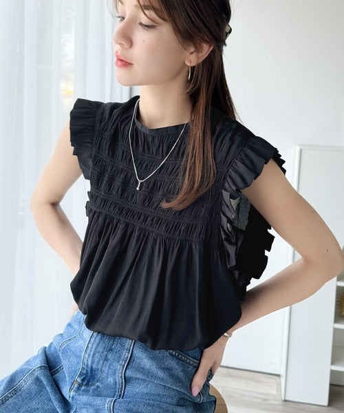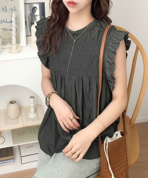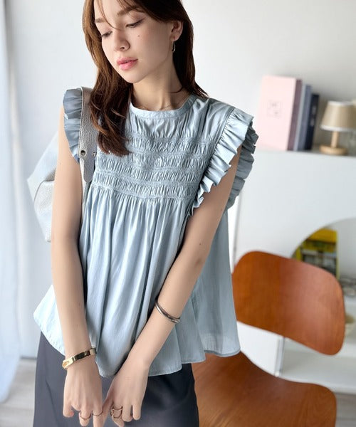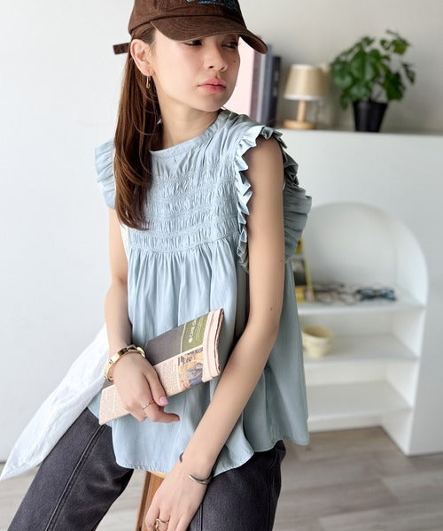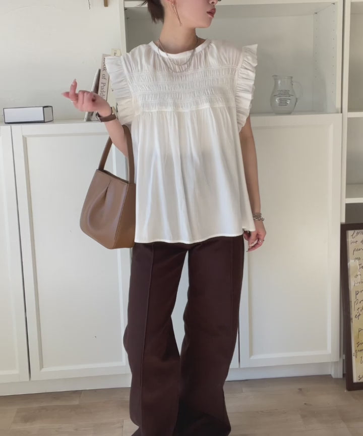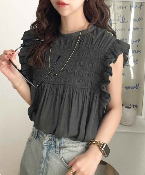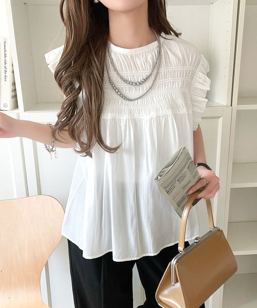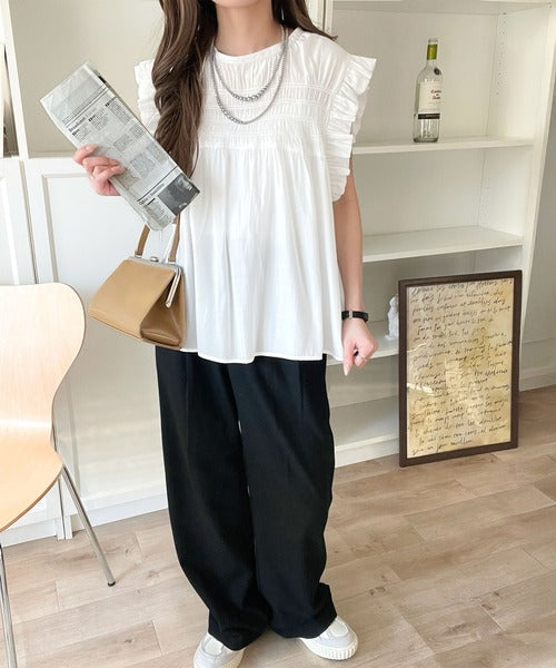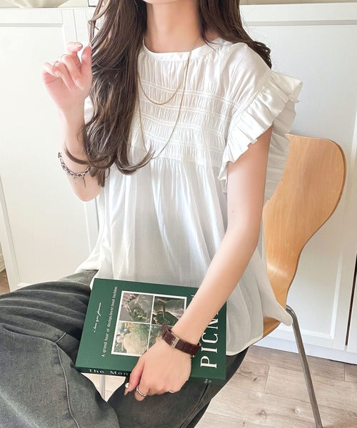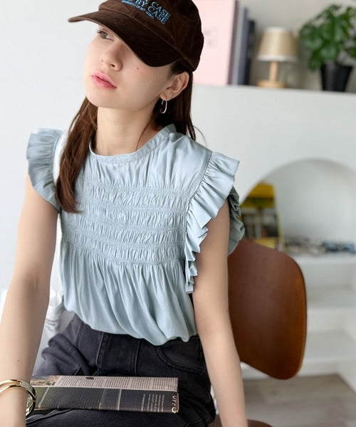 袖フリルとギャザーが可愛らしく女性らしさを引き立てるこのブラウスは春夏コーデに1着は欲しいアイテム!