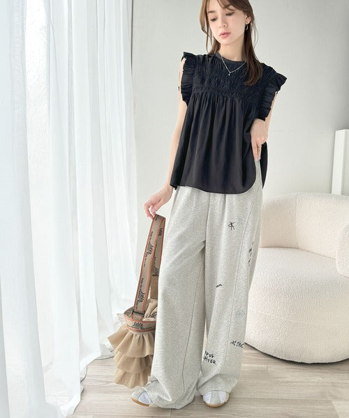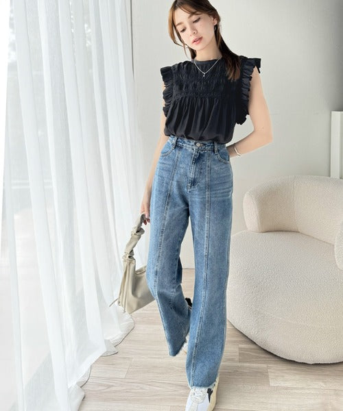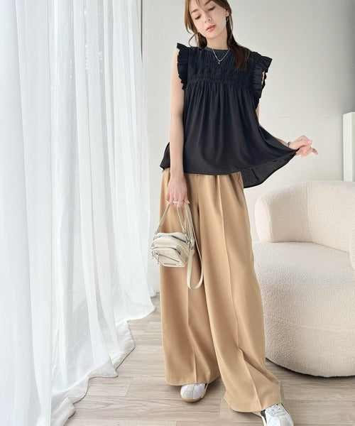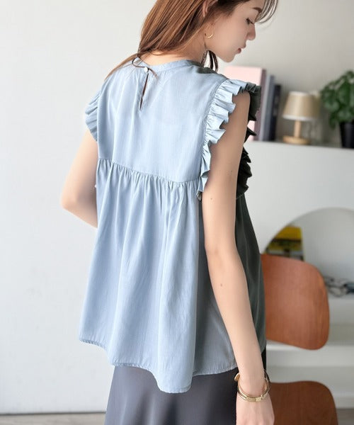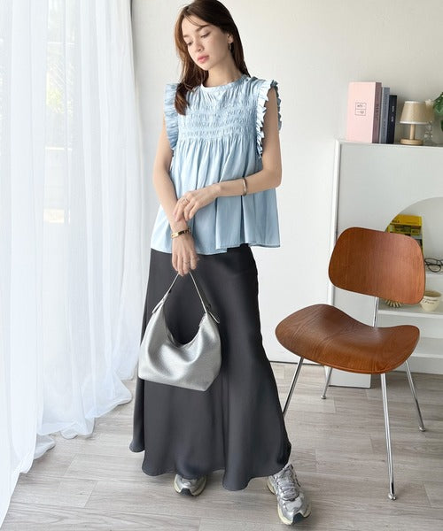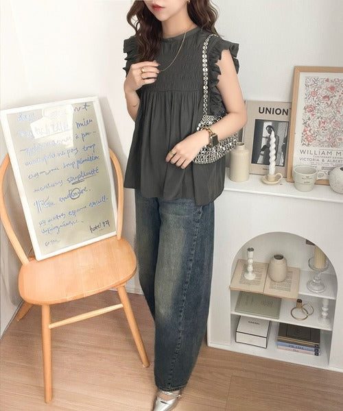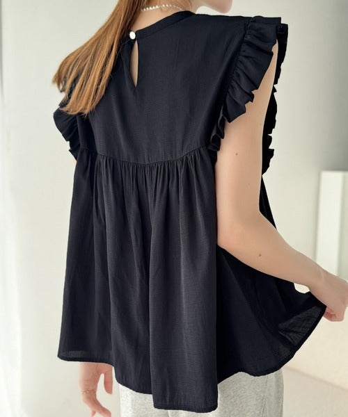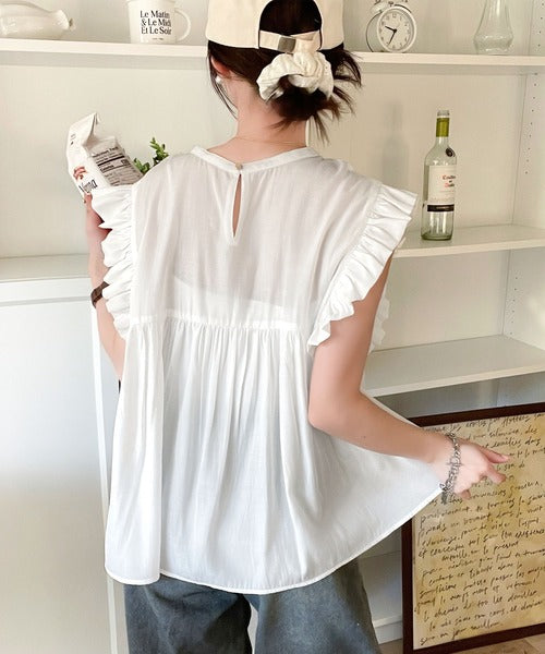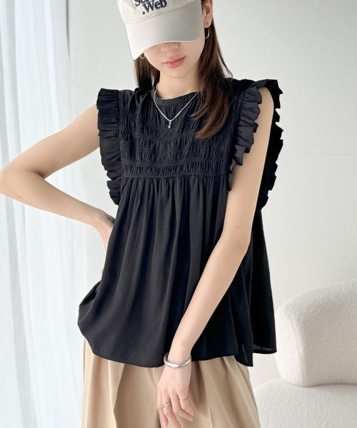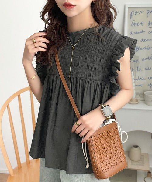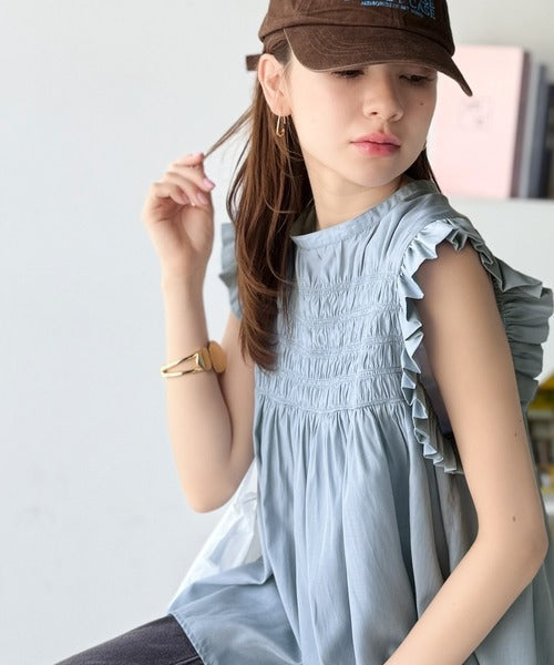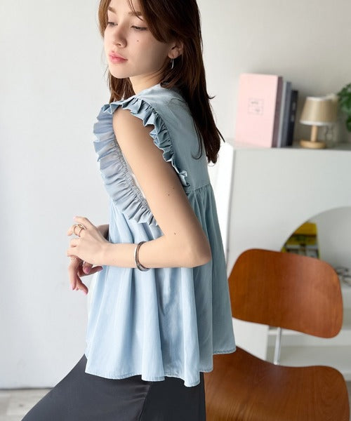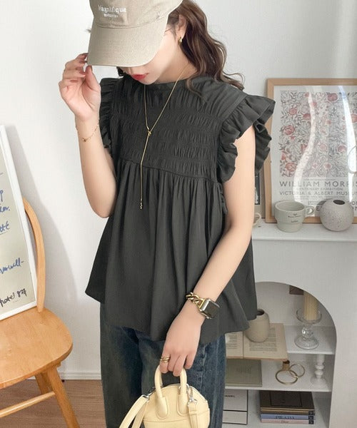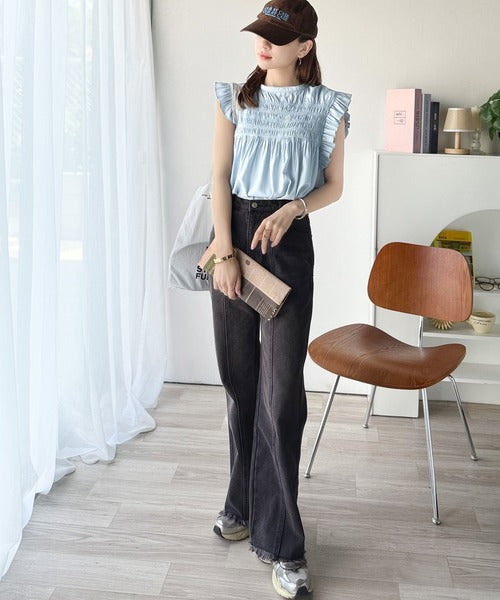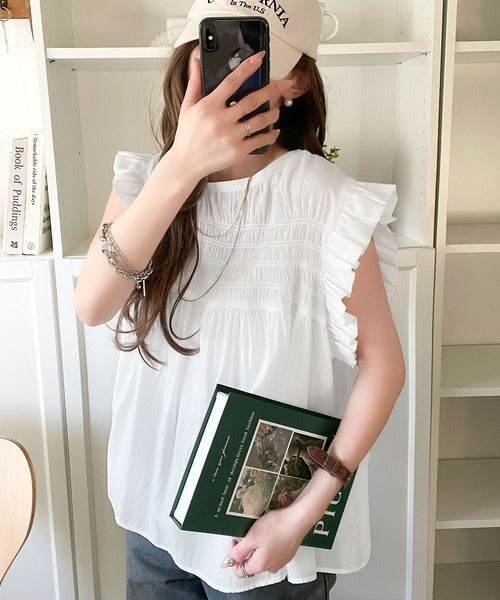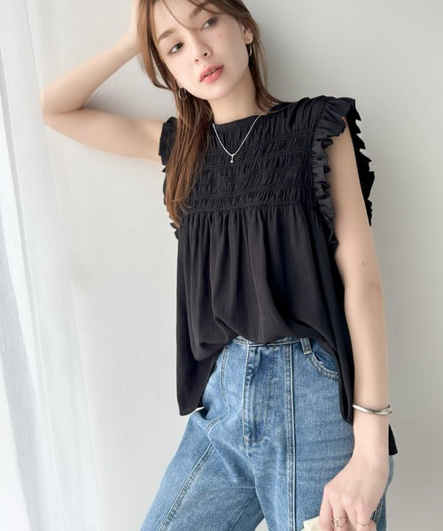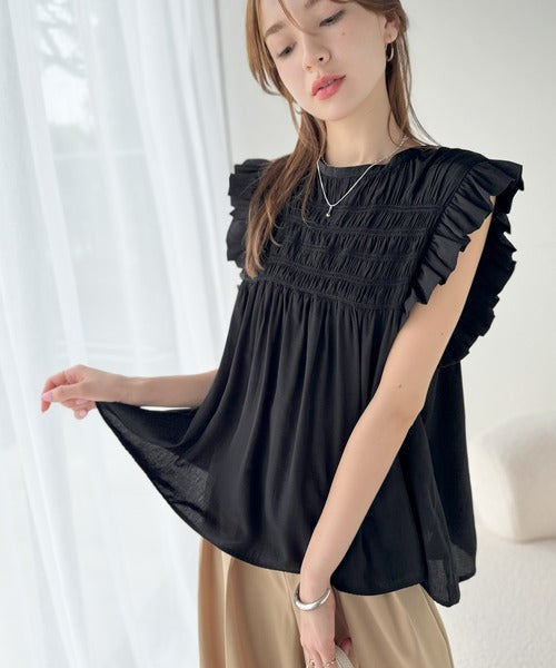 袖フリルとギャザーが可愛らしく女性らしさを引き立てるこのブラウスは春夏コーデに1着は欲しいアイテム!