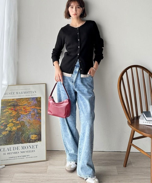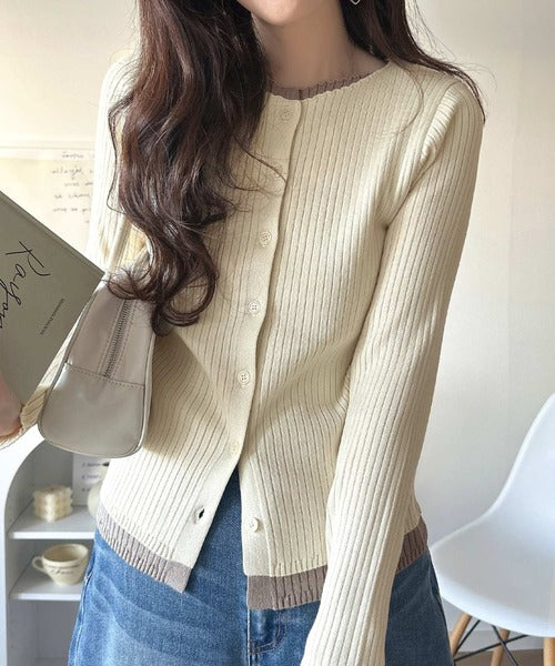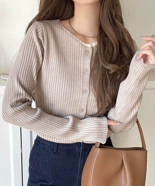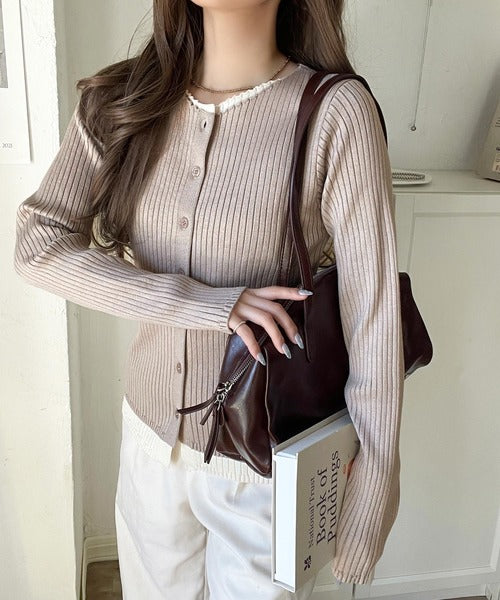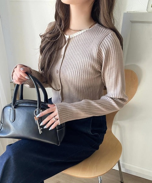 洗練された印象を与えるリブ編みのカーディガントップス。
