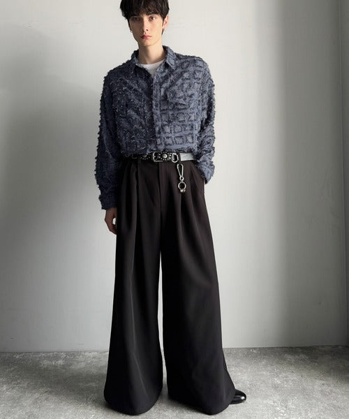 フリンジ使いブロックチェックアウターシャツは、存在感のあるデザインが特徴。
