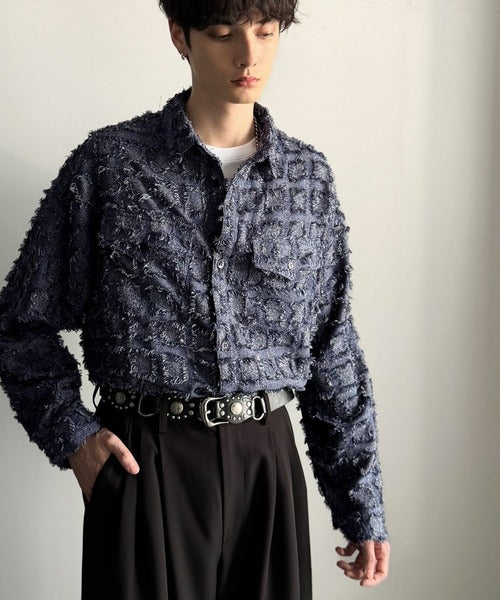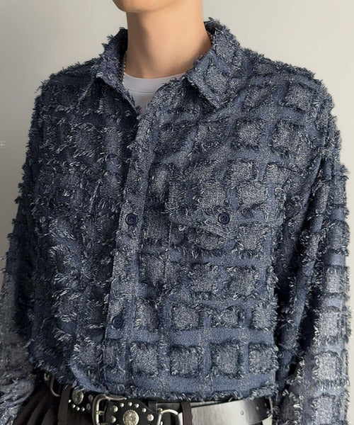 「Fringed block check outer shirt/