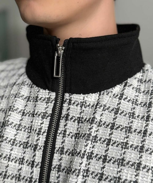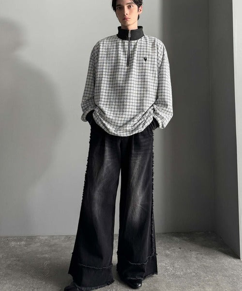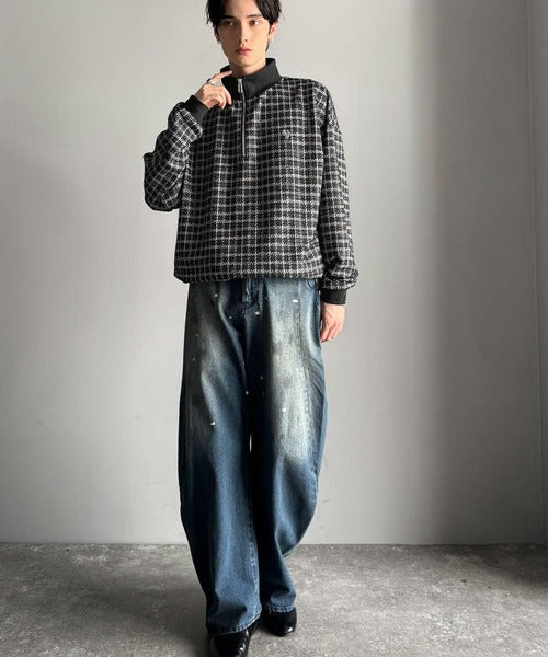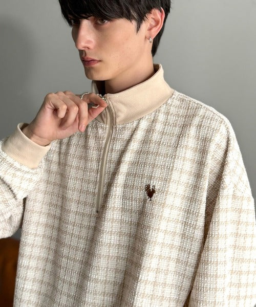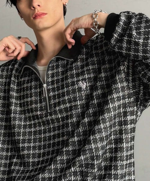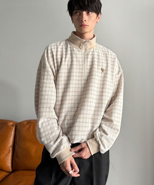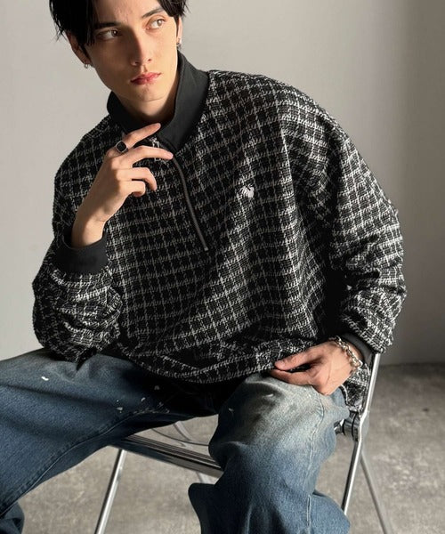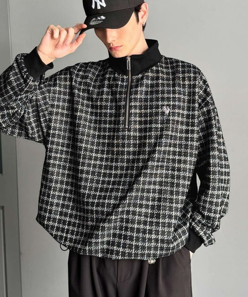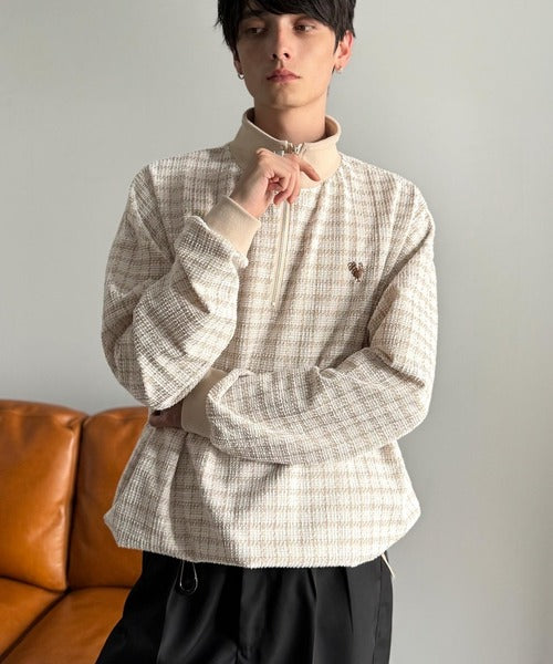 表面感のあるツイード生地を使用したハーフジッププルオーバー。