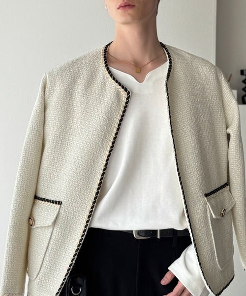 左胸のワンポイントデザインが程よいアクセントとなり、洗練された襟元が上品さを引き立てる。