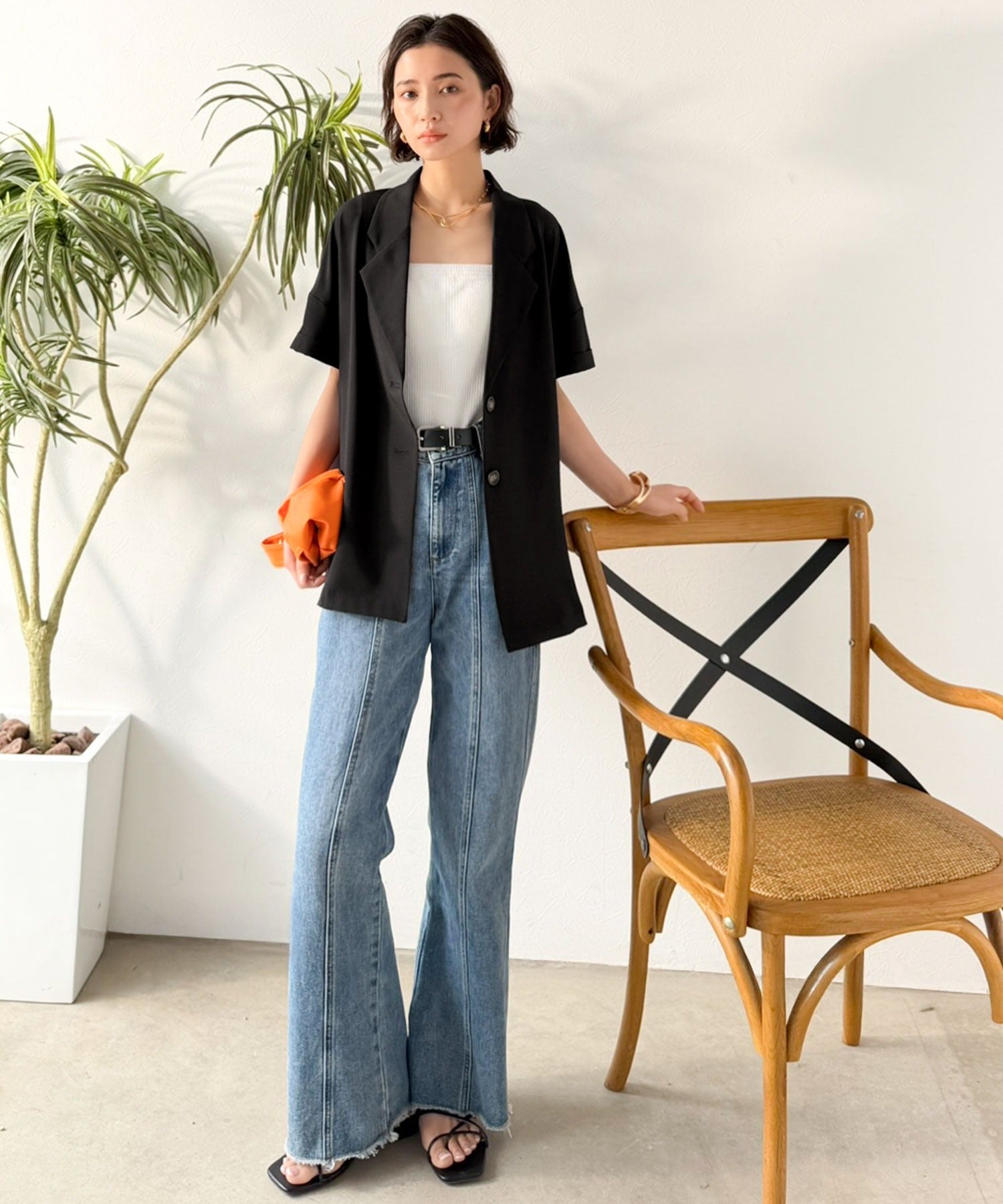 デニムと合わせれば、カジュアルながら洗練された印象に。フレアパンツを選ぶとクールモード感もアップし、スタイルアップ効果も抜群!