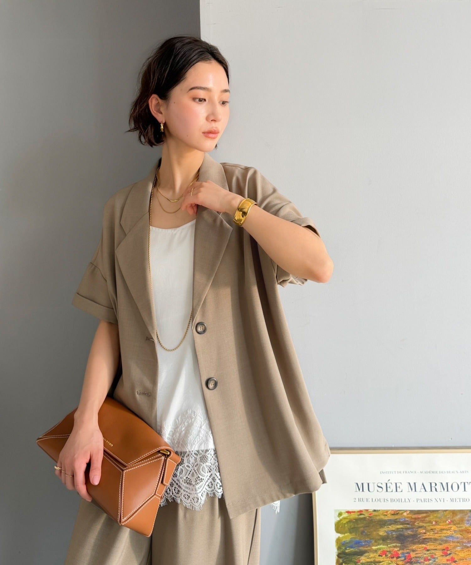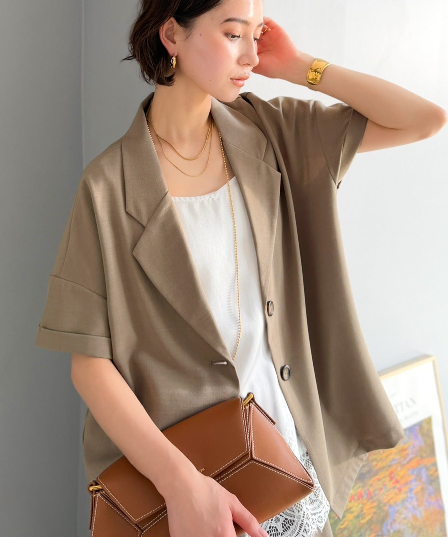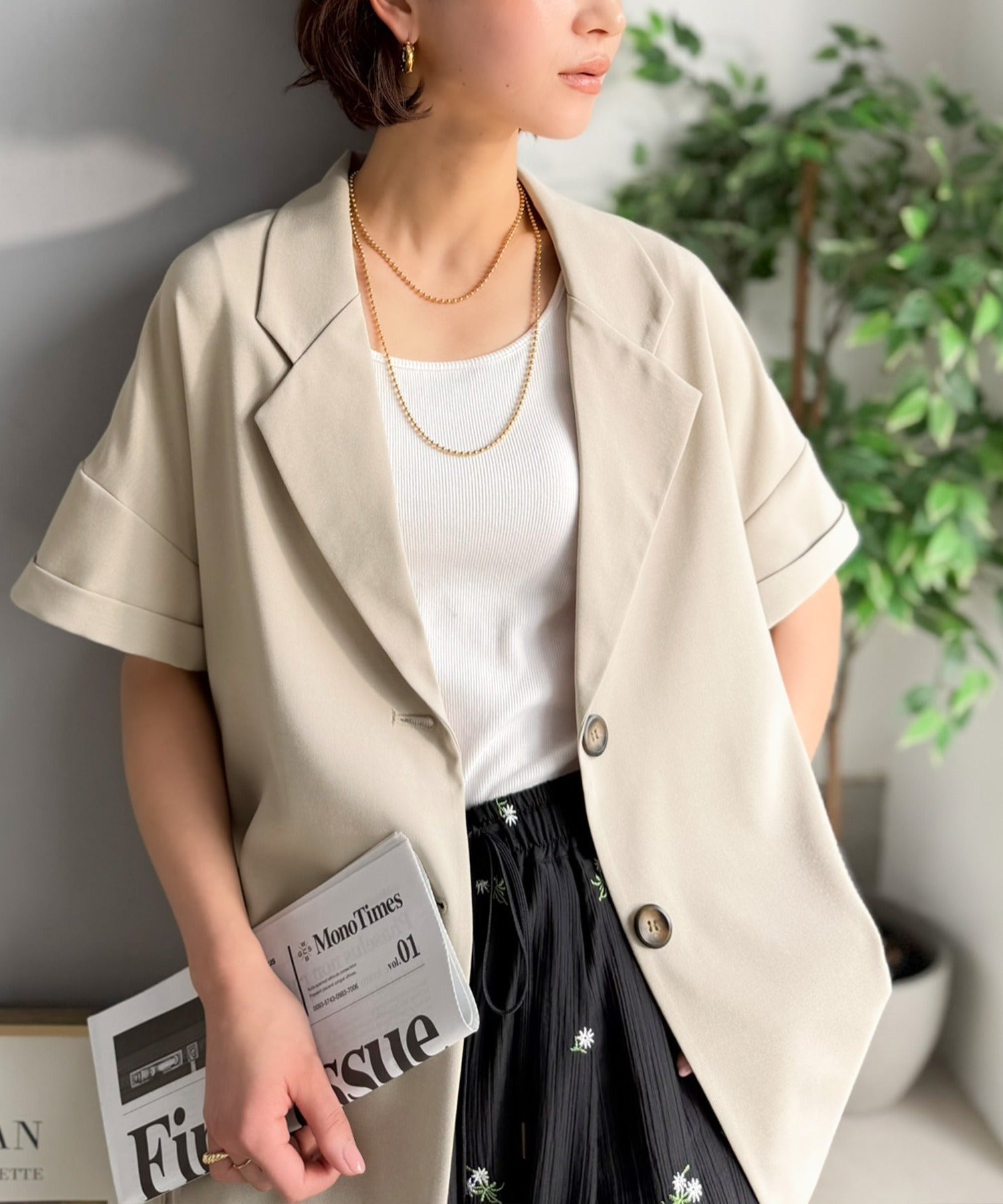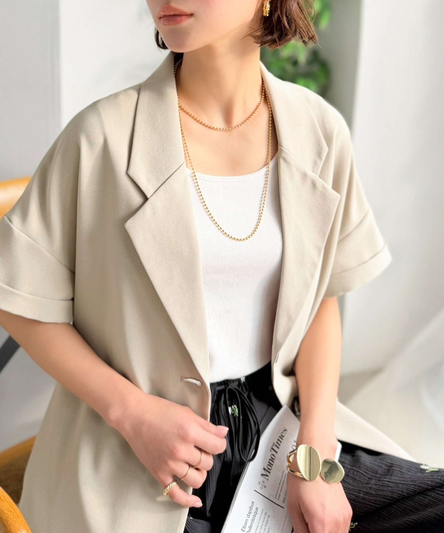 シアートップスを使ったレイヤードスタイルにジャケットを羽織ることで、上品さとヌケ感を演出します♪