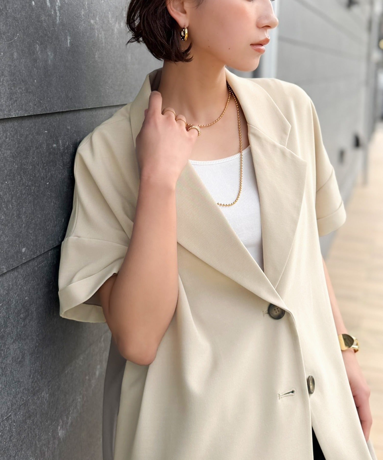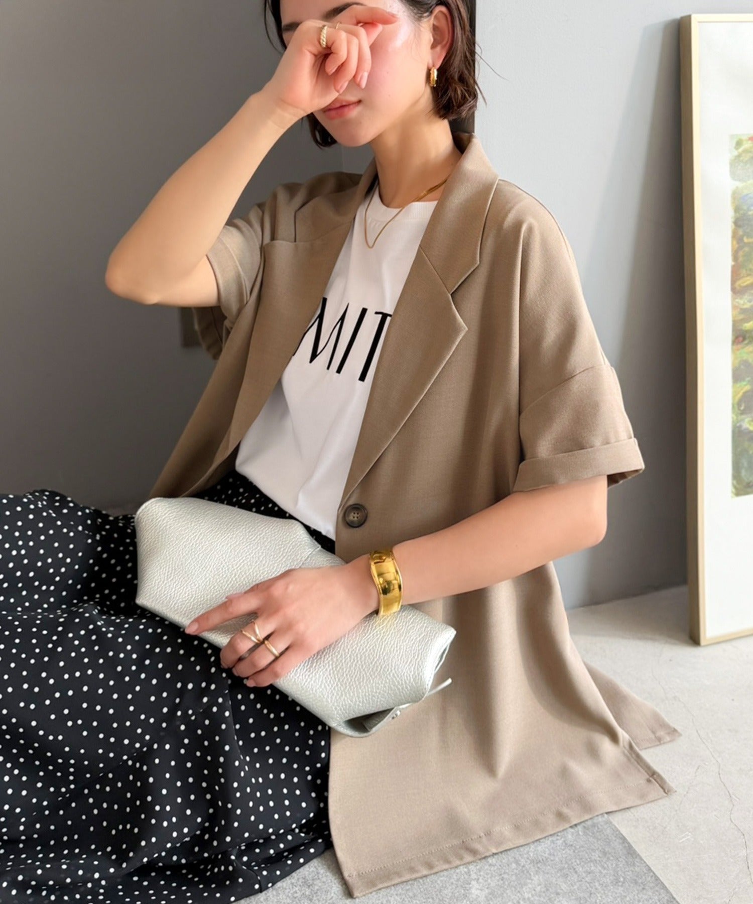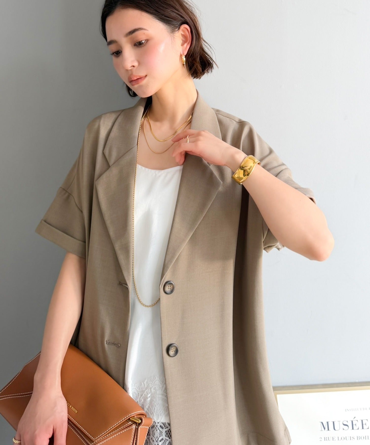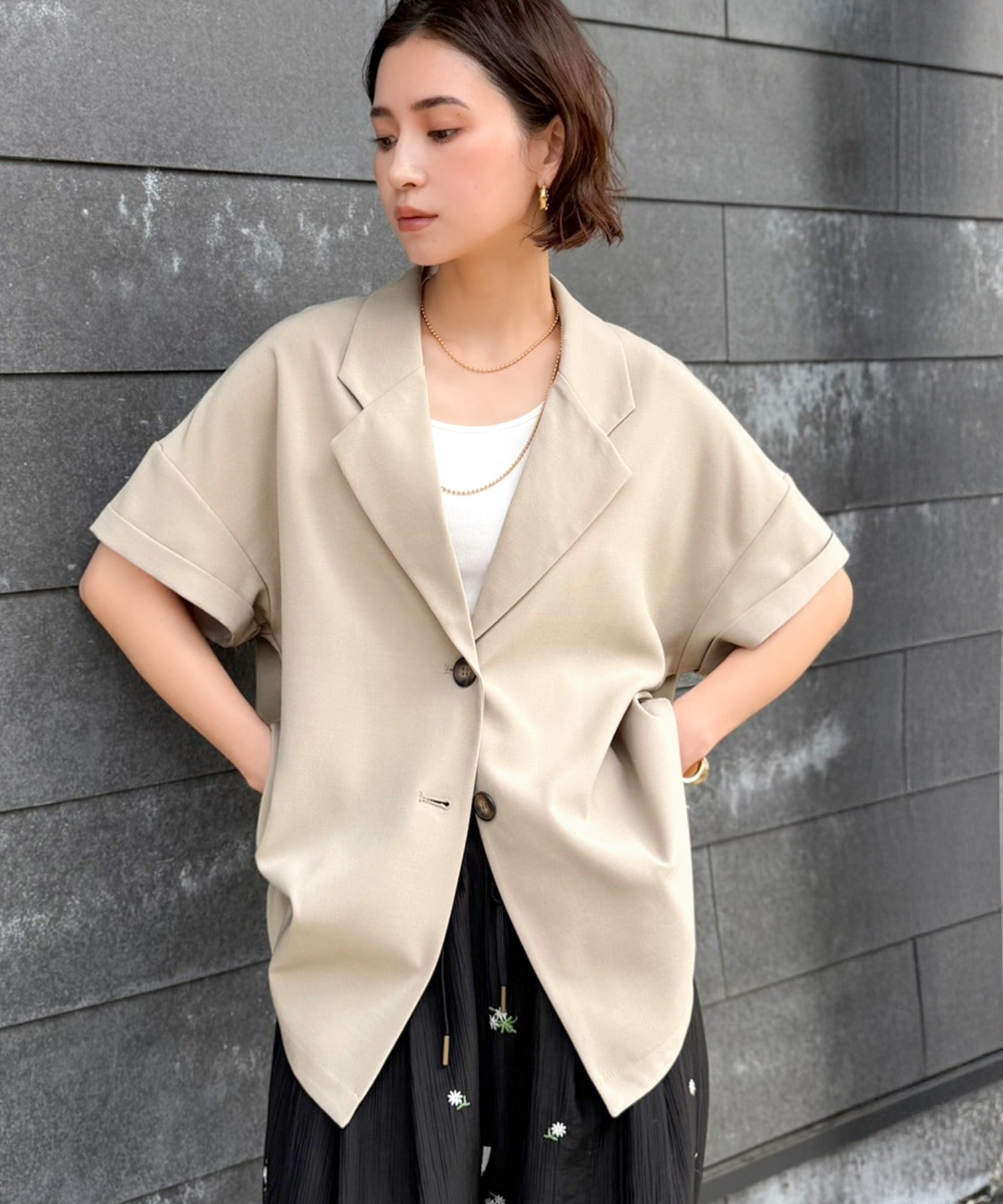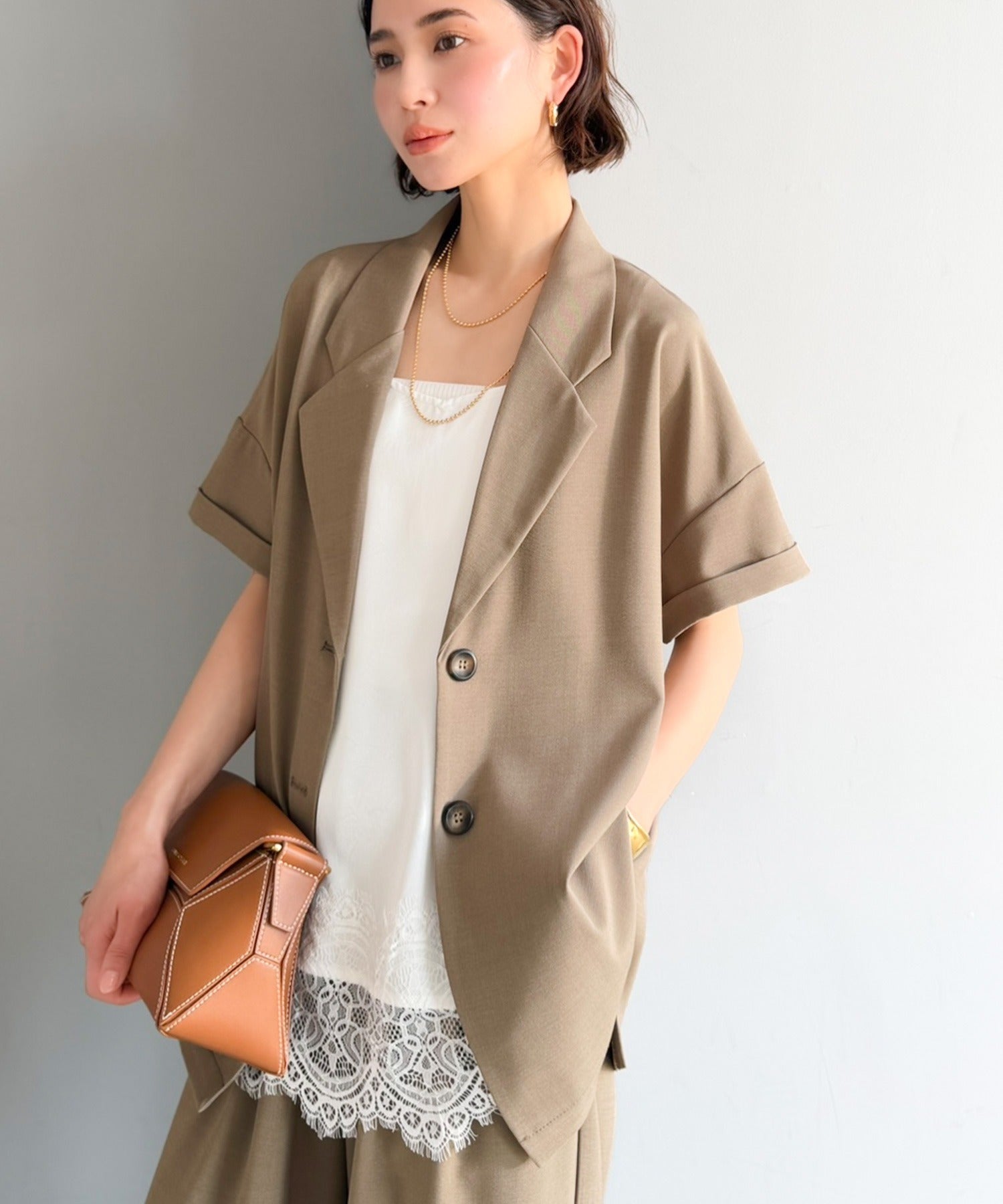 シアートップスを使ったレイヤードスタイルにジャケットを羽織ることで、上品さとヌケ感を演出します♪