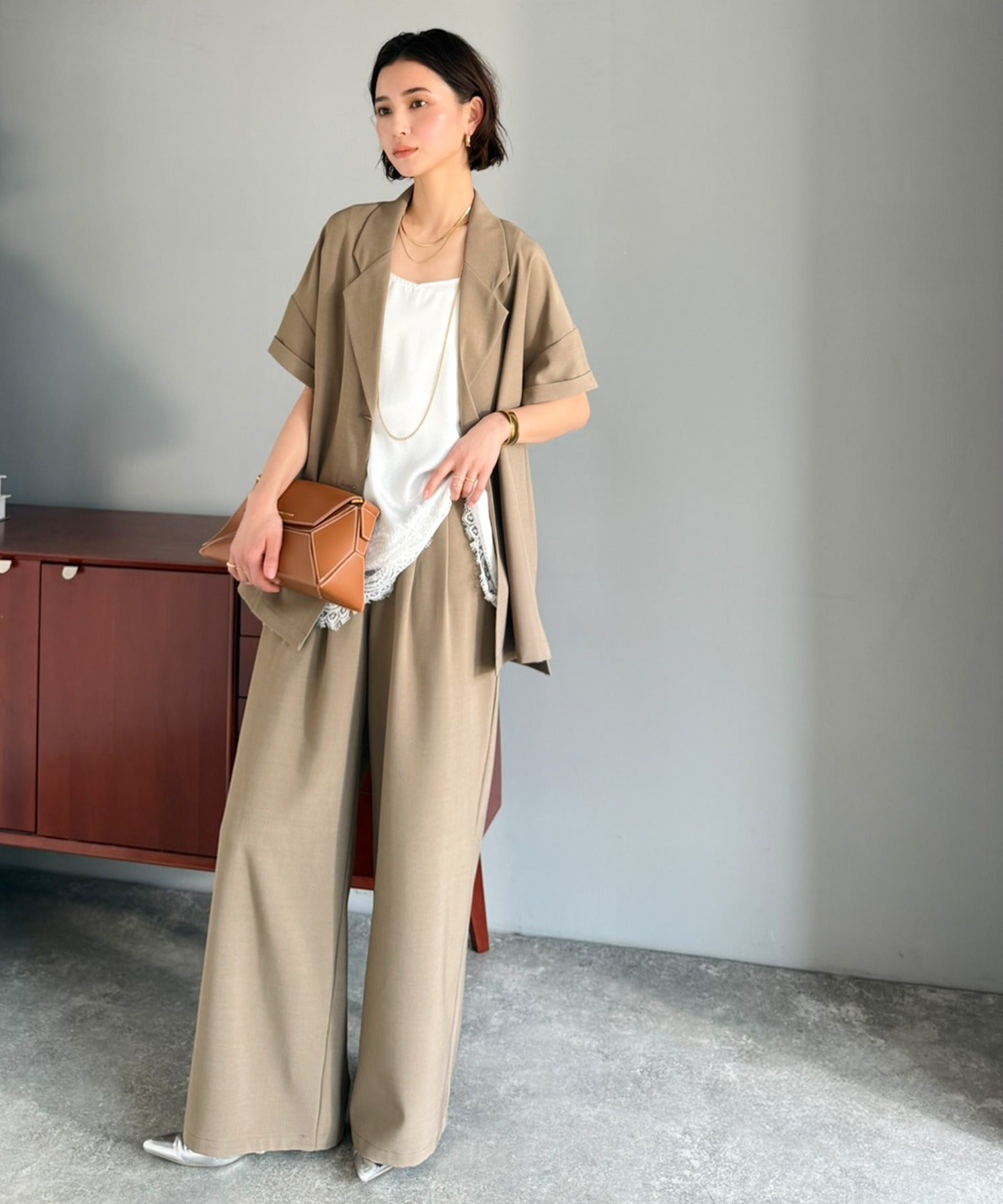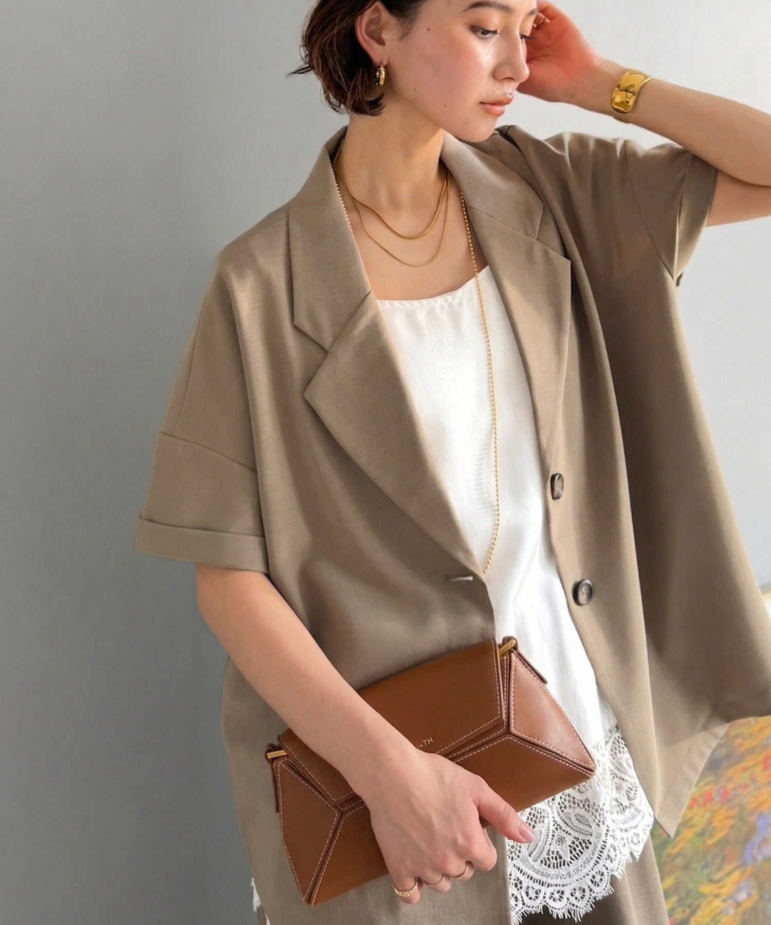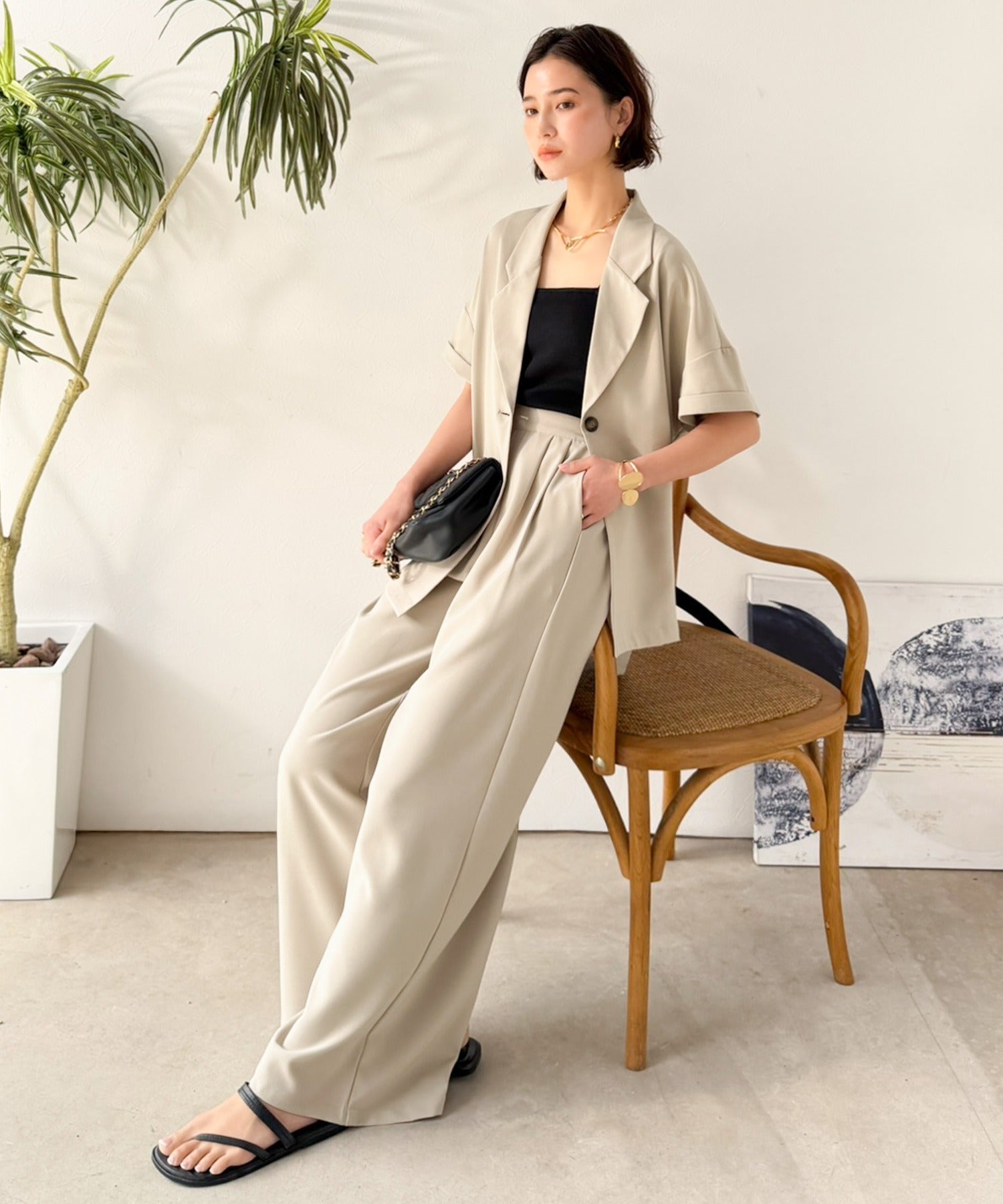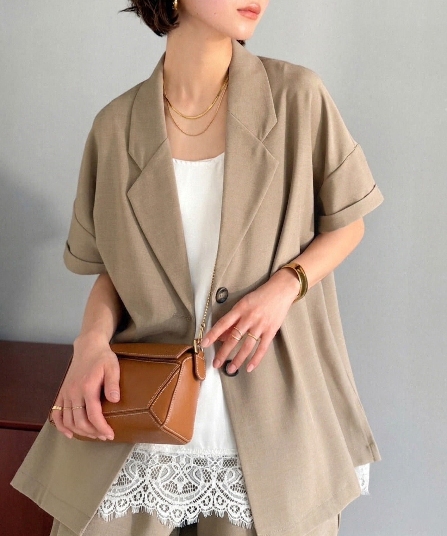 シアートップスを使ったレイヤードスタイルにジャケットを羽織ることで、上品さとヌケ感を演出します♪
