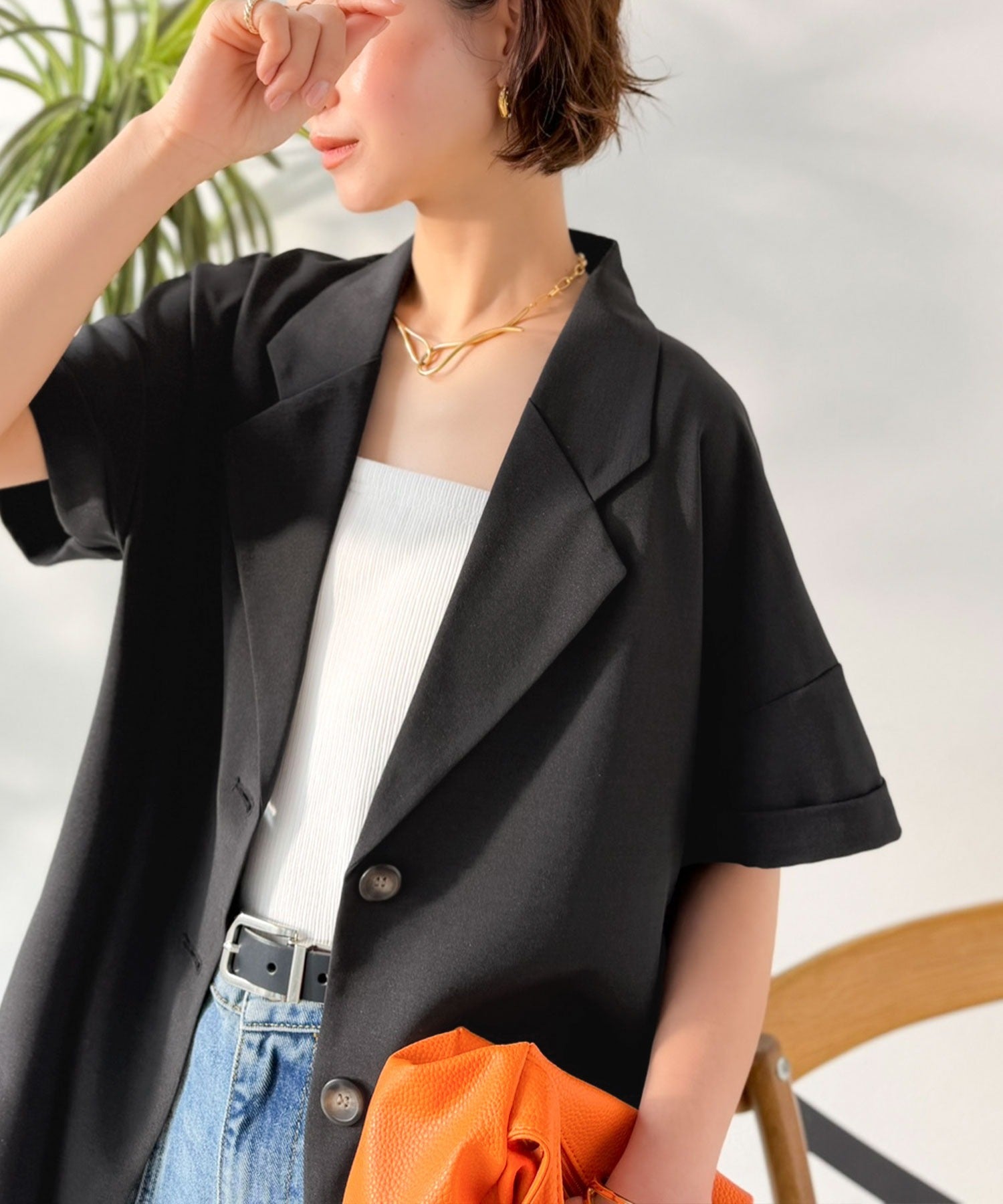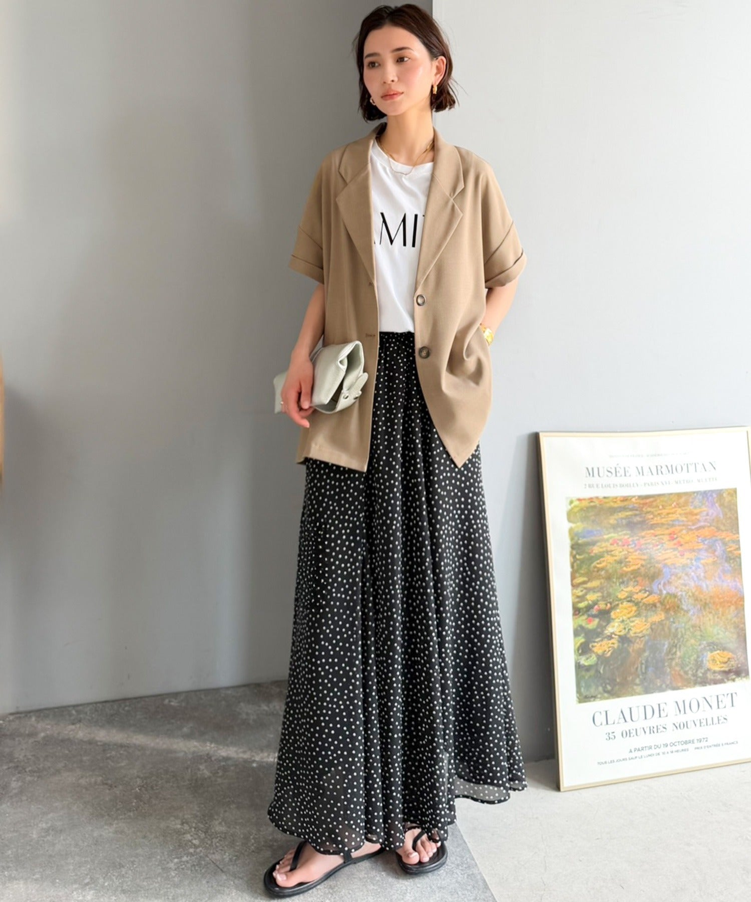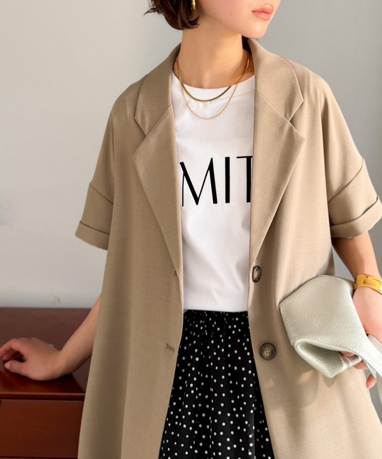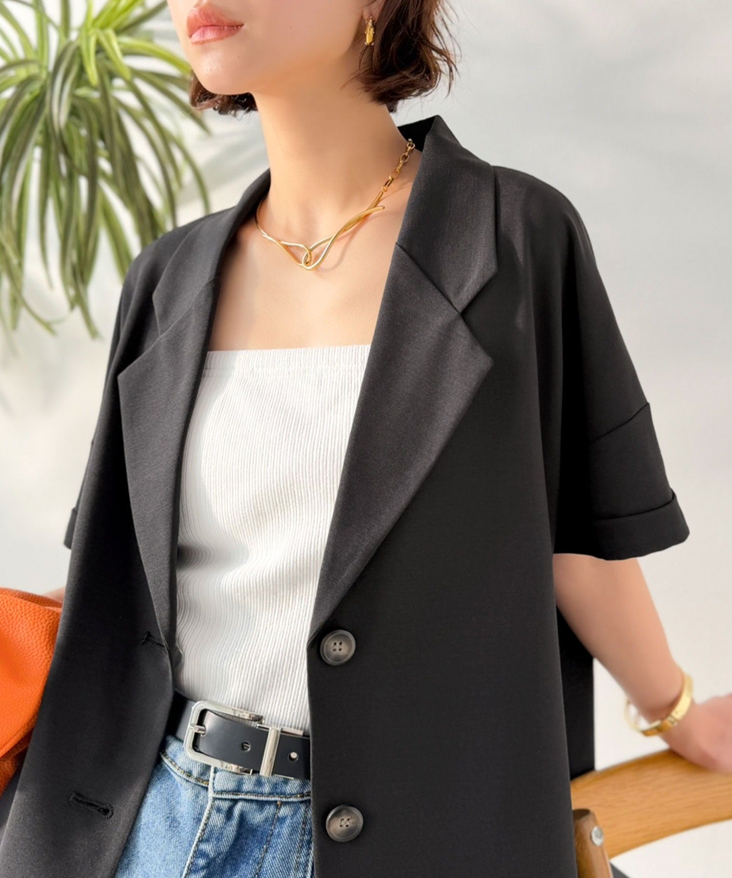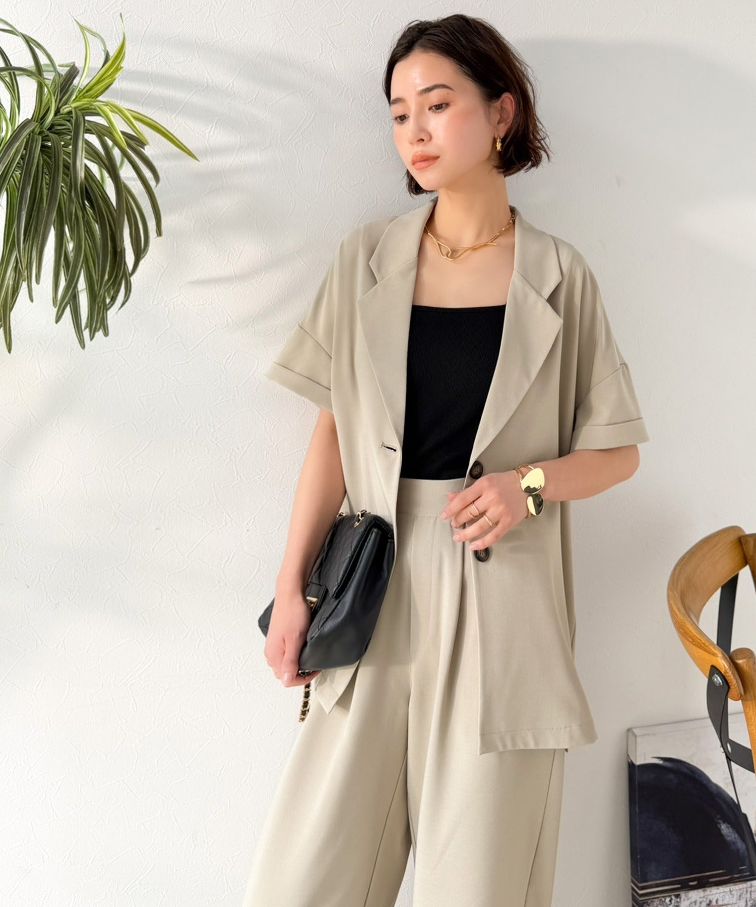 シアートップスを使ったレイヤードスタイルにジャケットを羽織ることで、上品さとヌケ感を演出します♪