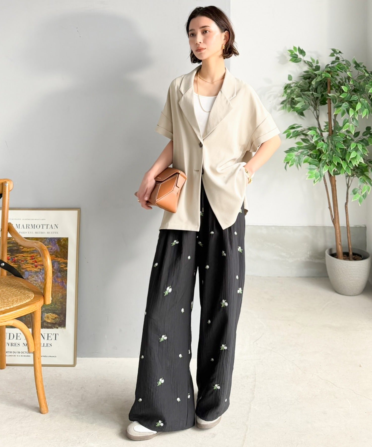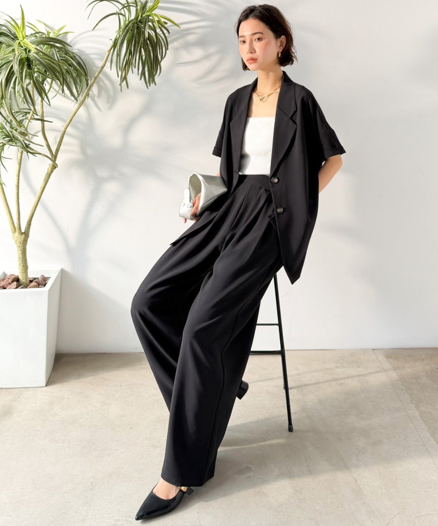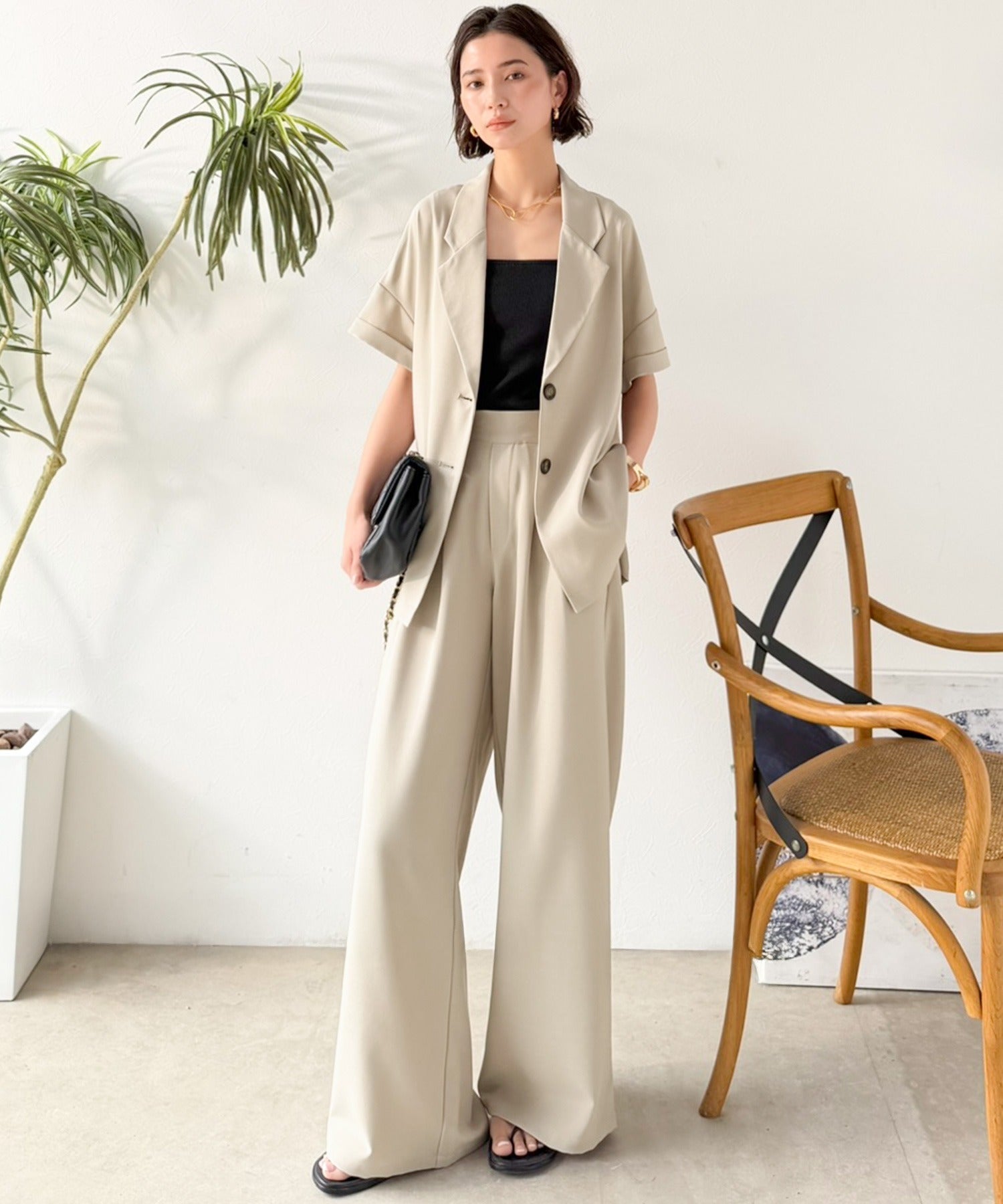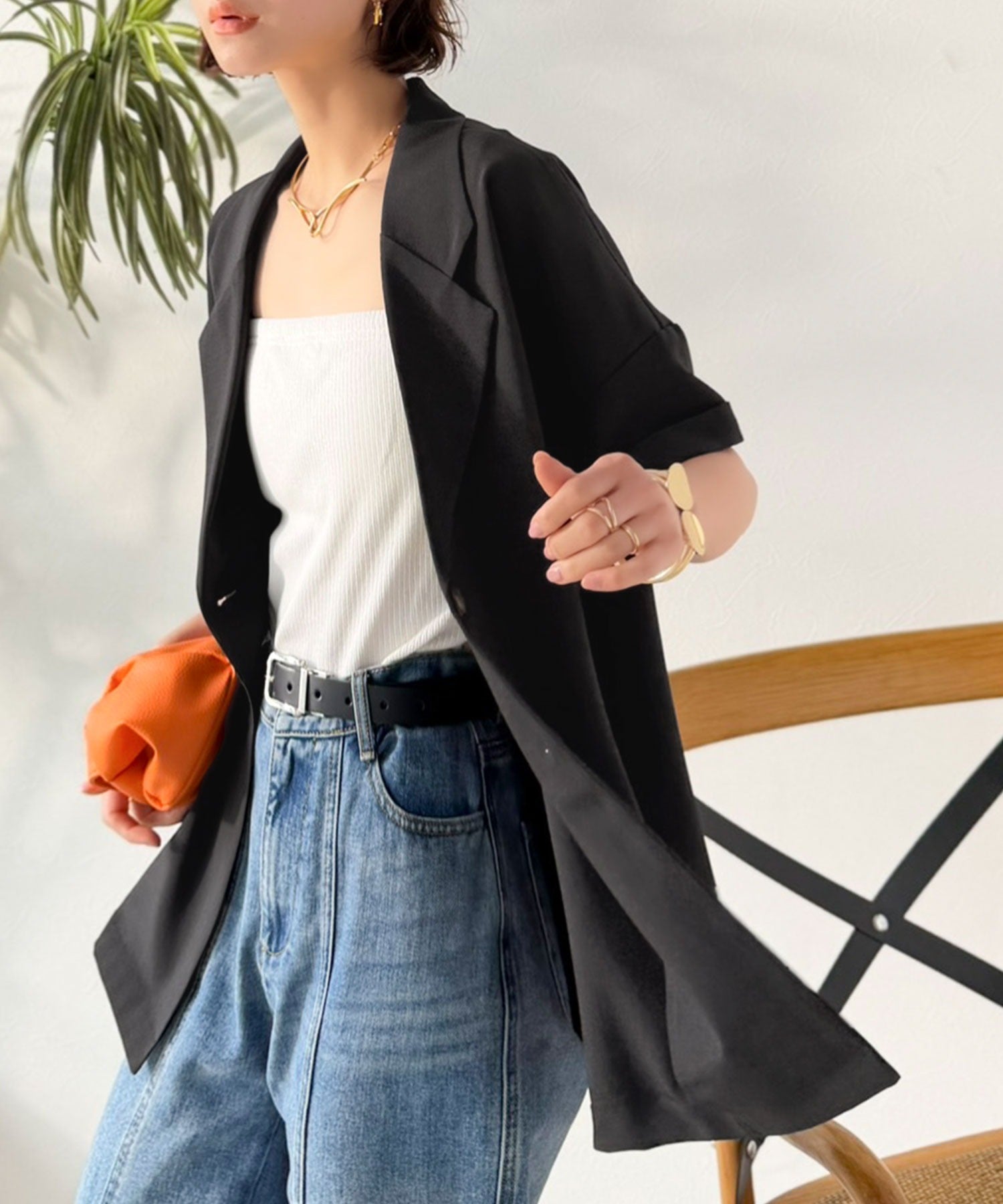 シアートップスを使ったレイヤードスタイルにジャケットを羽織ることで、上品さとヌケ感を演出します♪