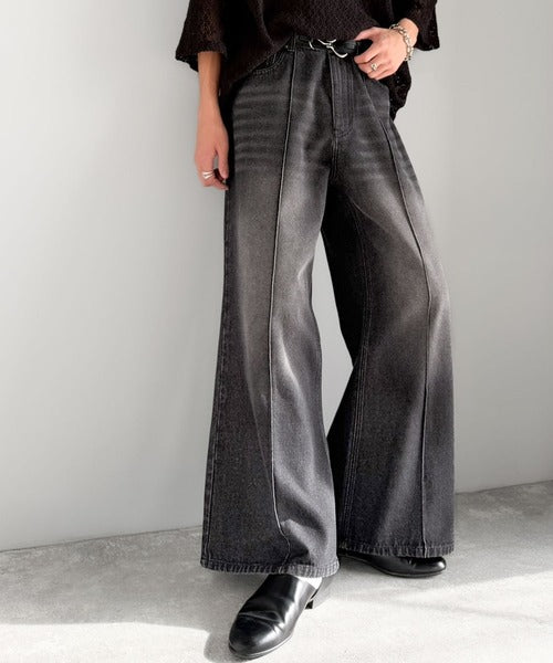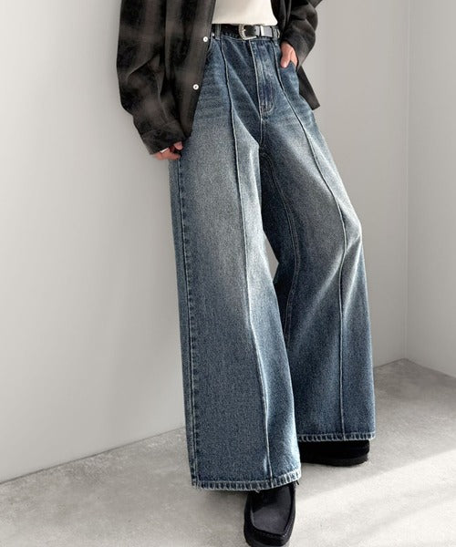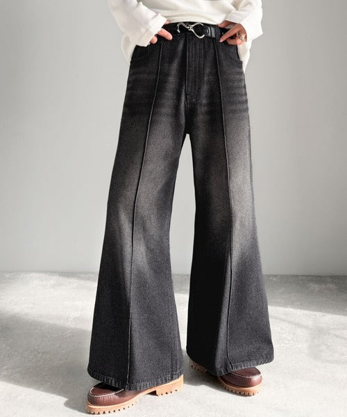ヴィンテージ加工ピンタック入りフレアデニムパンツは、