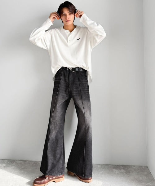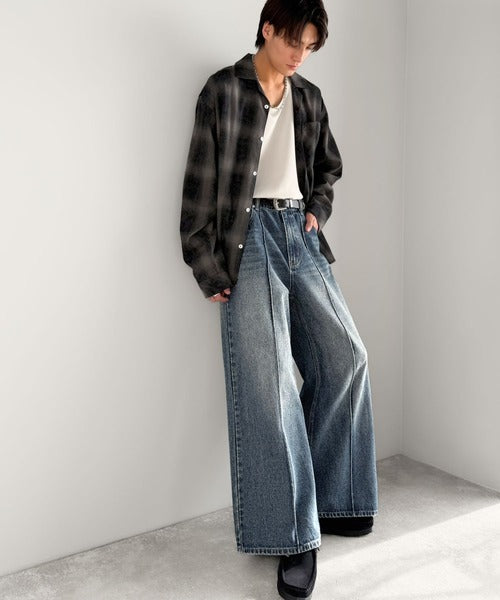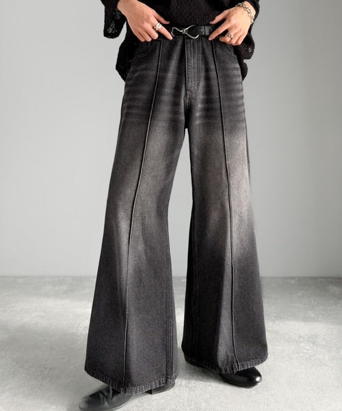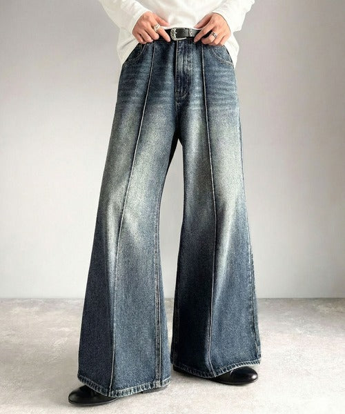 「ヴィンテージ加工 ピンタック入りフレアデニムパンツ」