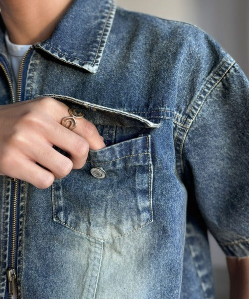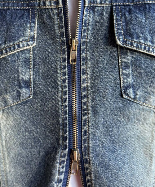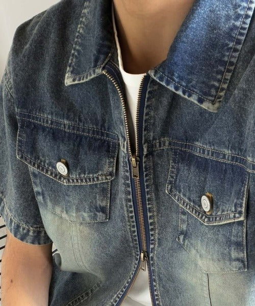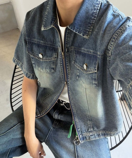 「ヴィンテージ加工ショート丈ダブルジップデニムシャツ」