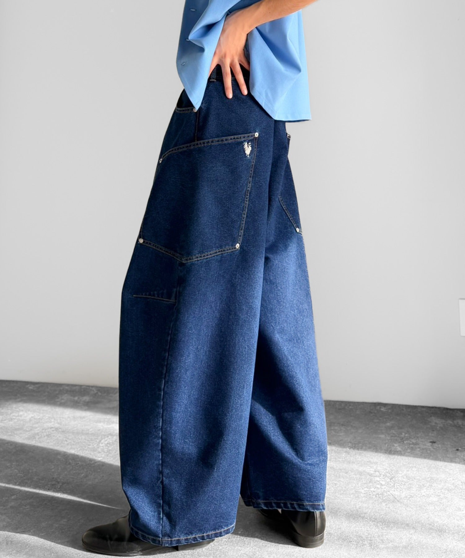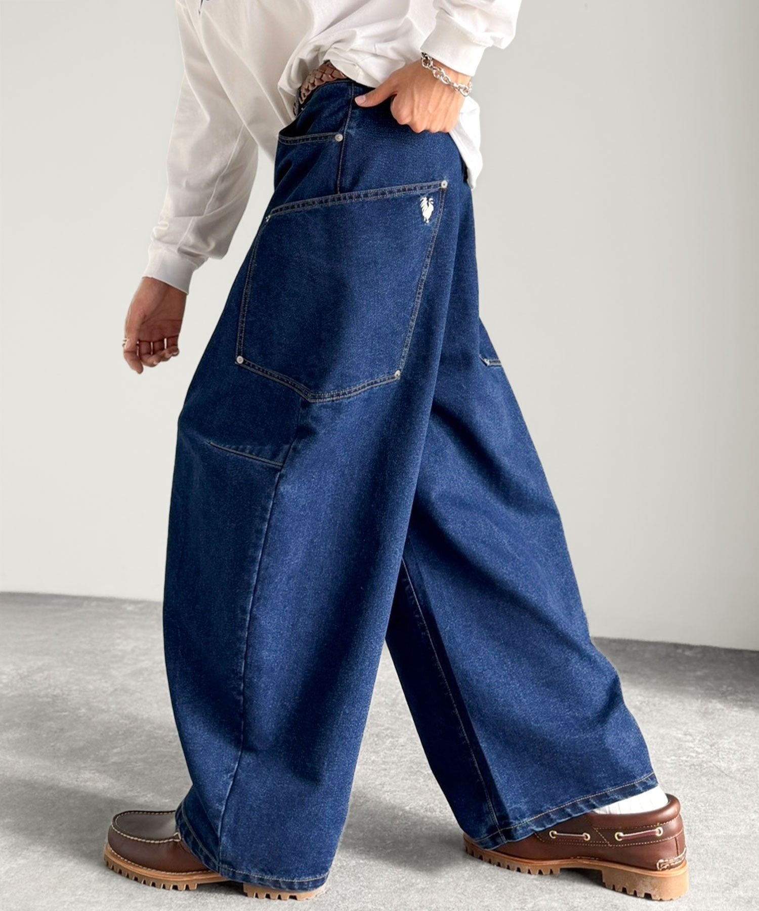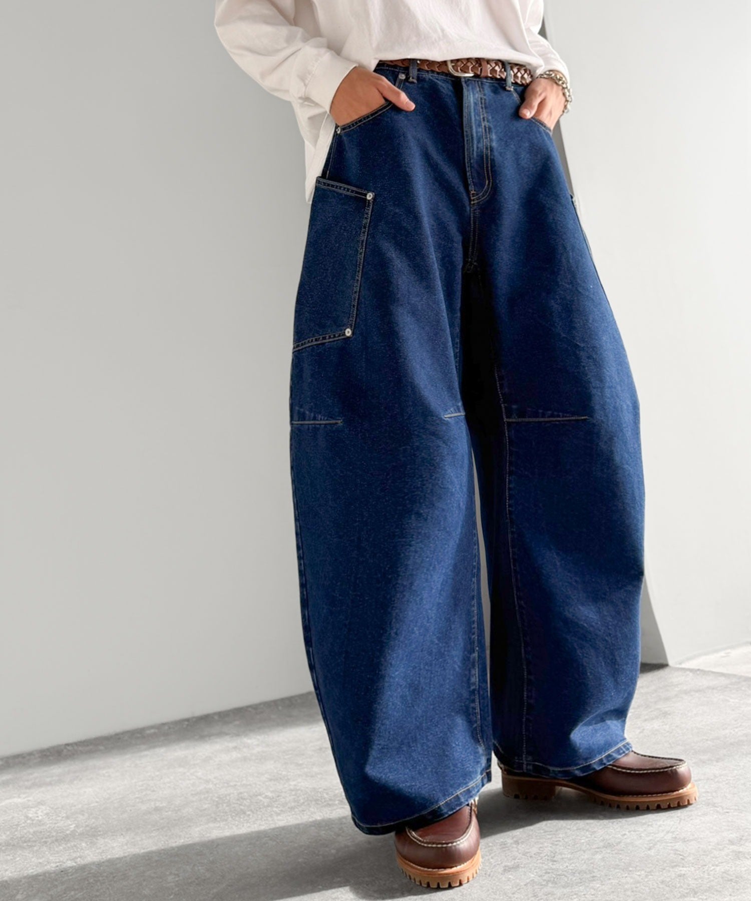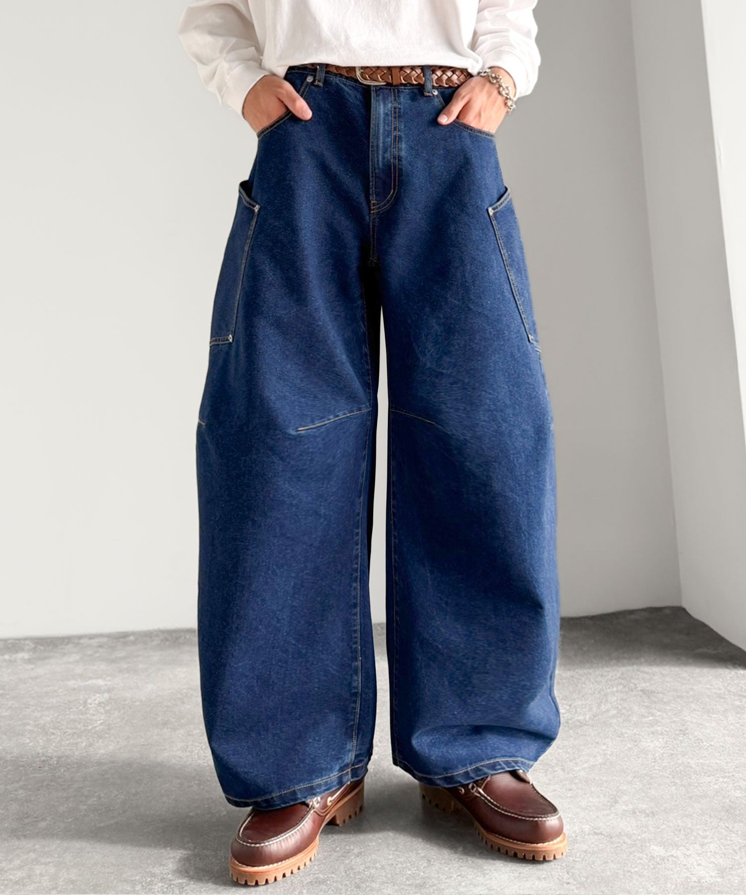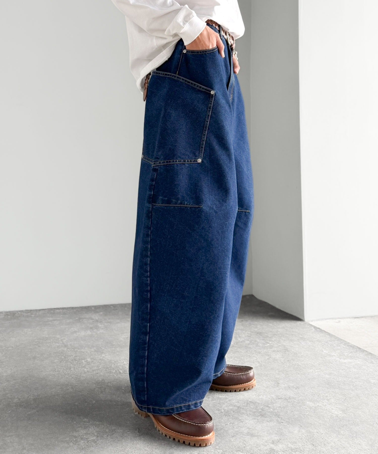 10.5ozのデニムを使用したワイドバルーンカーブパンツ。