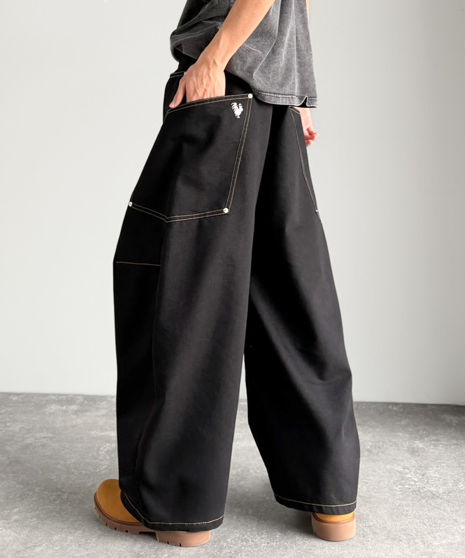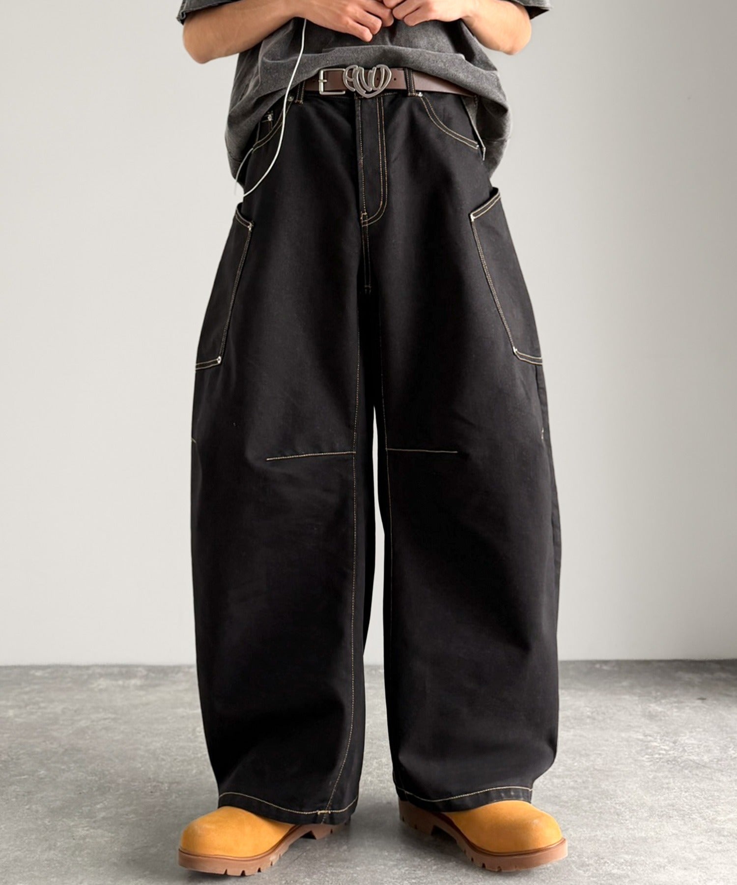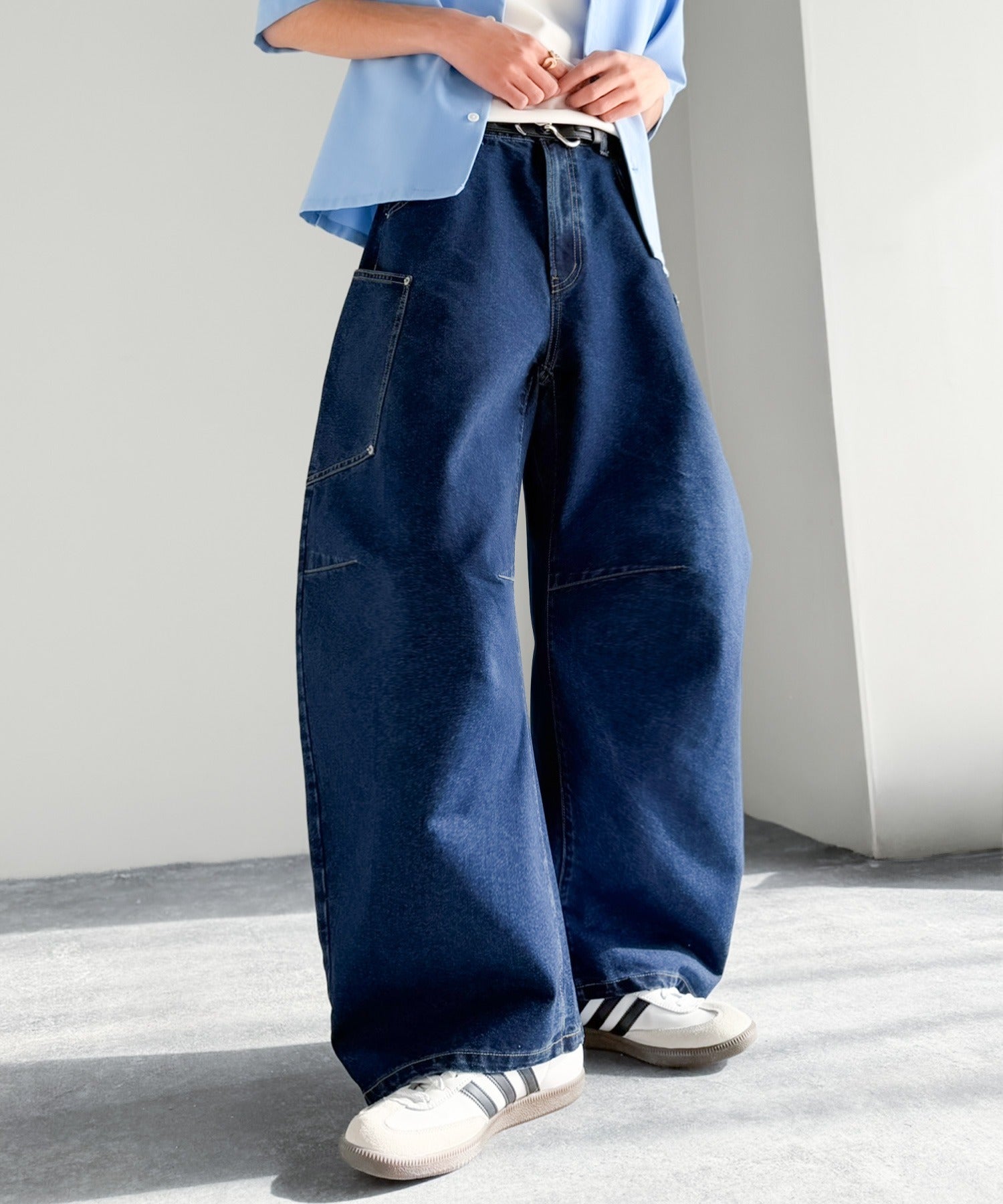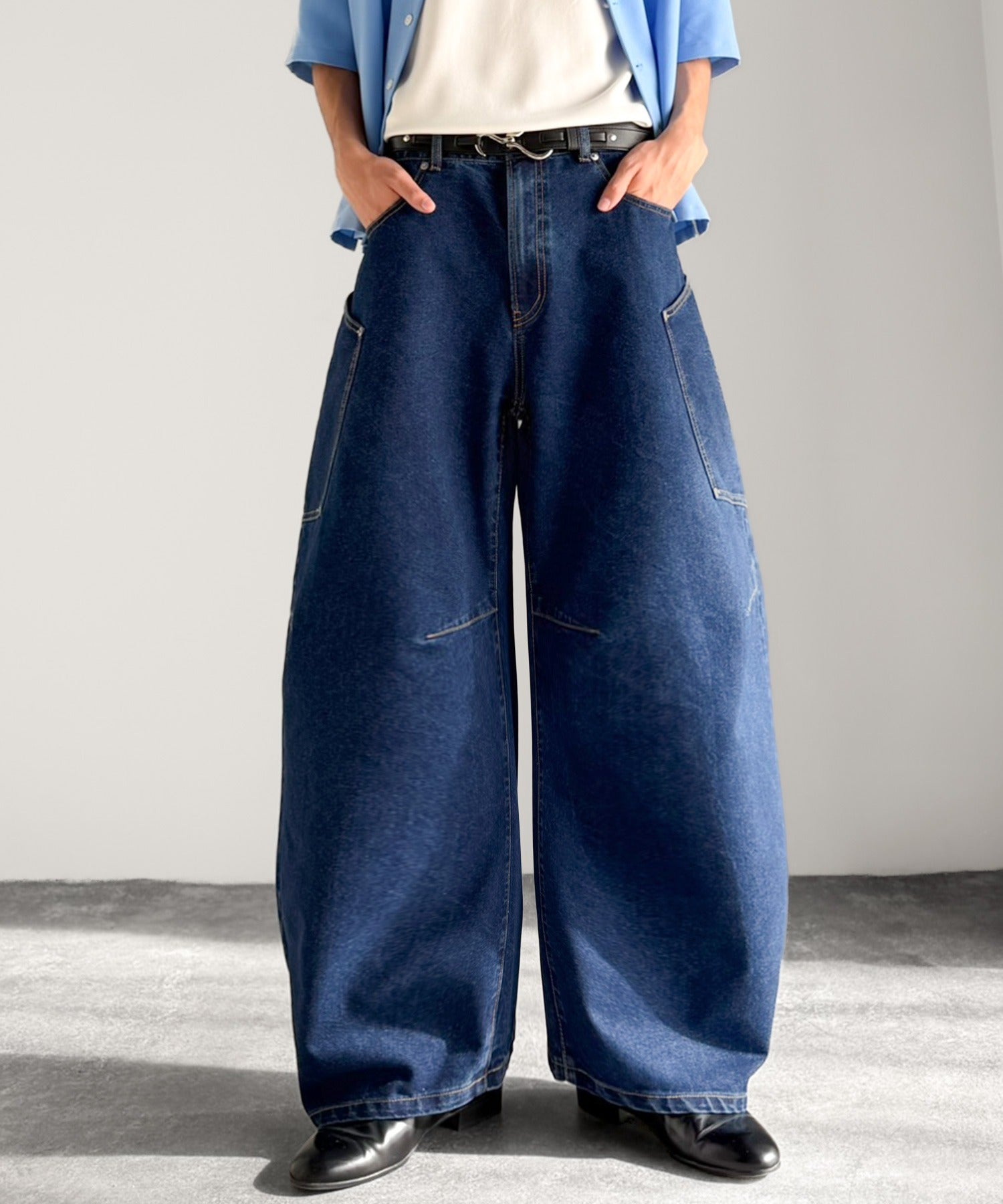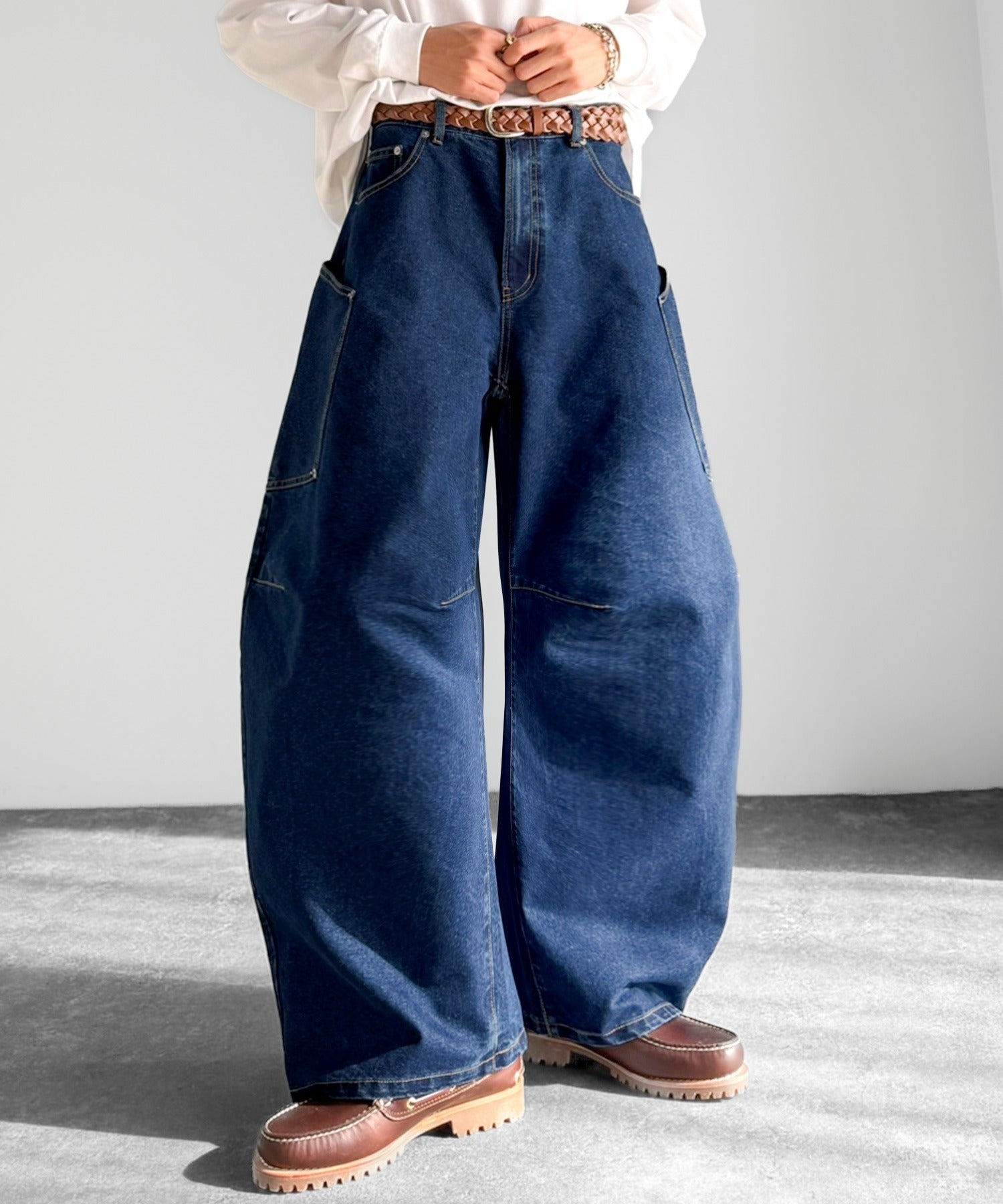 10.5ozのデニムを使用したワイドバルーンカーブパンツ。