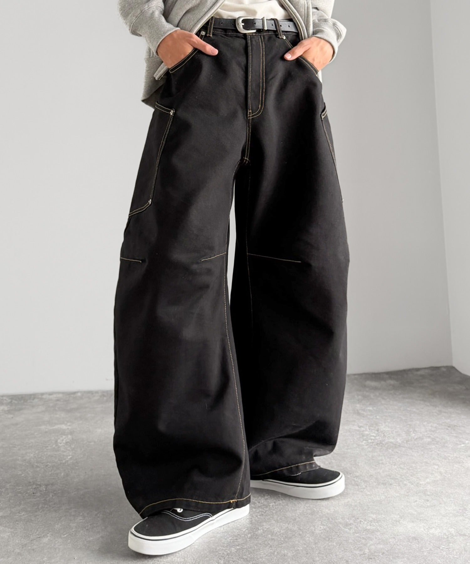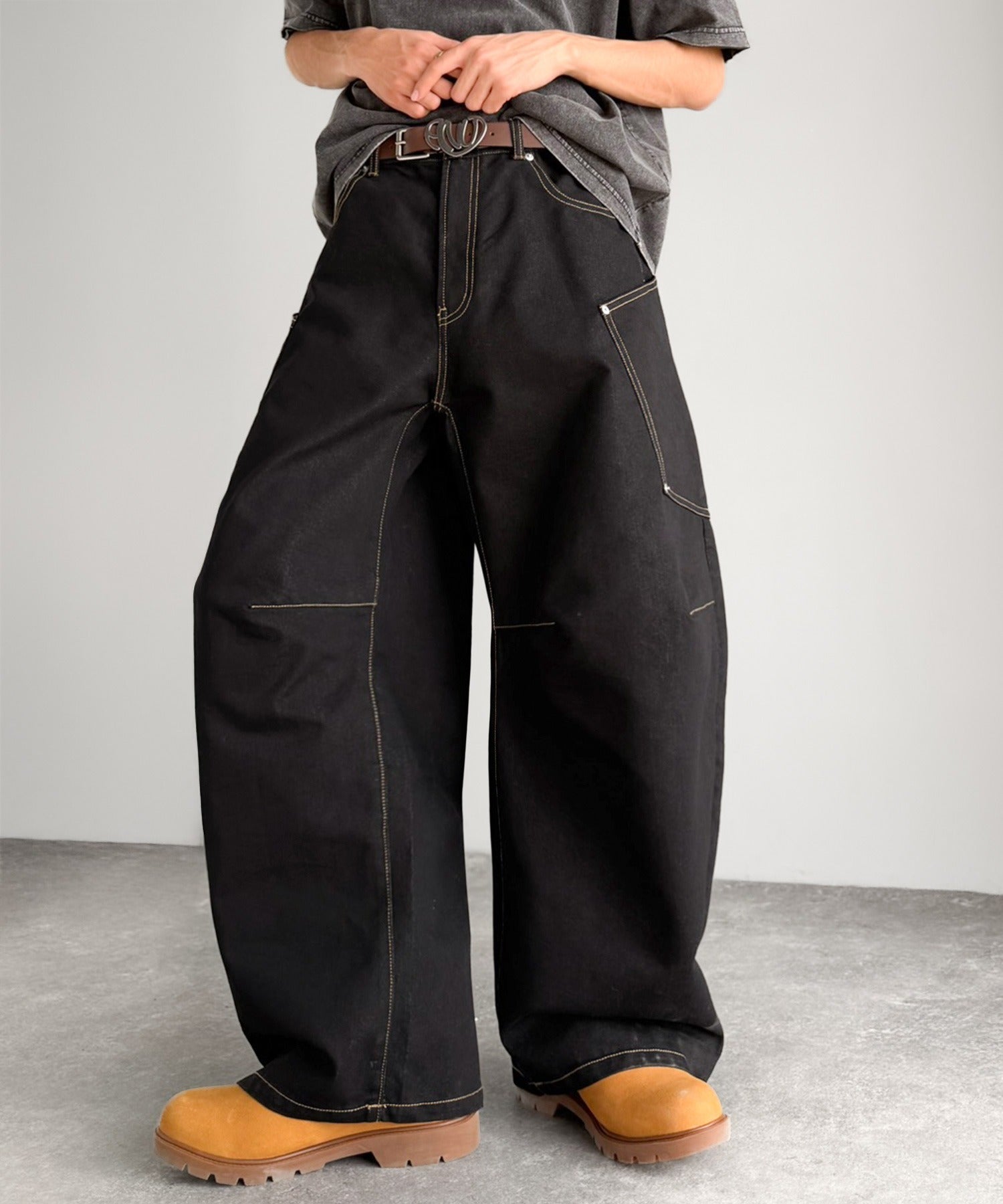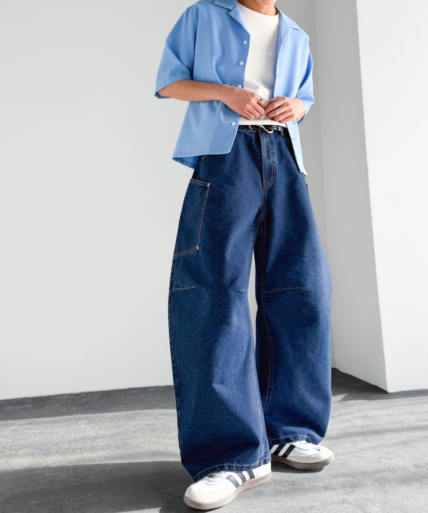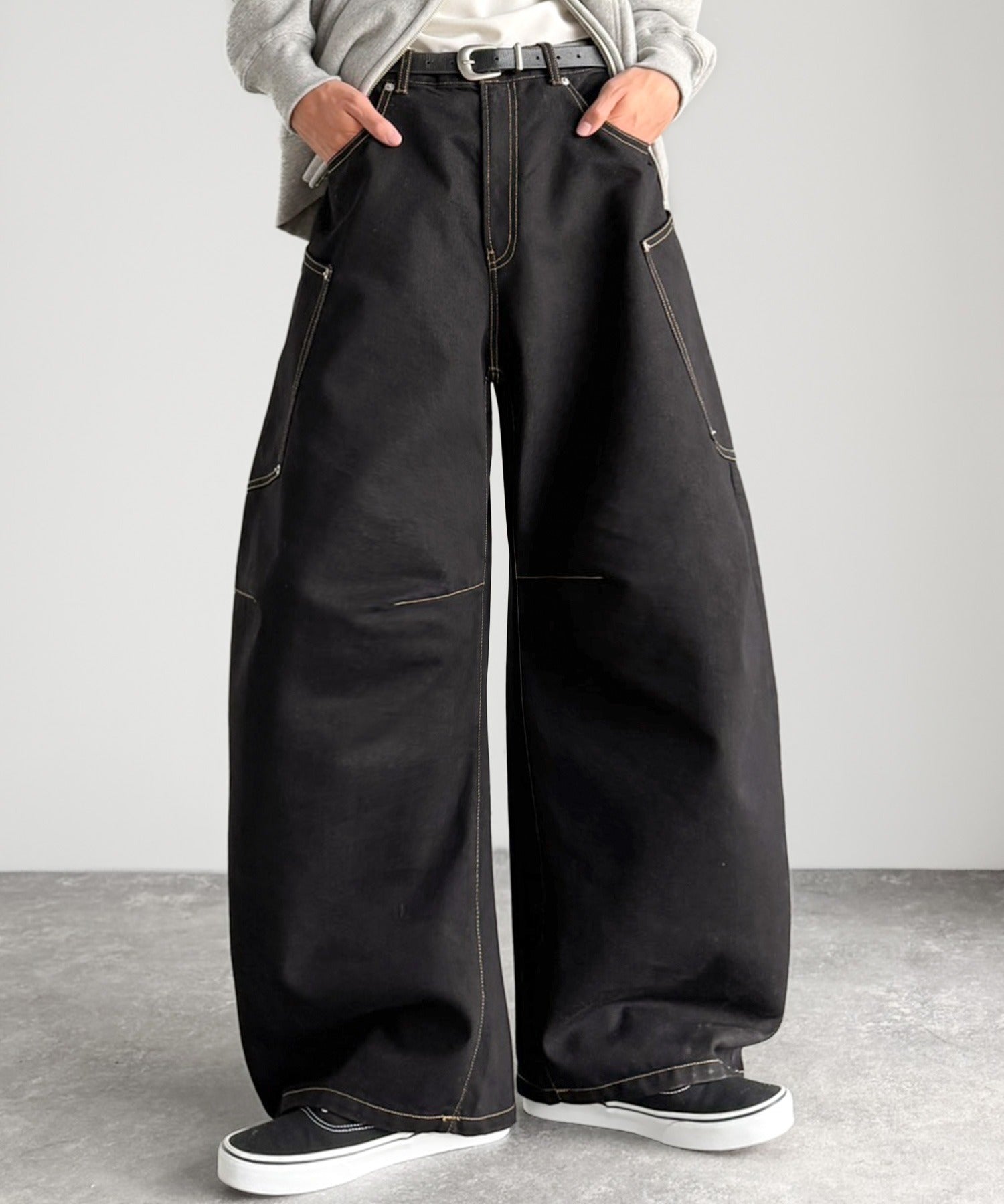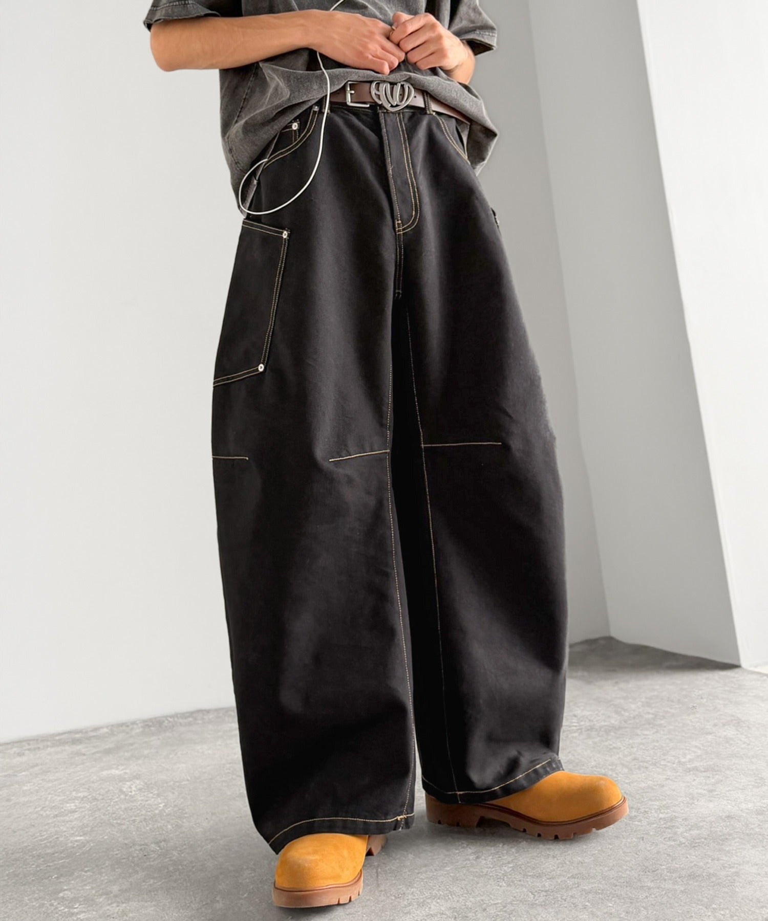 10.5ozのデニムを使用したワイドバルーンカーブパンツ。