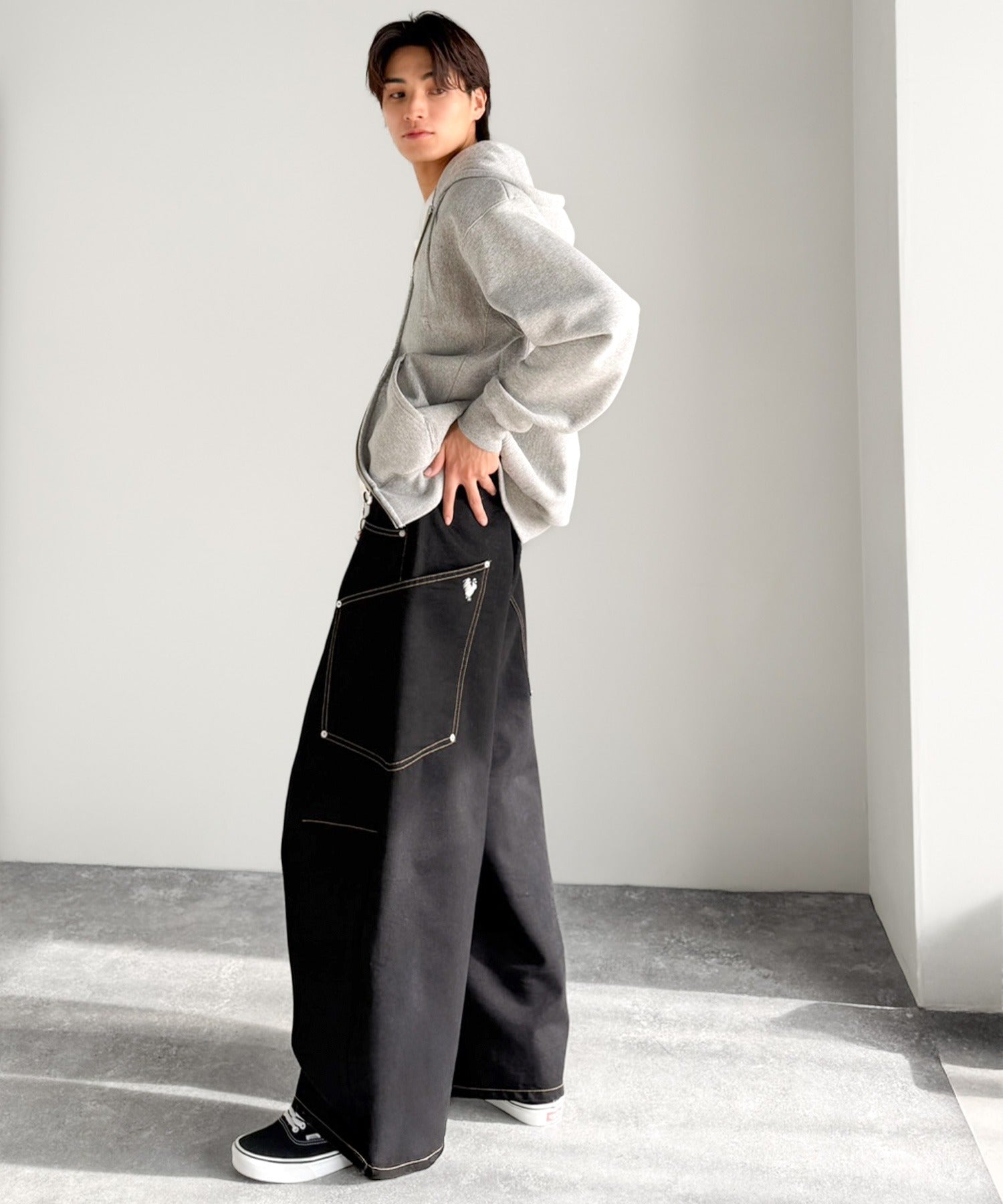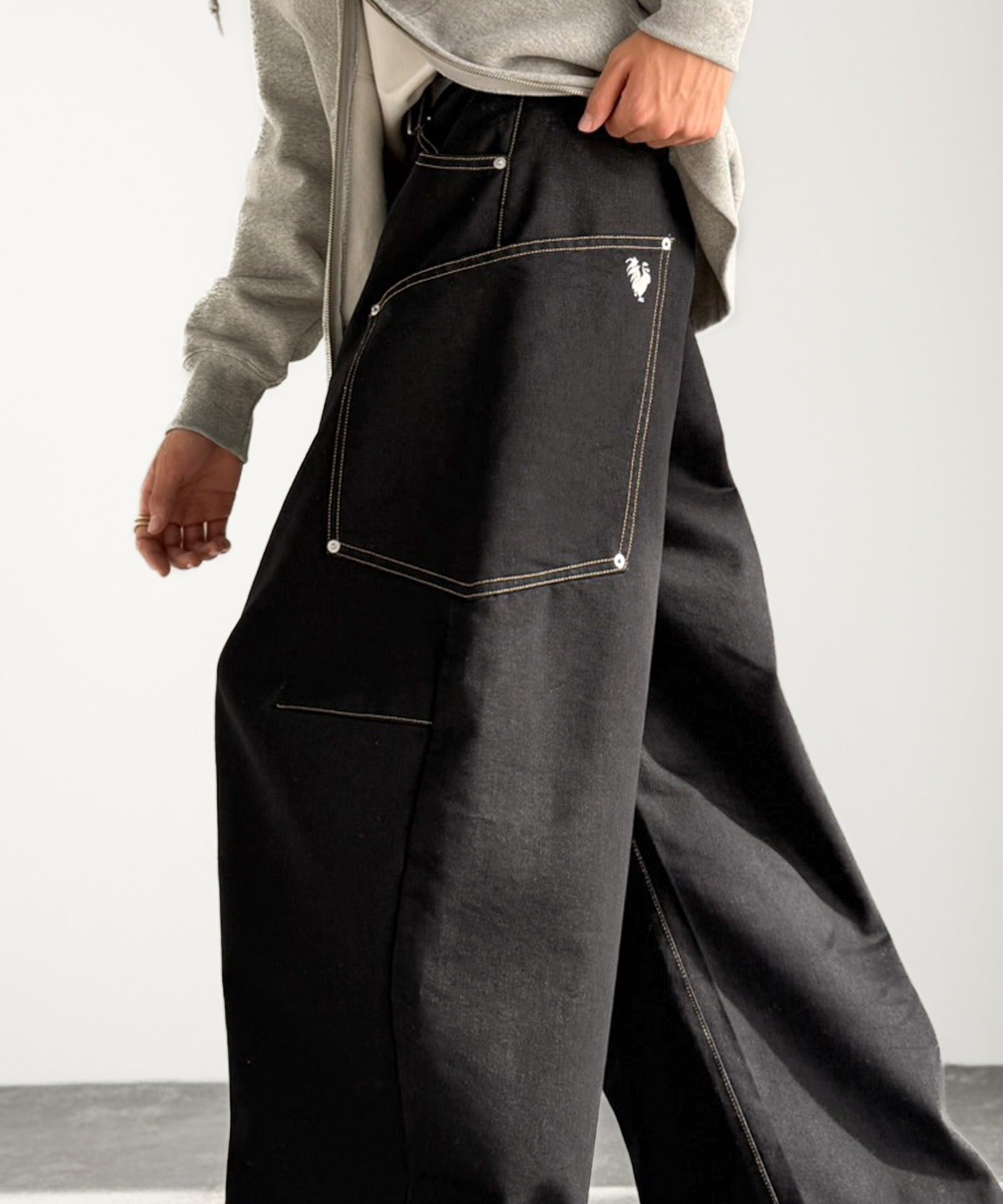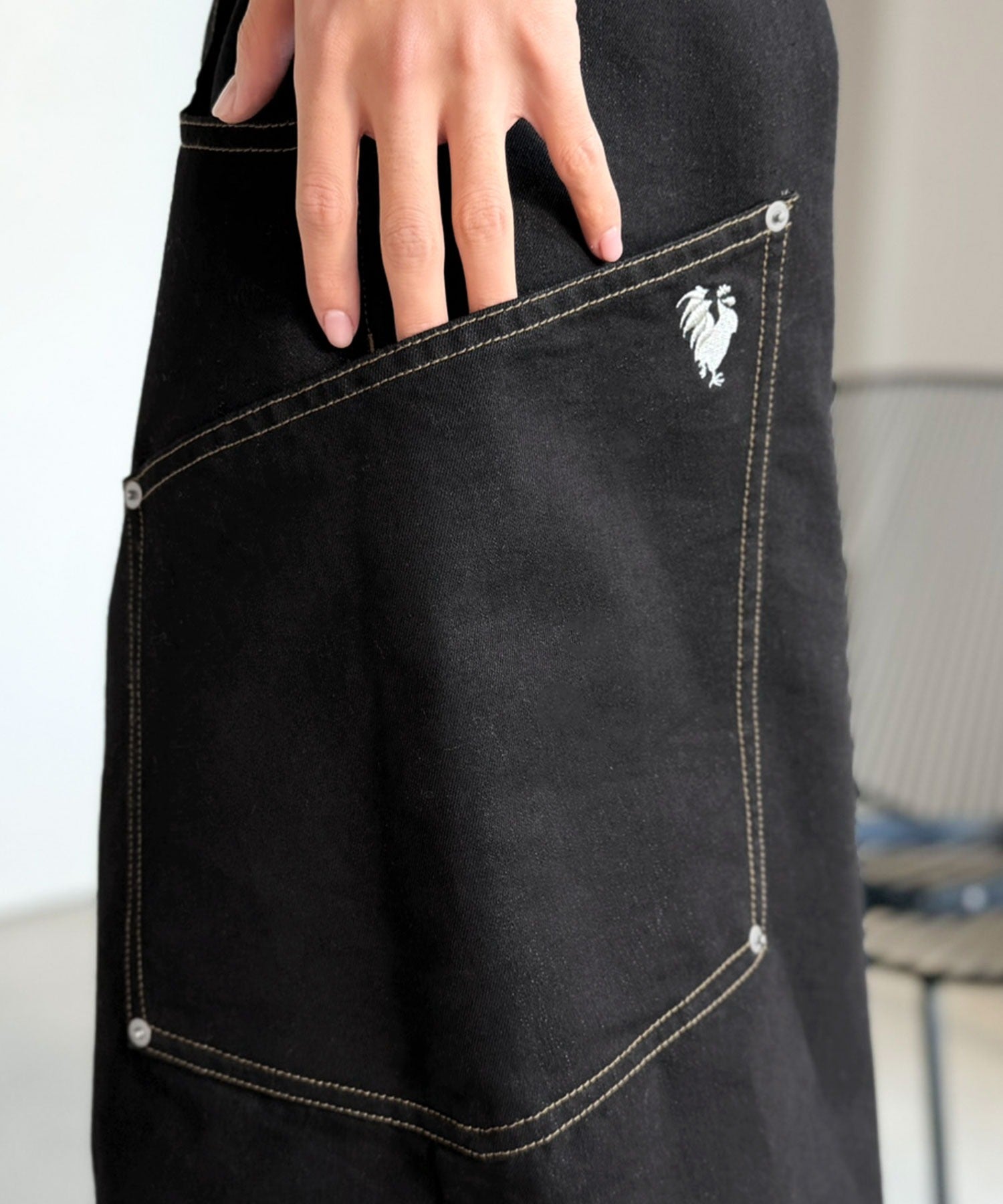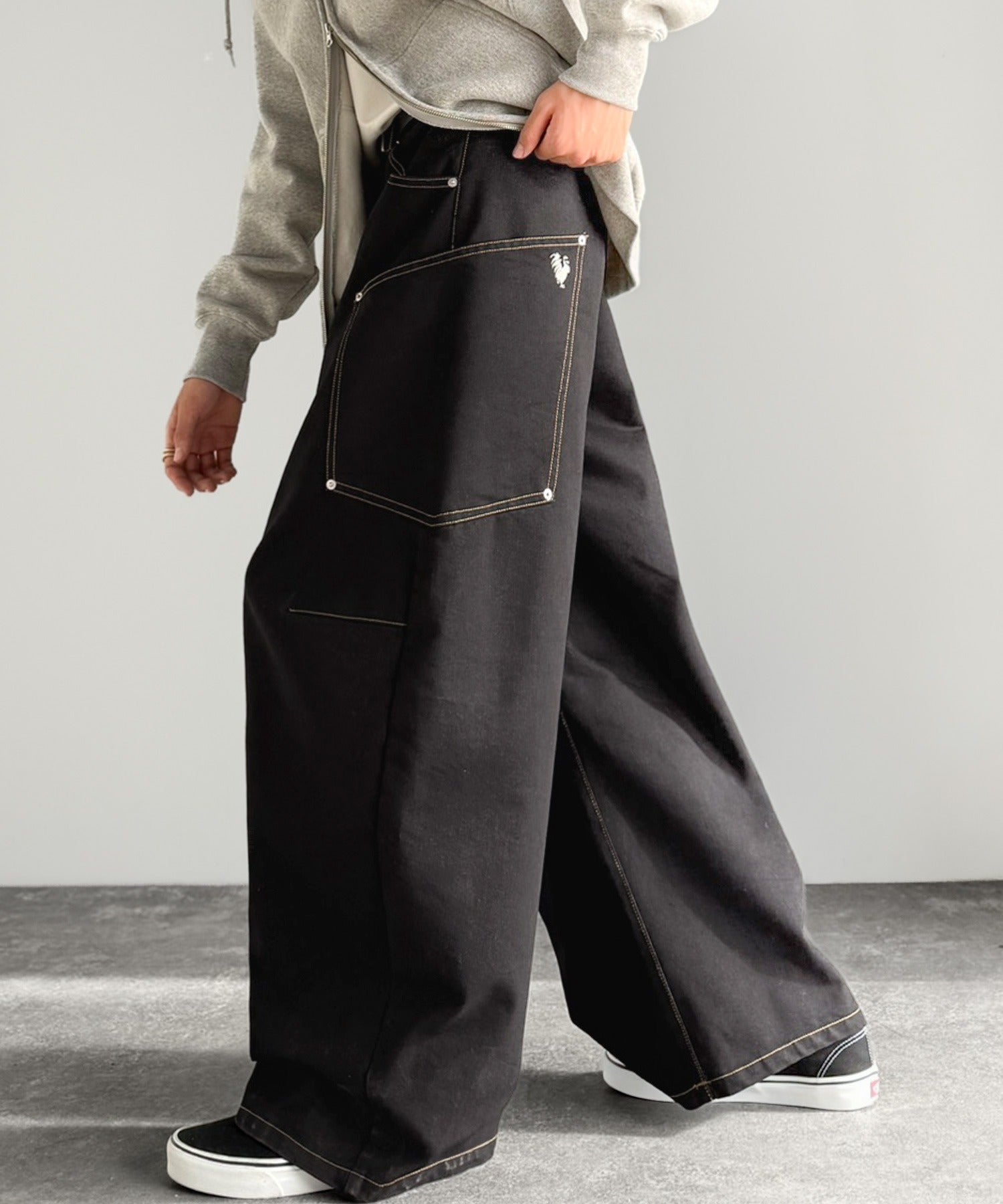 存在感のあるサイドビッグポケットと刺繍が目を惹く。