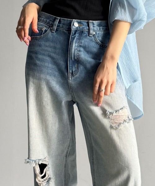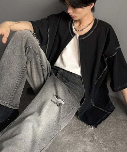 《メンズもレディースもお揃いで着れちゃう、2トーンブリーチ切り替えダメージデニム》