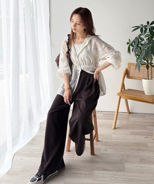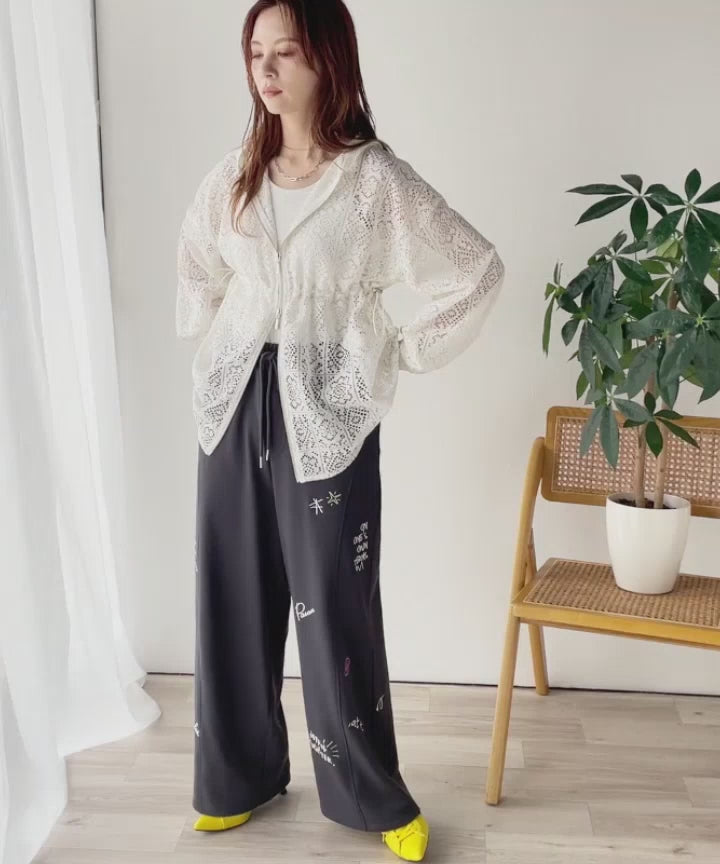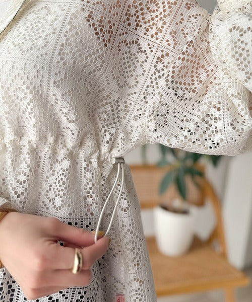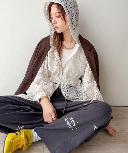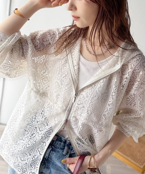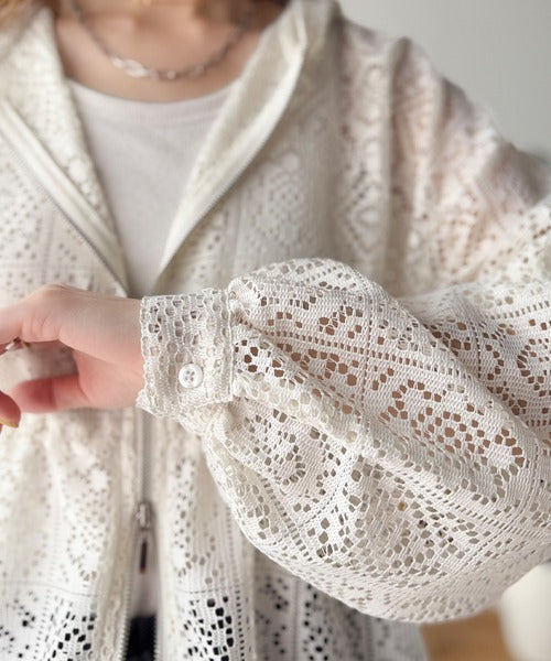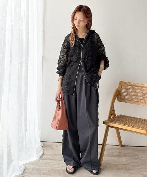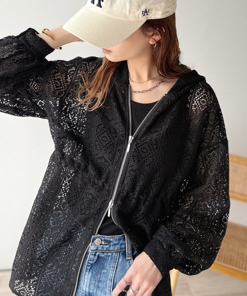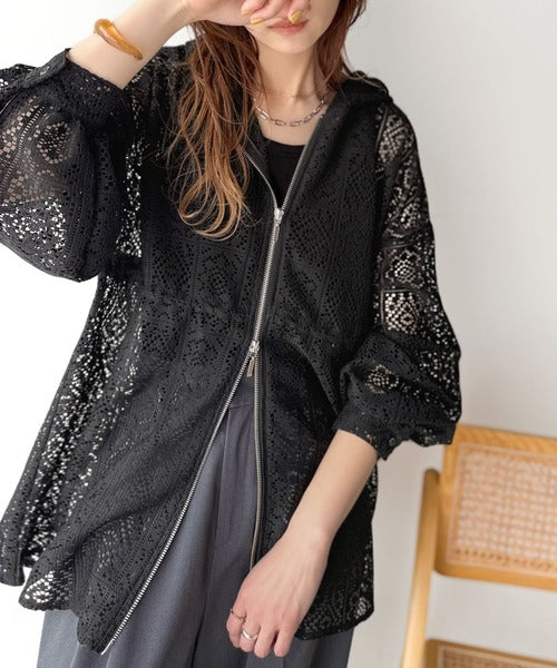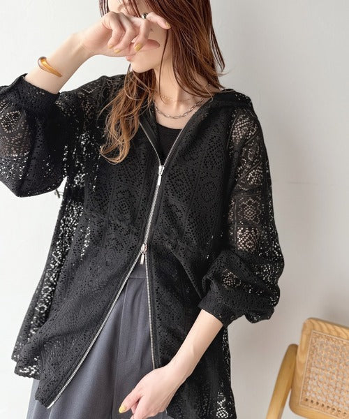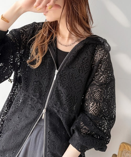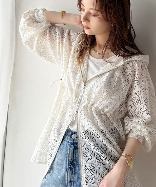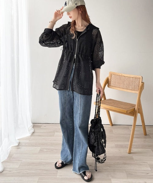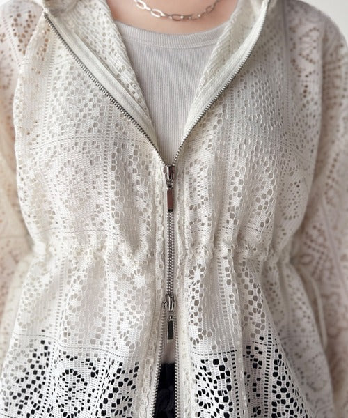 ジップを閉めてドロスト絞るとペプラム風になり一枚で存在感のあるレースパーカー♪