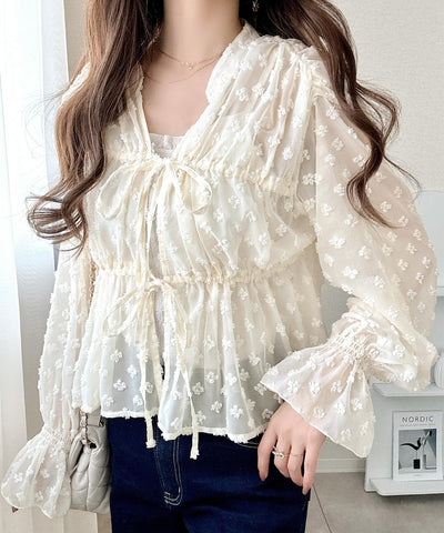 フロントの垂らしたリボンと袖を捲ってぽわんとした袖がアクセント。