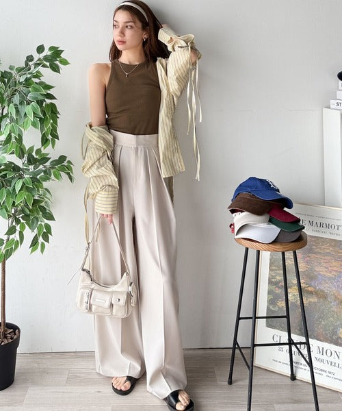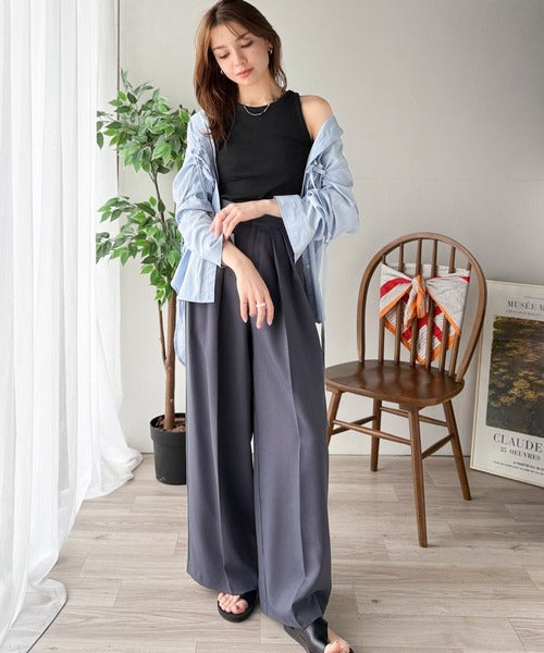 ボトムスには流行のワイドパンツを合わせて、フィット感とリラックス感を両立させたコーデに。