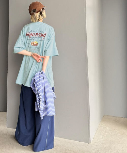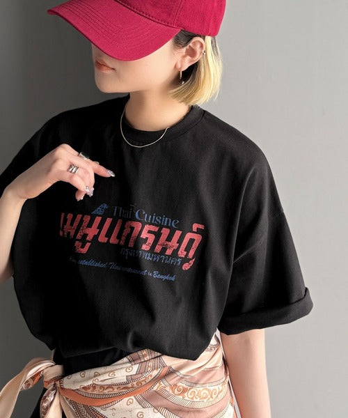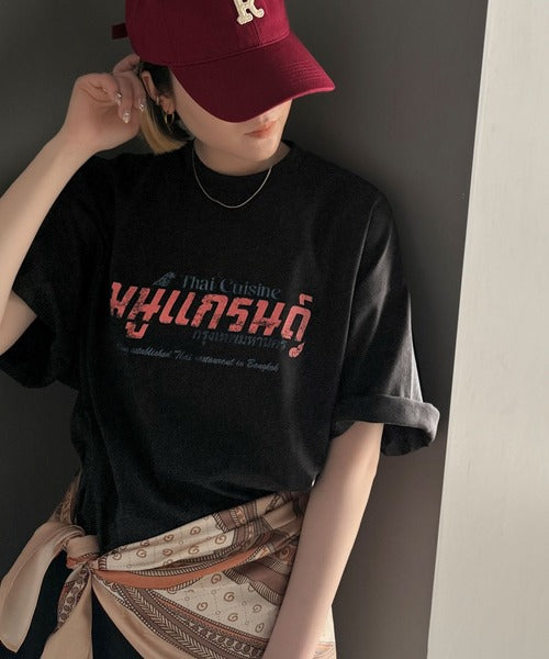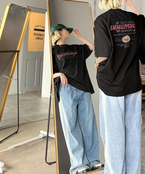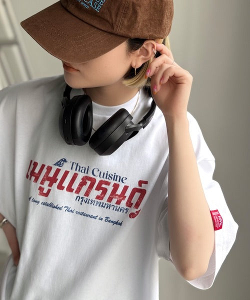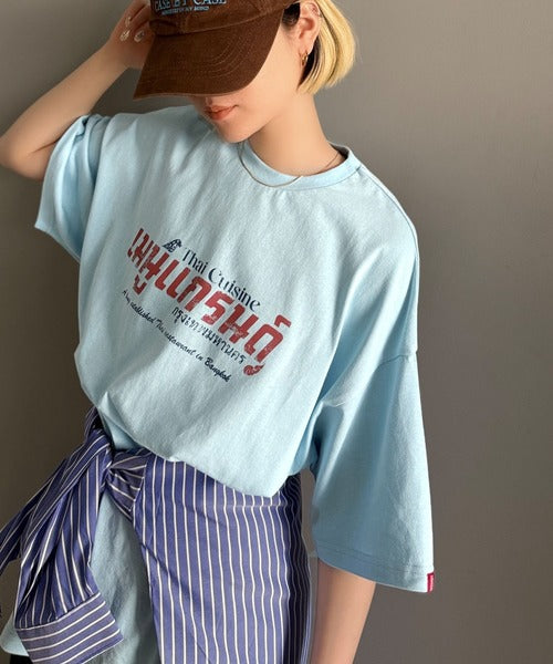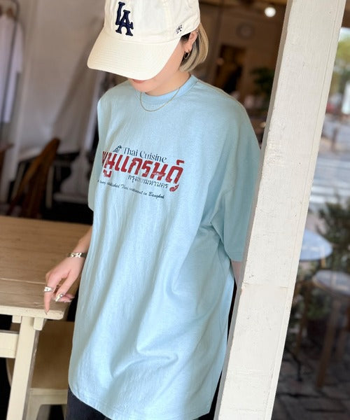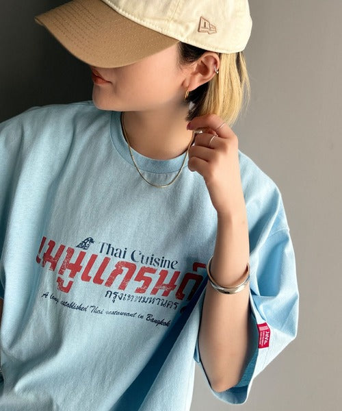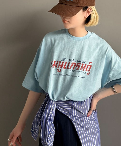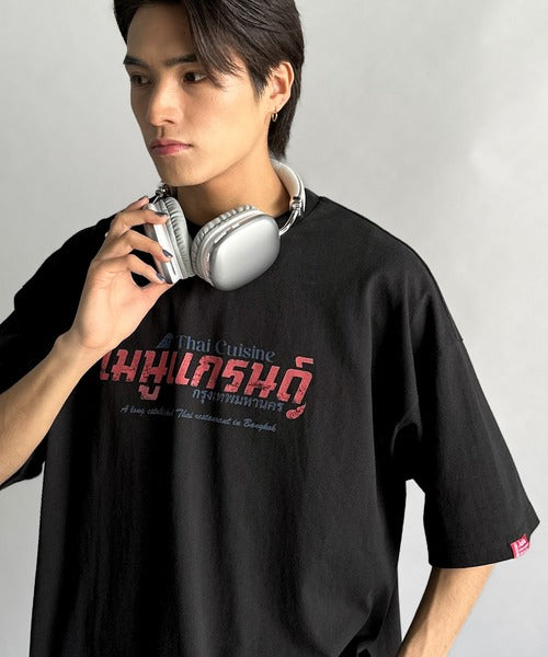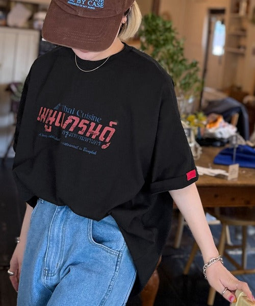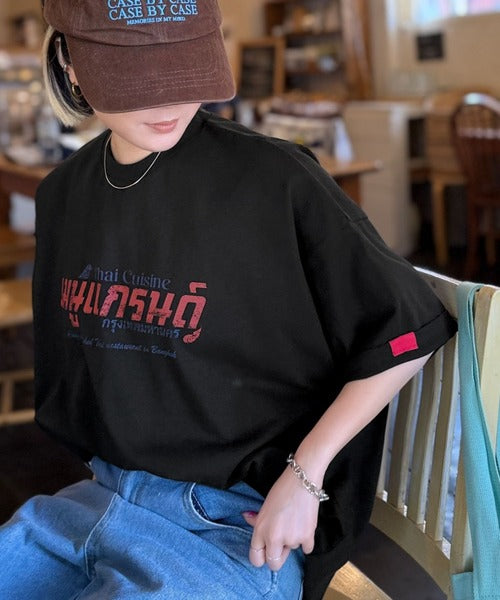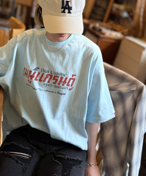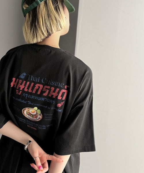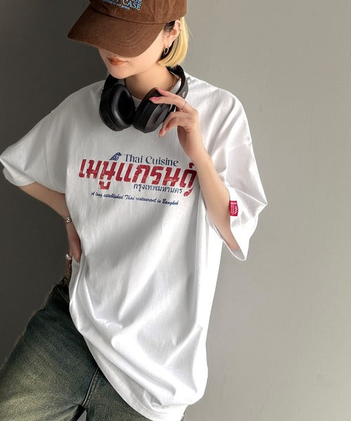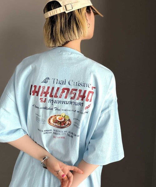 《JaVaジャバコラボ》お洒落見え確定。綿100%タイ料理メニュー風プリントルーズフィットTシャツ(オーバーサイズ) jv1029127