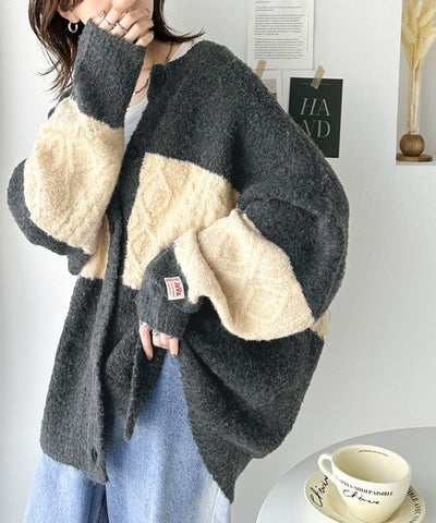 オーバーサイズのゆったりシルエットとケーブル編みの配色が入ったデザインがポイント。