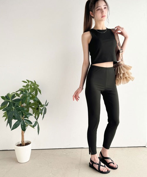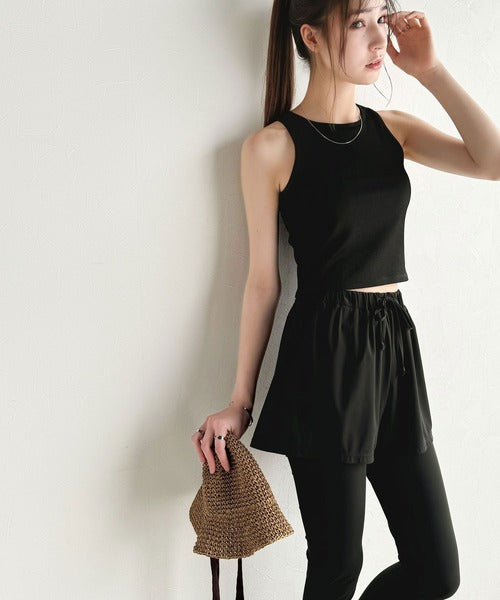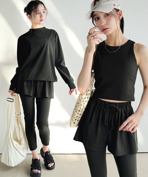 【素材】 【トップス】ナイロン78%、ポリウレタン22% 【インナートップス】表地:ポリエステル98%、ポリウレタン2% 裏地:ポリエステル100% 【インナーパンツ】表地:ナイロン78%、ポリウレタン22%、裏地:ポリエステル100% 【ショートパンツ】ナイロン78%、ポリウレタン22% 【レギンス】ナイロン78%、ポリウレタン22%