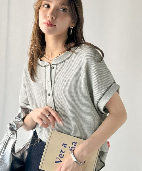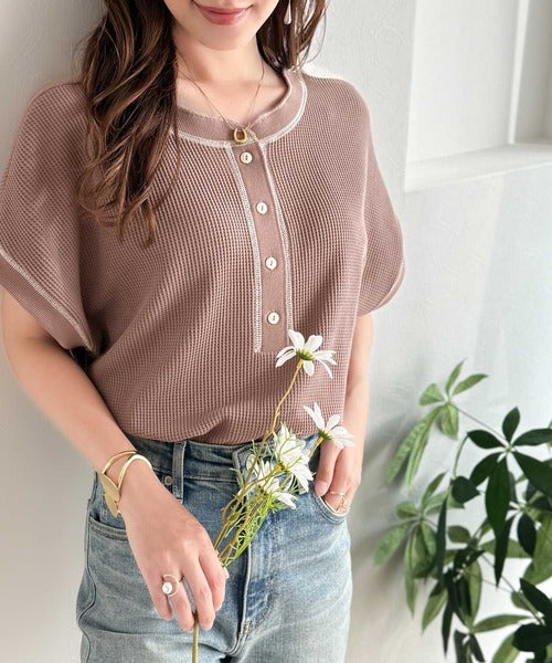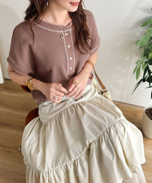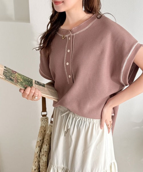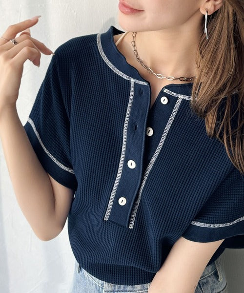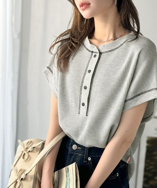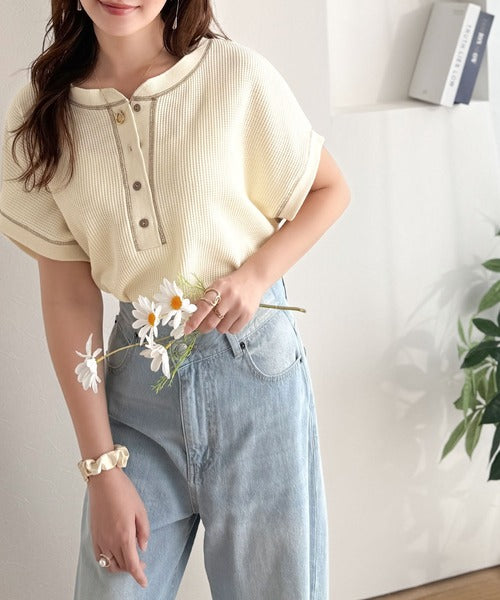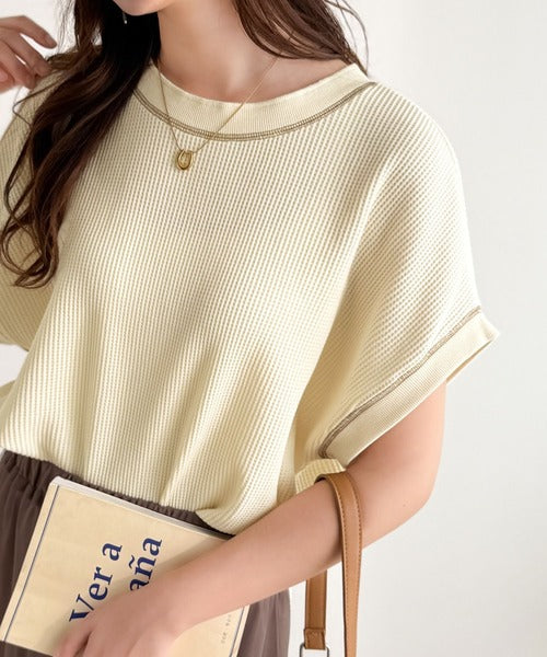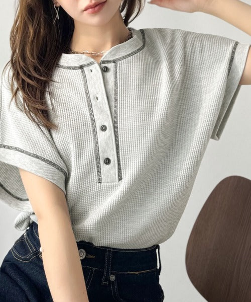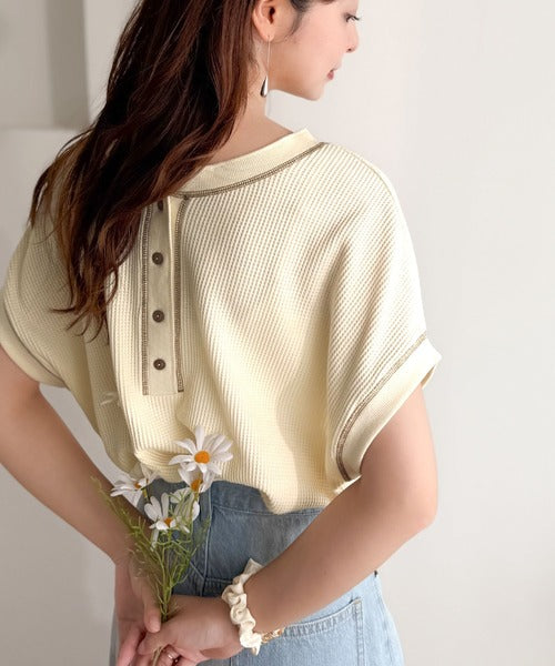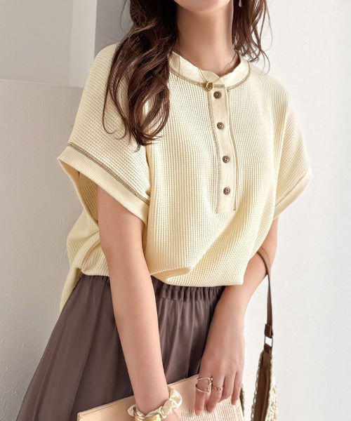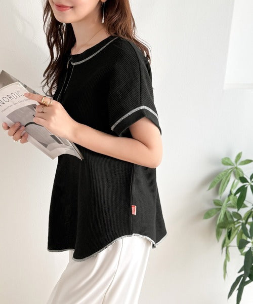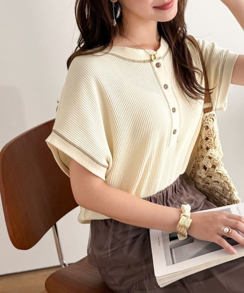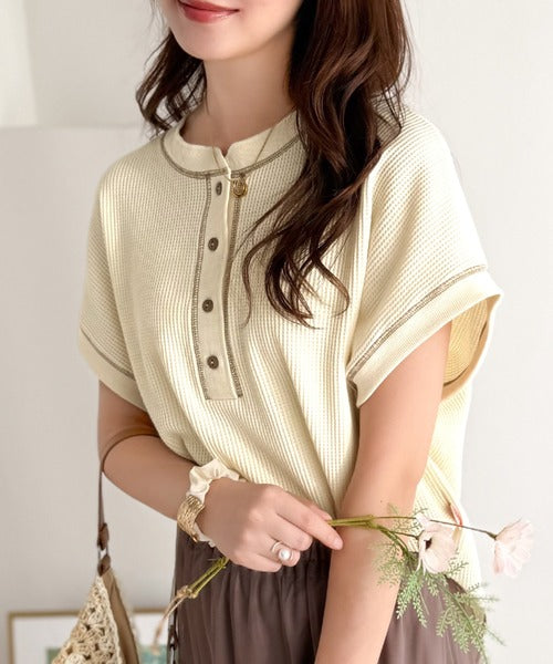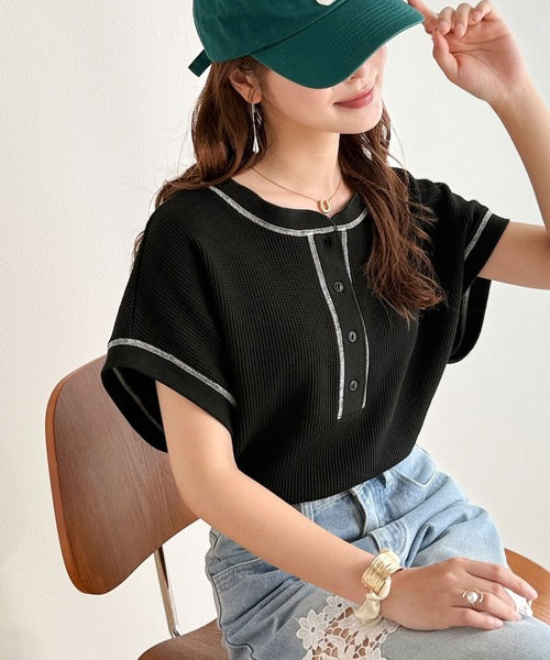 《JaVaジャバコラボ》“お洒落感アップ”は配色でつくる。前後2wayヘンリーネック配色ステッチフレンチスリーブワッフルカットソー jv1260495