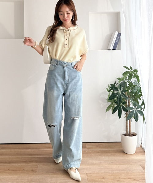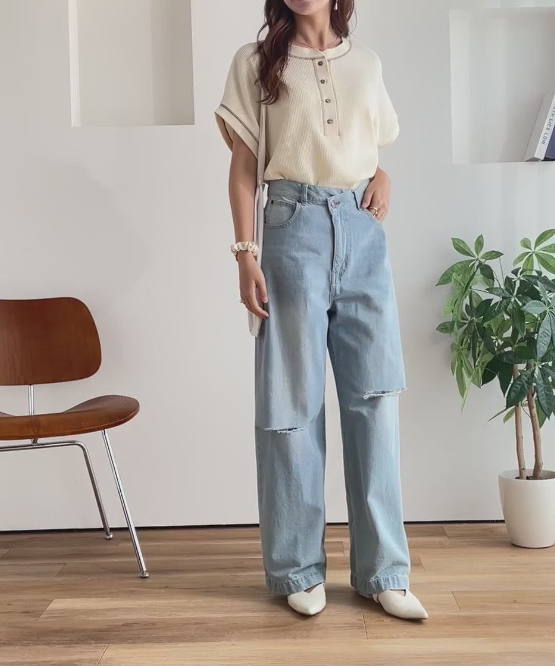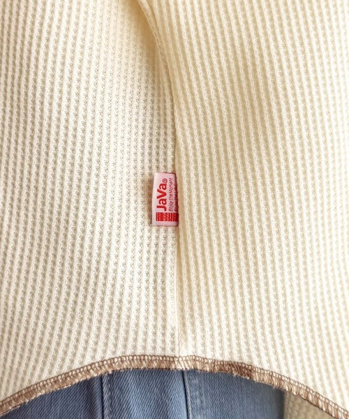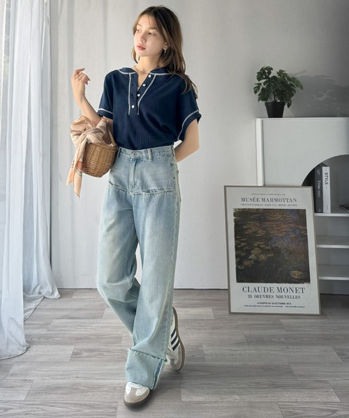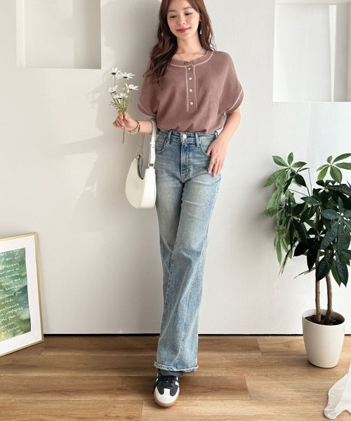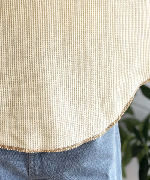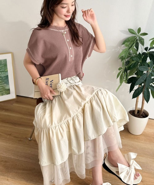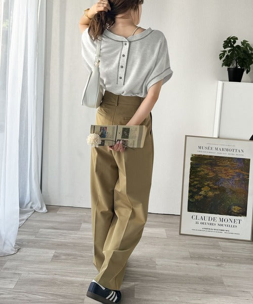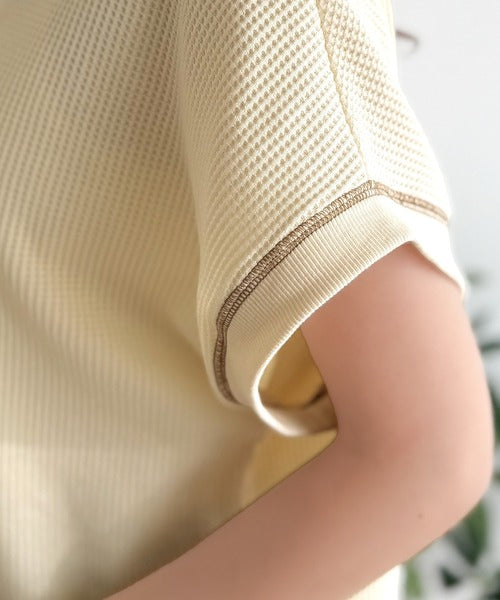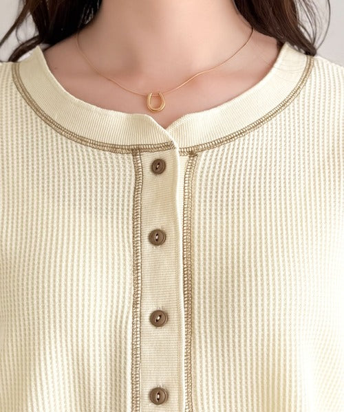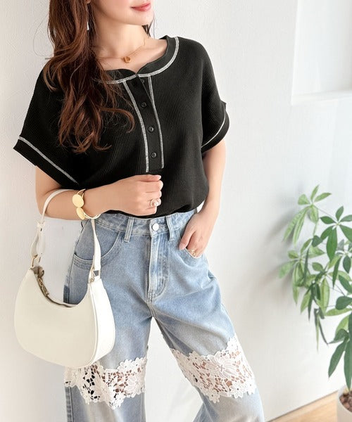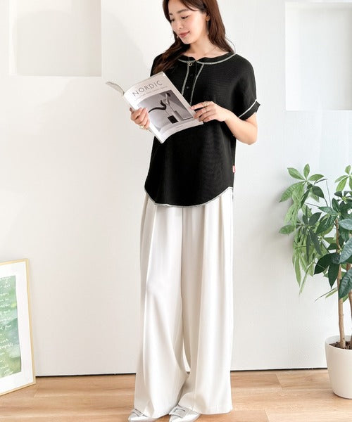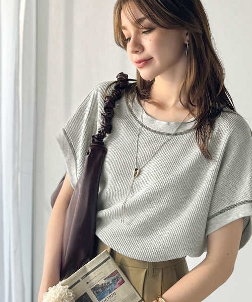 《JaVaジャバコラボ》“お洒落感アップ”は配色でつくる。前後2wayヘンリーネック配色ステッチフレンチスリーブワッフルカットソー jv1260495