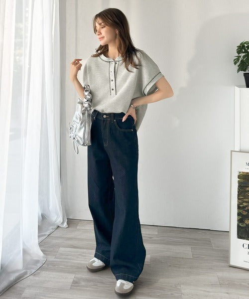 デコルテがきれいに見えるヘンリーネックに、目を惹く配色ステッチ。