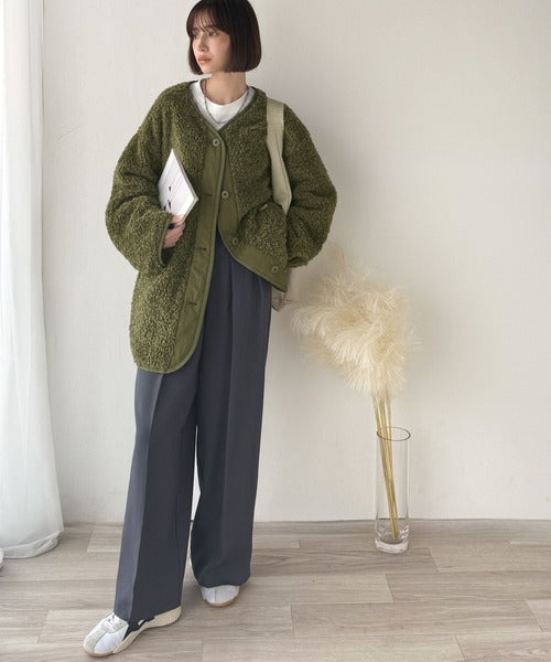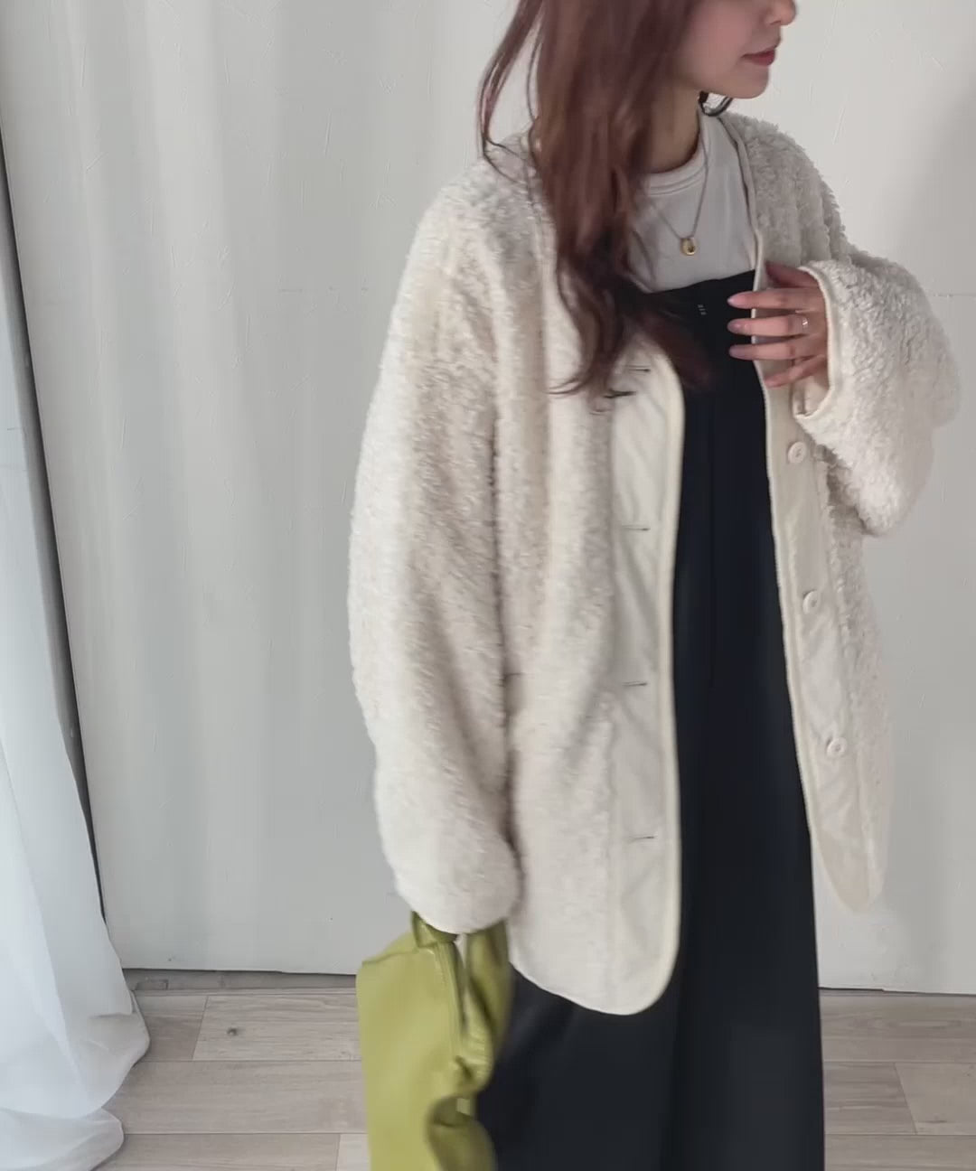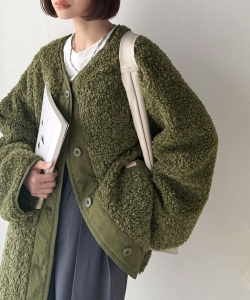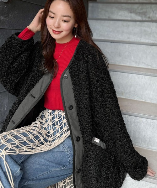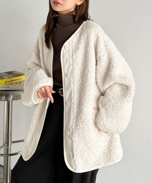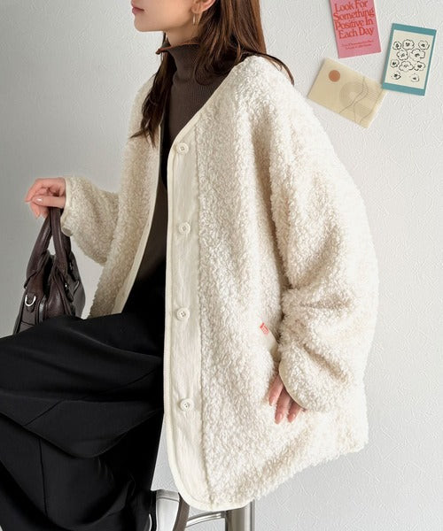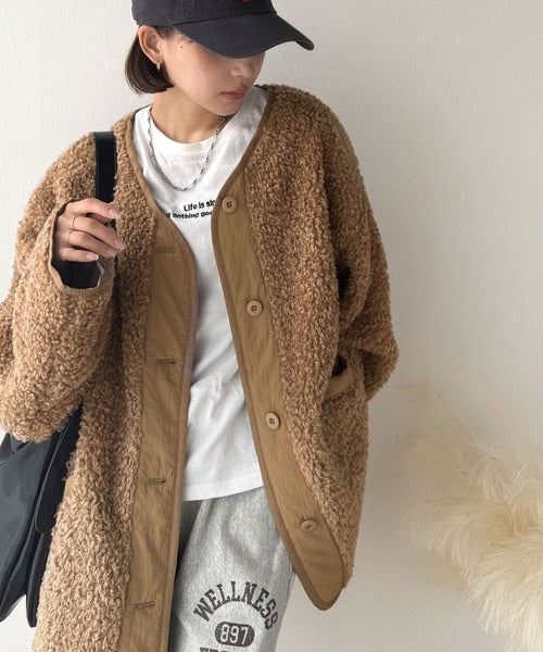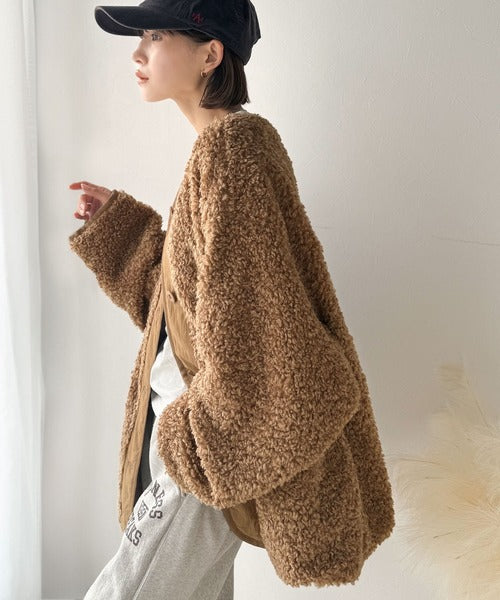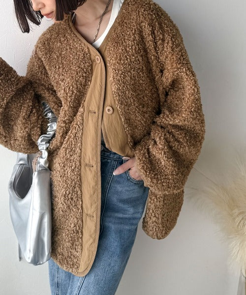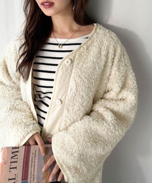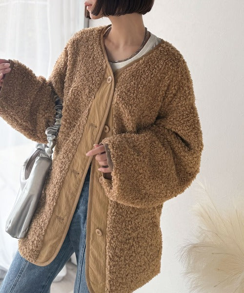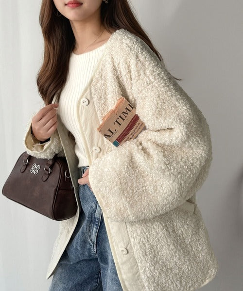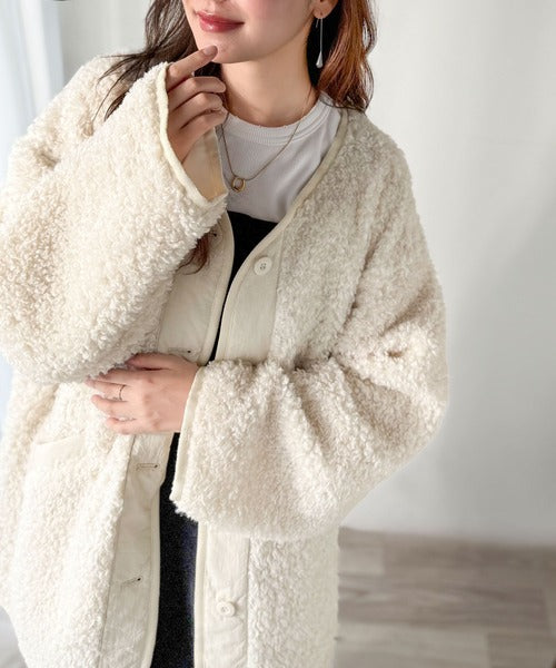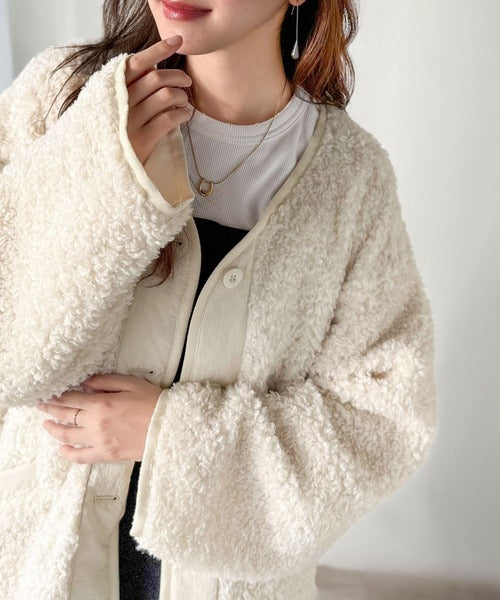 異素材を巧みに切り替えた配色デザインのノーカラーボアジャケット。