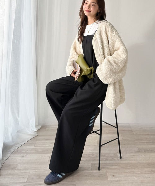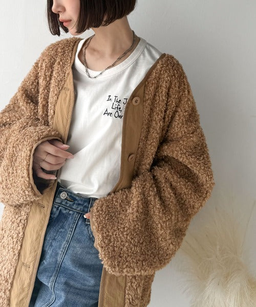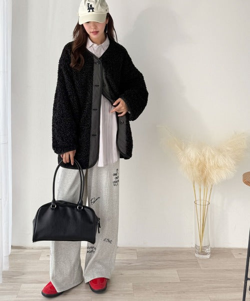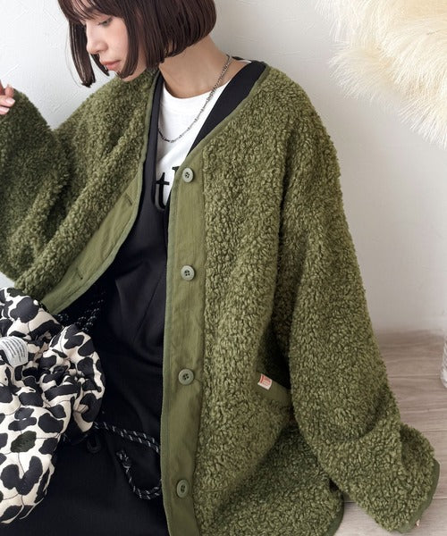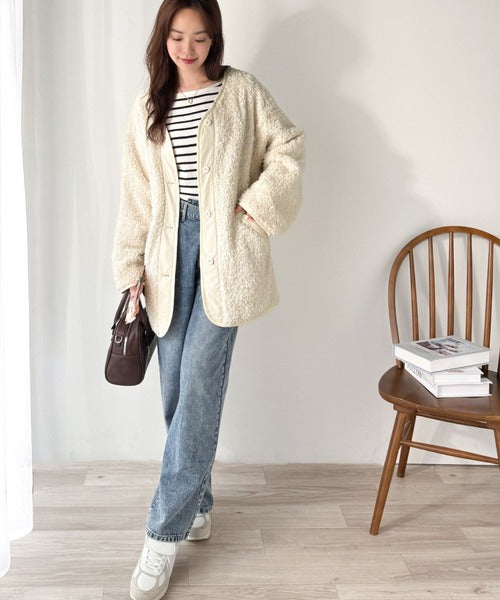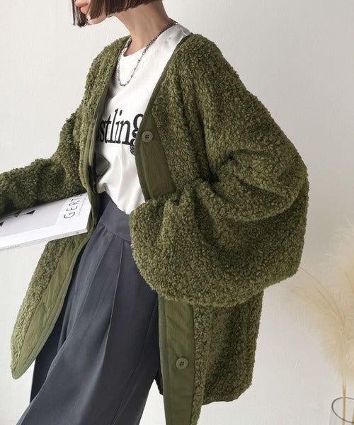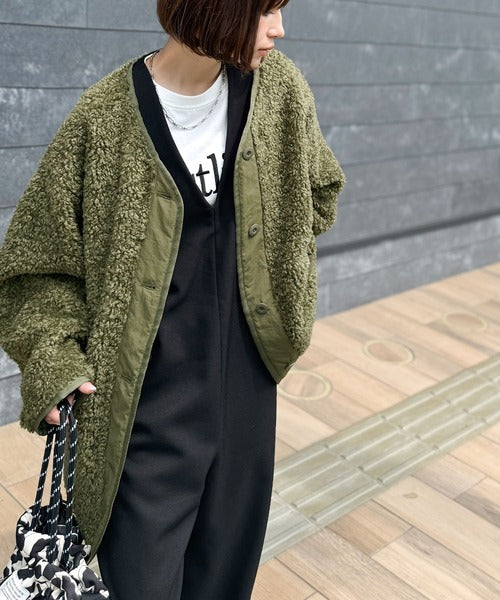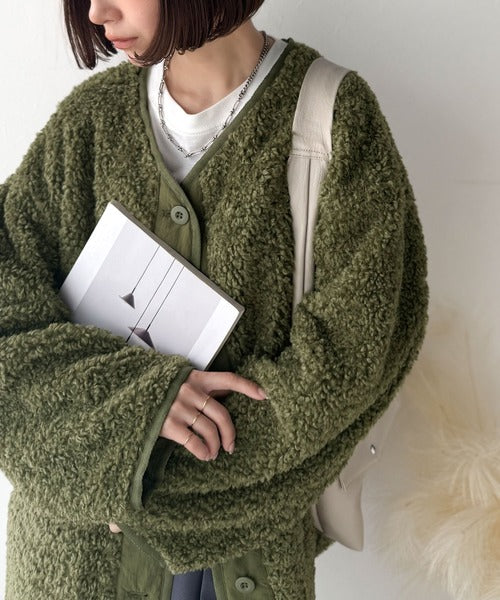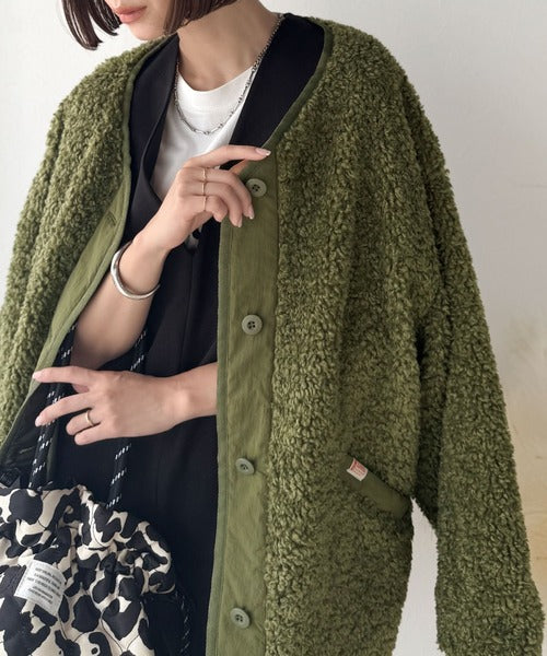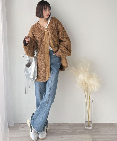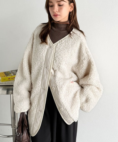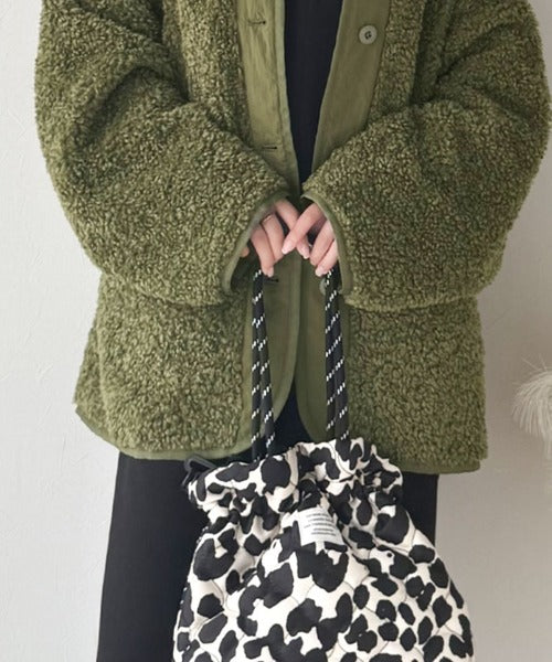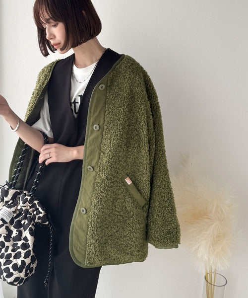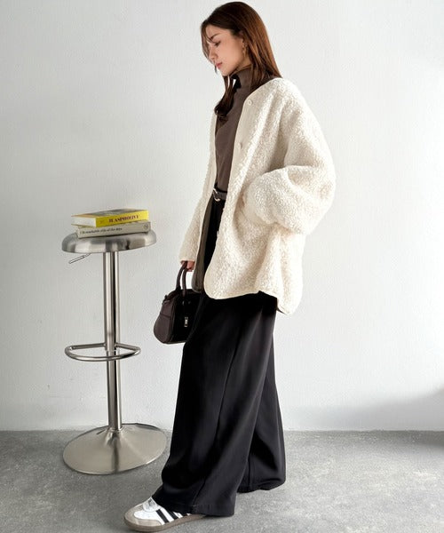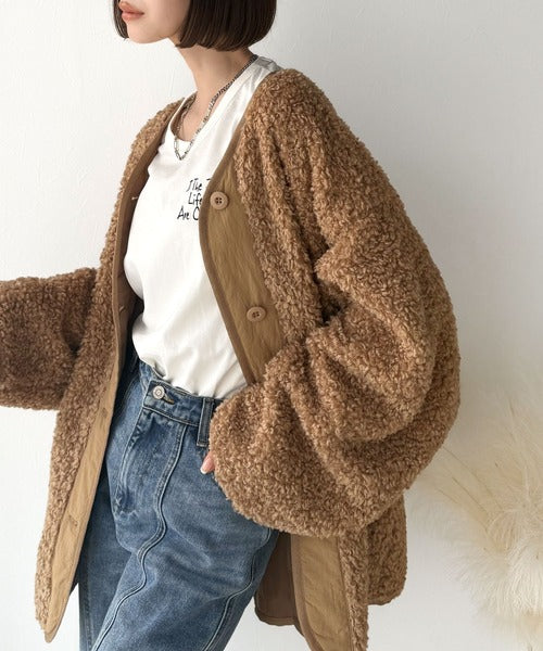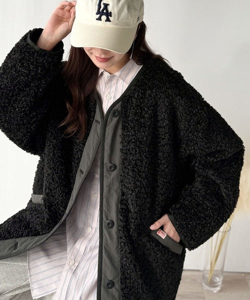 異素材を巧みに切り替えた配色デザインのノーカラーボアジャケット。