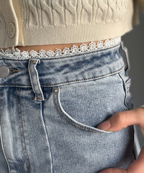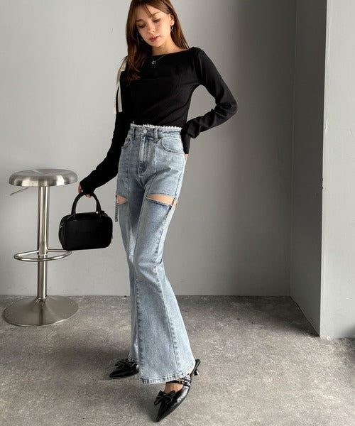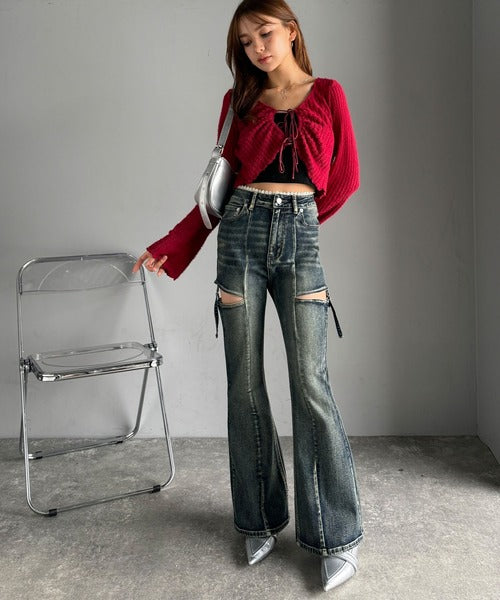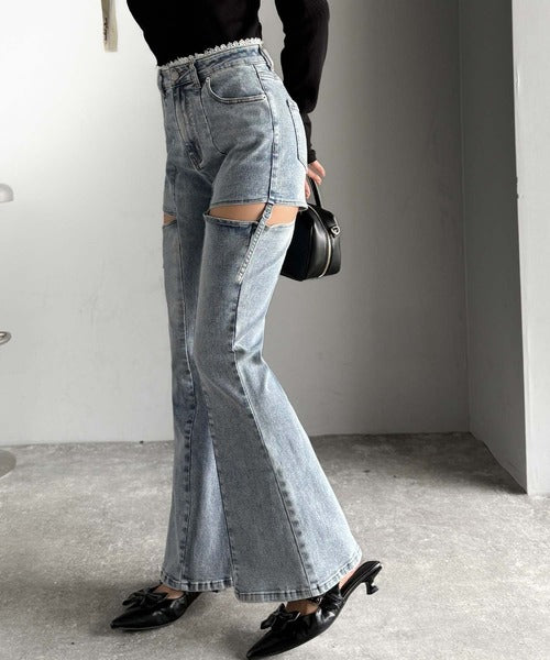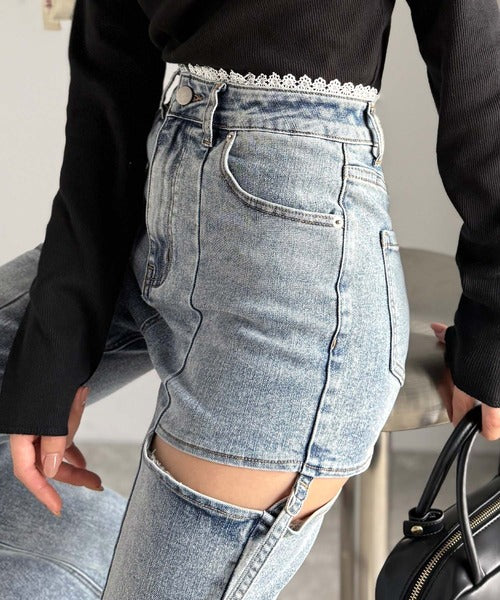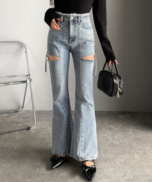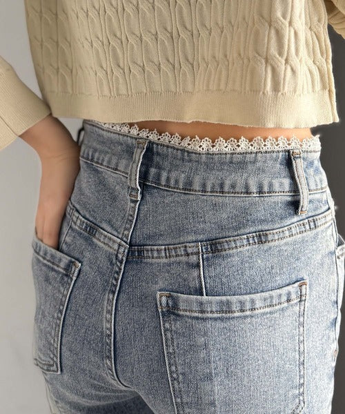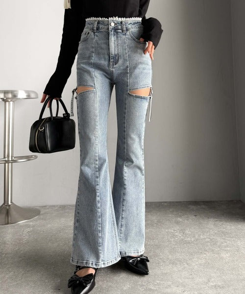 【mily bilet】ヘルシーに肌魅せ美脚。ウエストピコレースカットアウトリボン使いデニムパンツ mi0909018