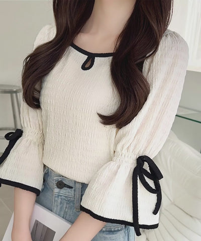 袖キャンディースリーブリボン付きプルオーバーをご紹介します。