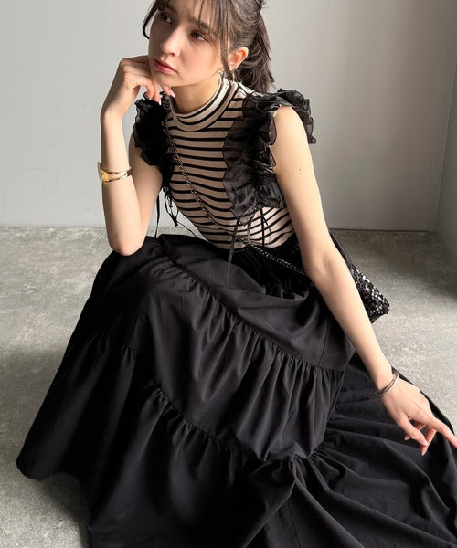 ふんわり広がるティアードスカートのバランスが美しく、脚長効果も◎