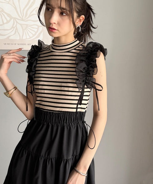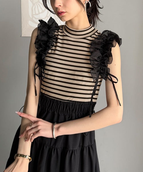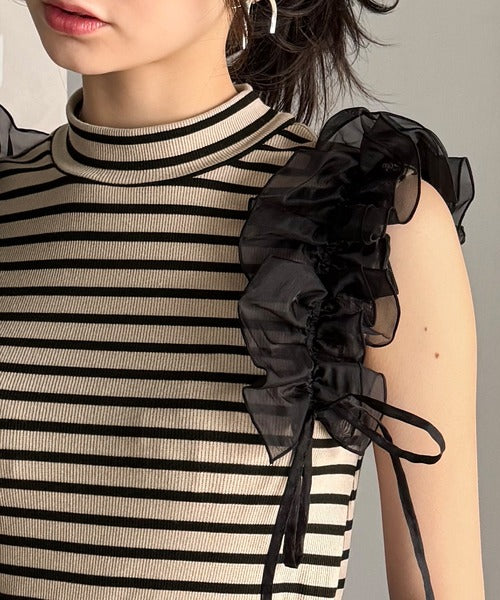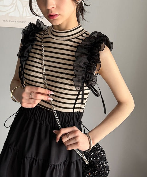 オーガンジー素材のフリルを施した伸縮性のあるリブ生地ニットと、