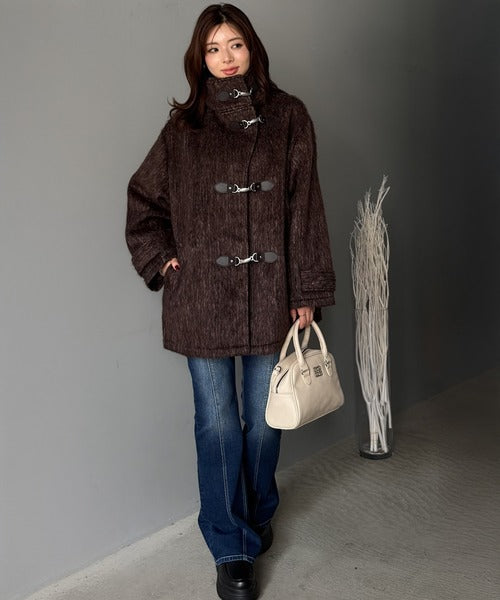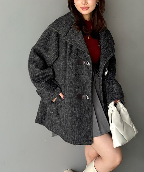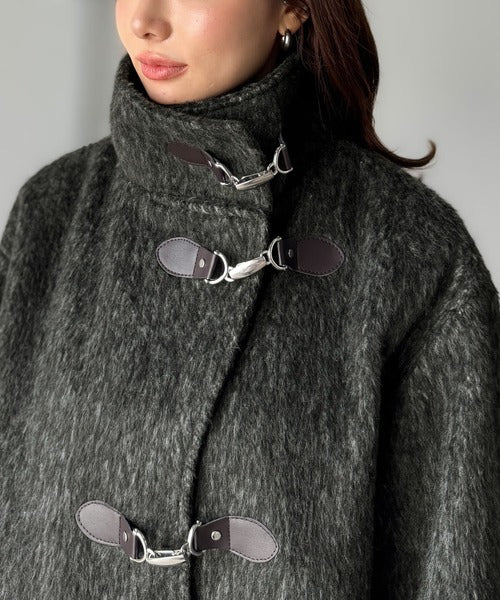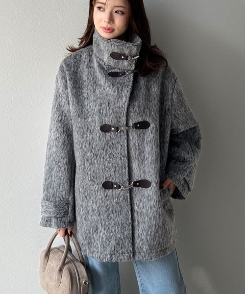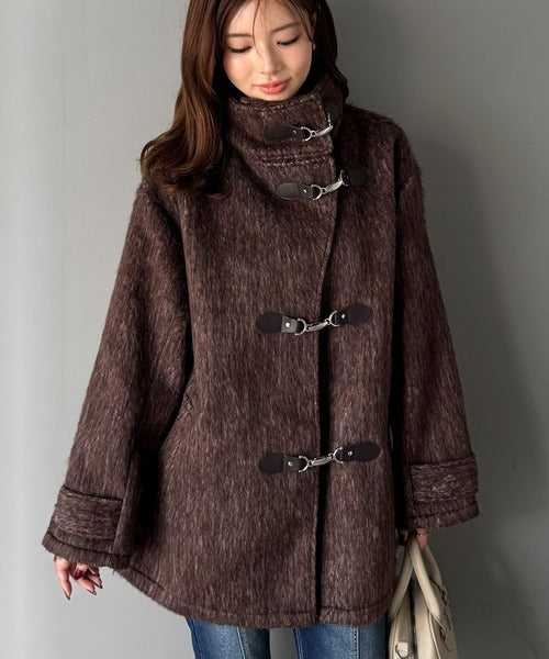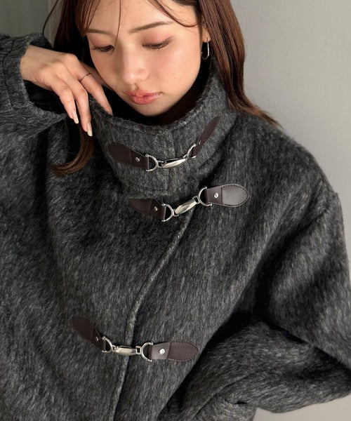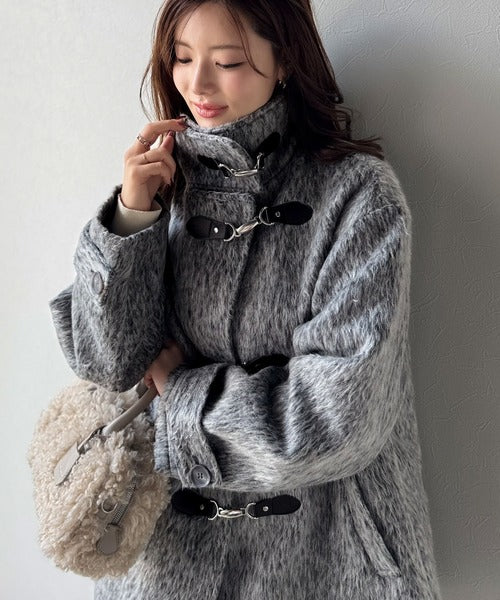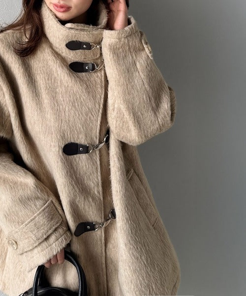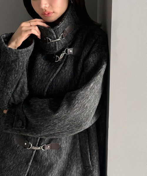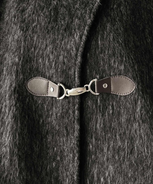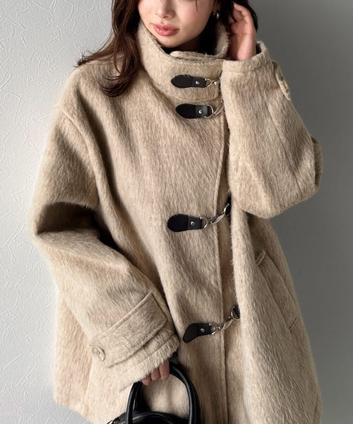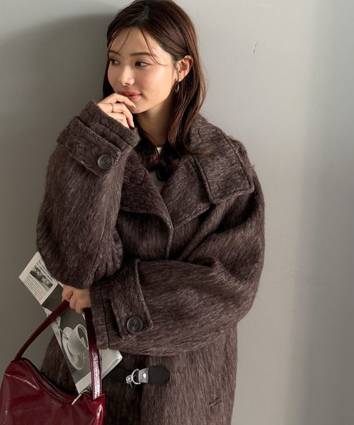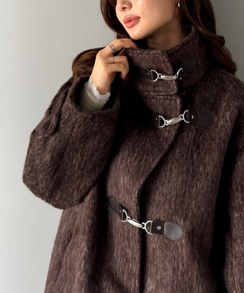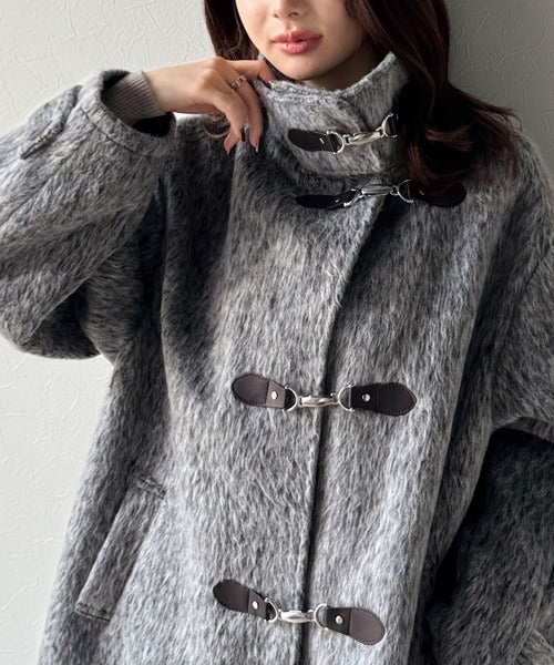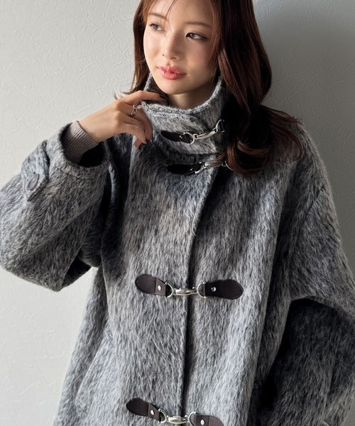 華やかさと暖かさを両立したフェザーシャギーバックル使いコート。
