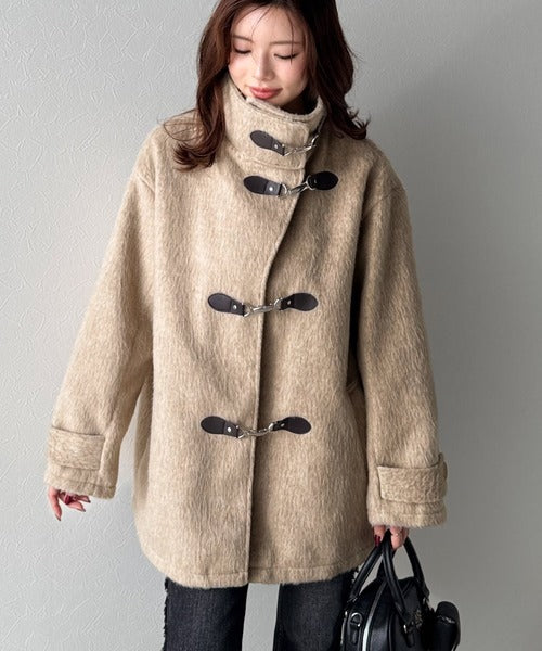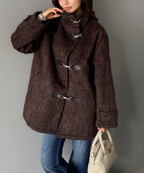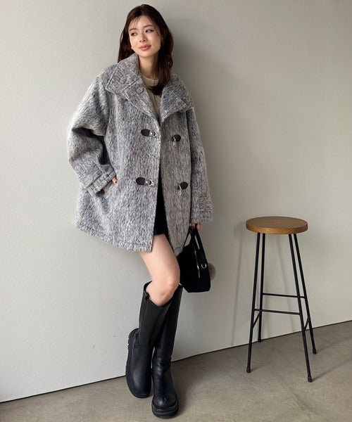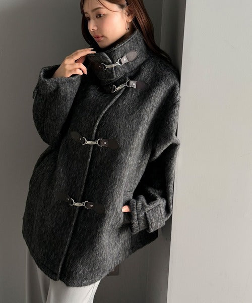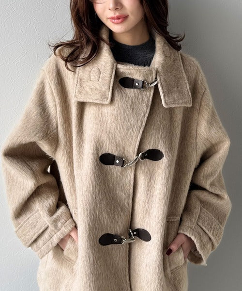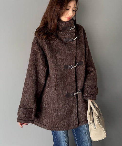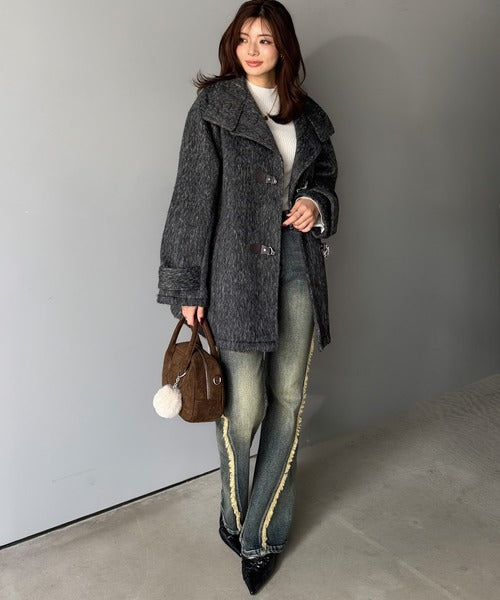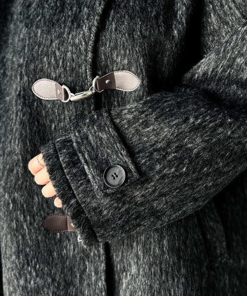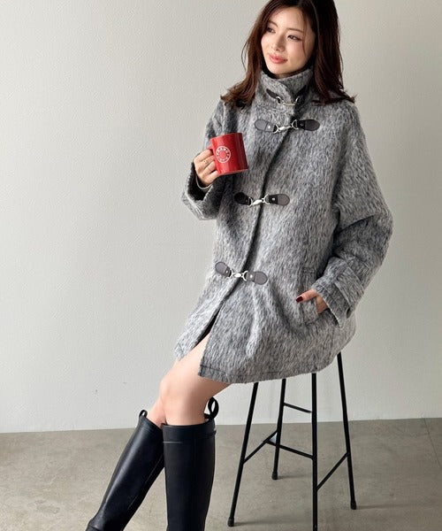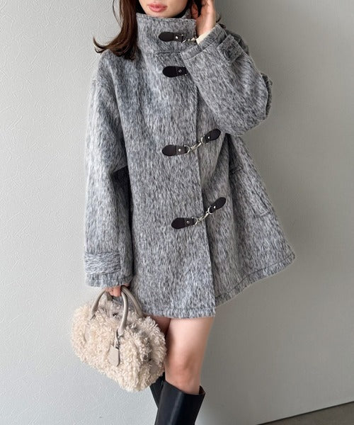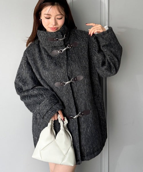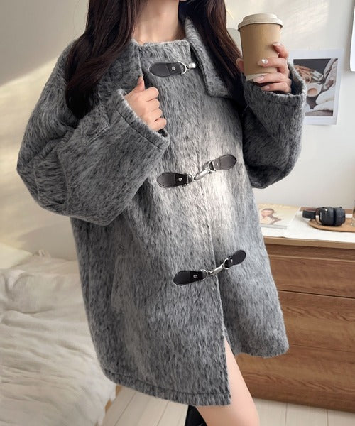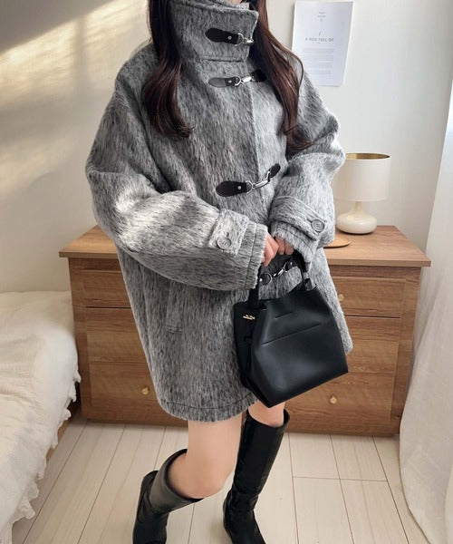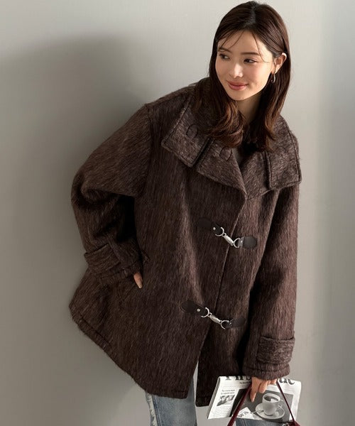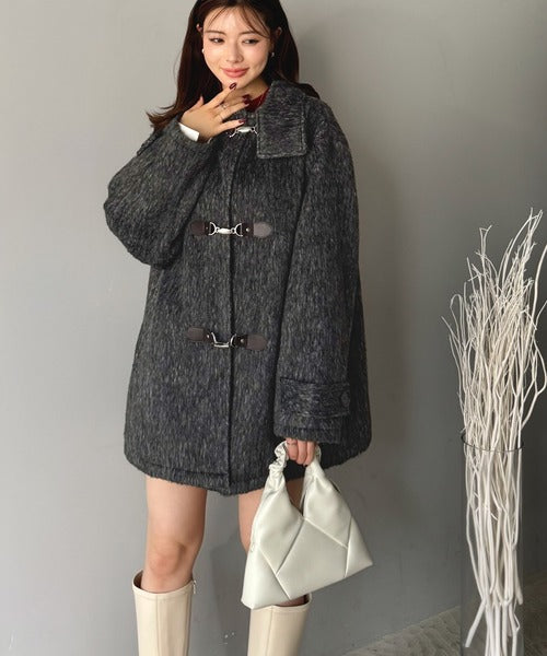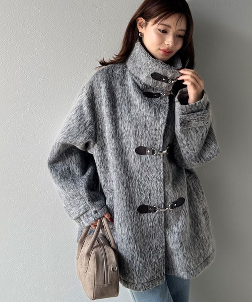 華やかさと暖かさを両立したフェザーシャギーバックル使いコート。