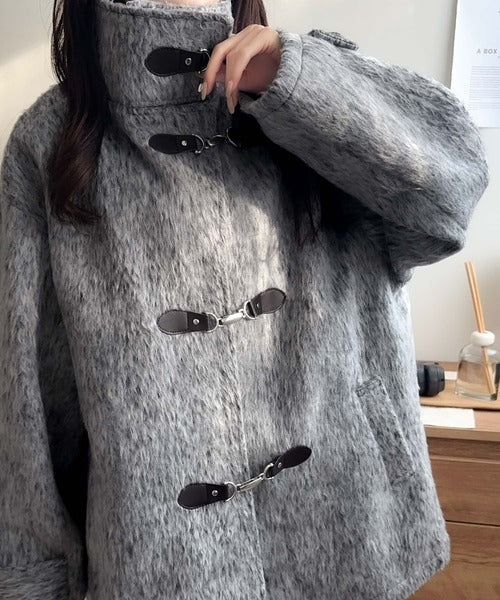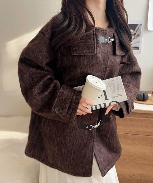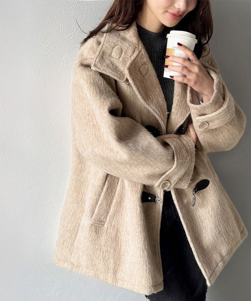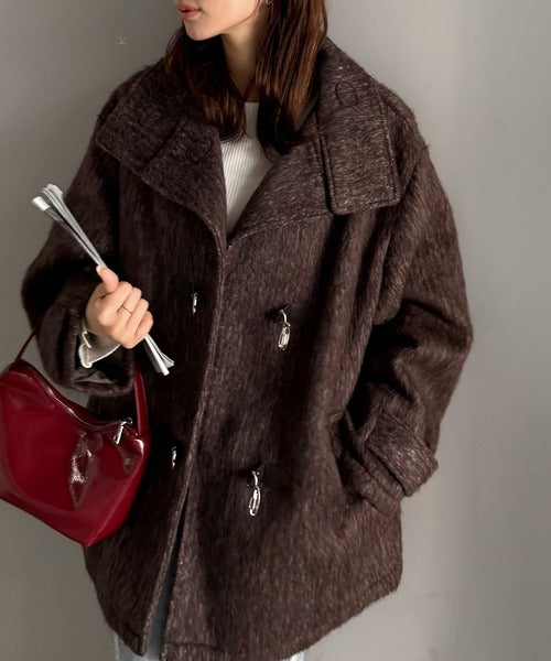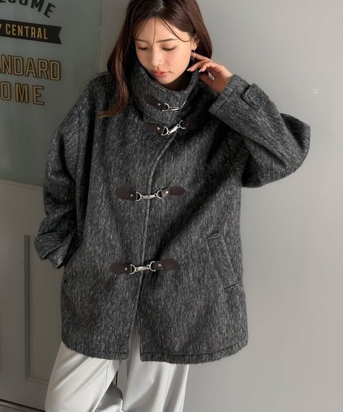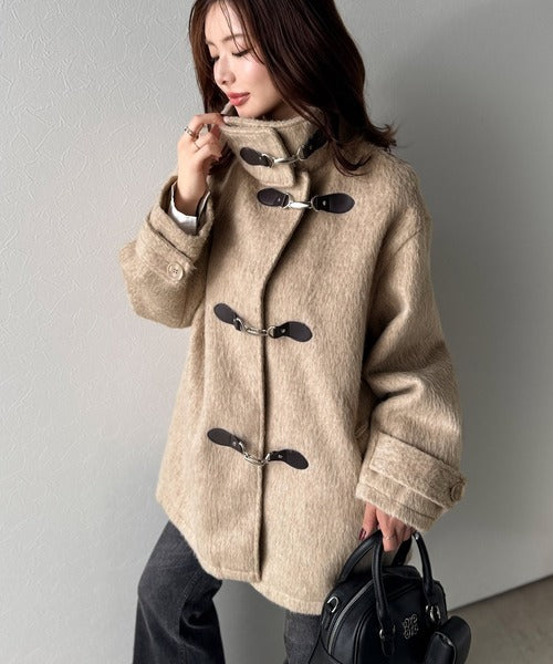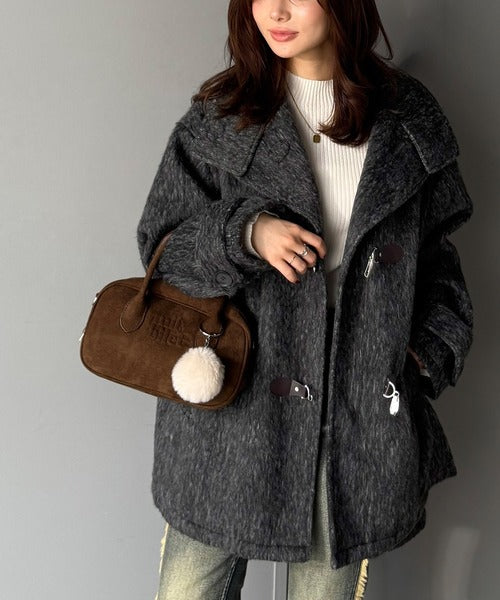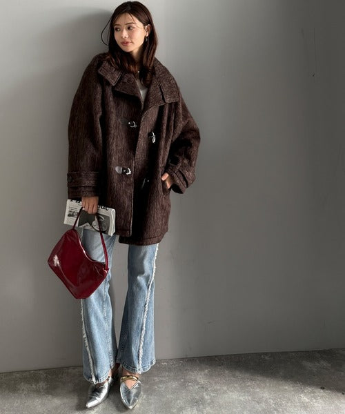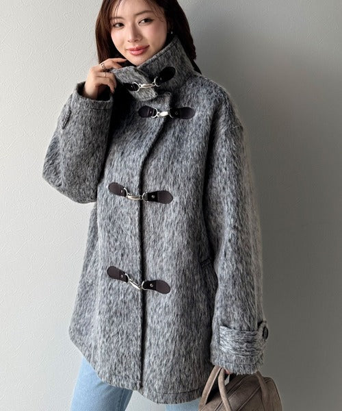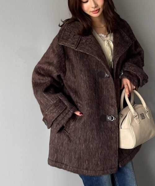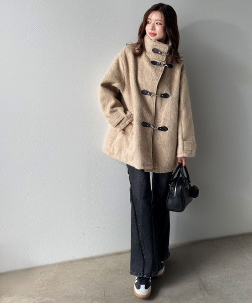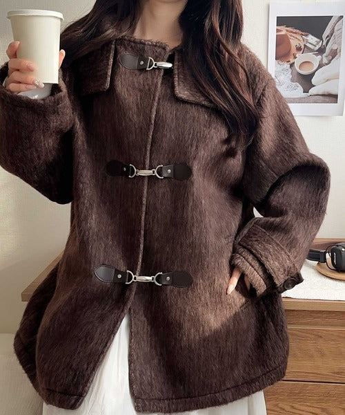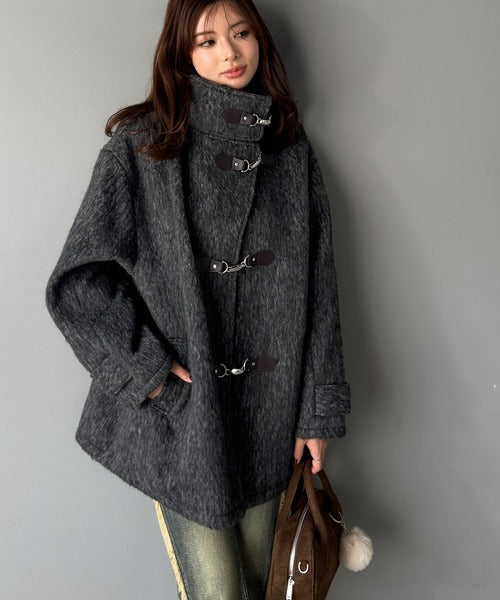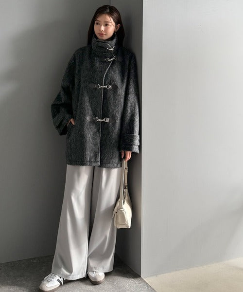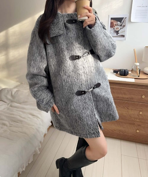 華やかさと暖かさを両立したフェザーシャギーバックル使いコート。