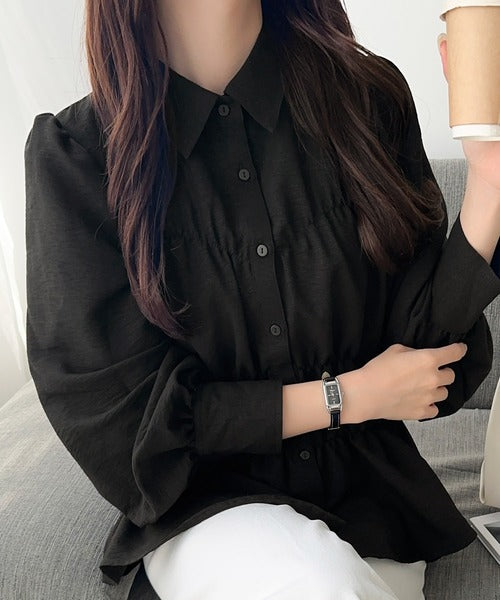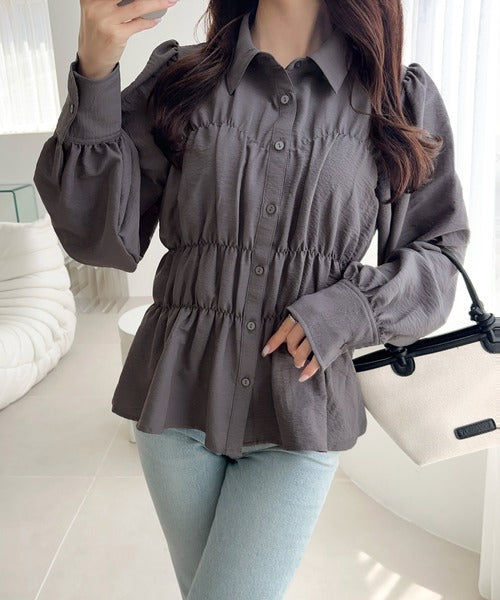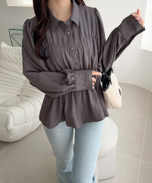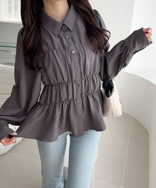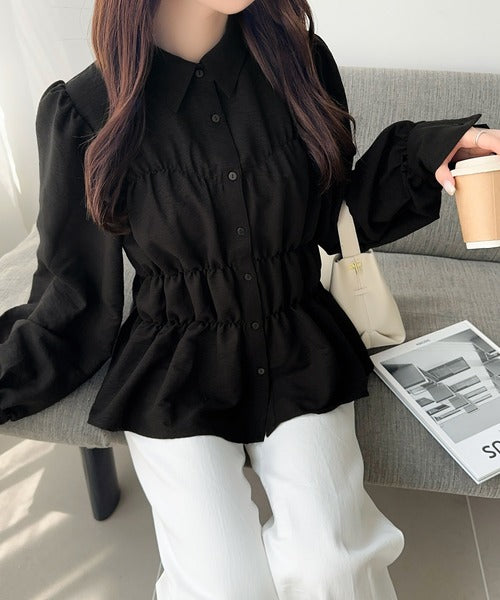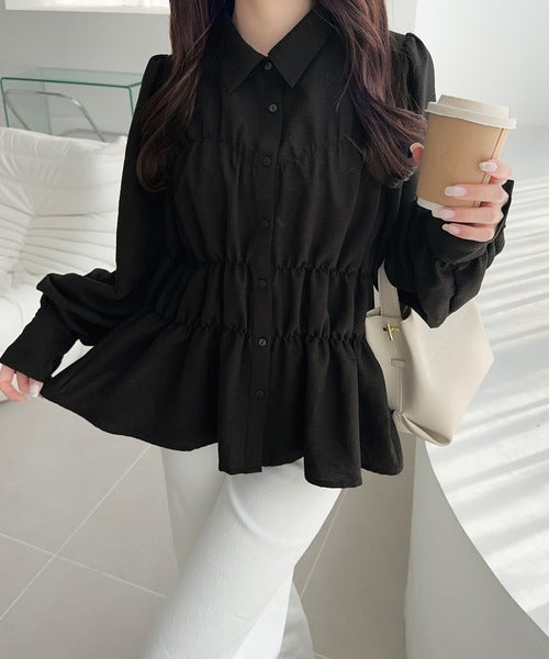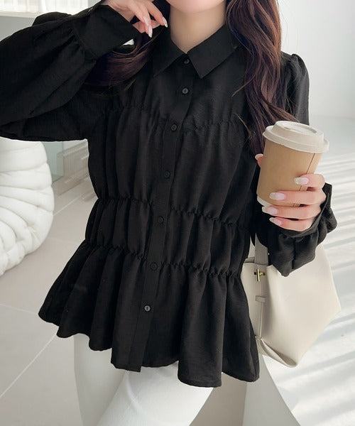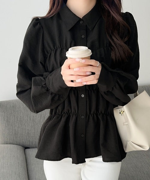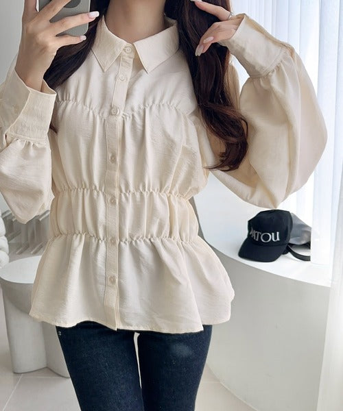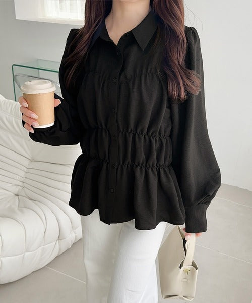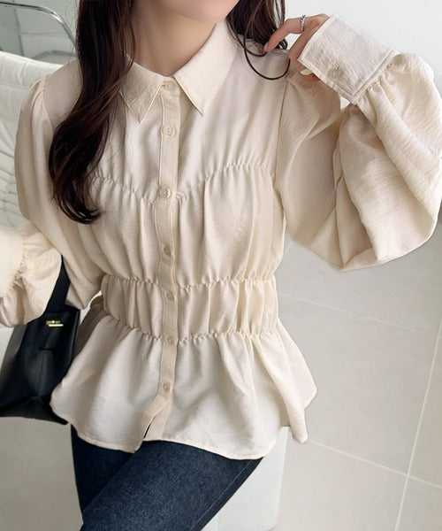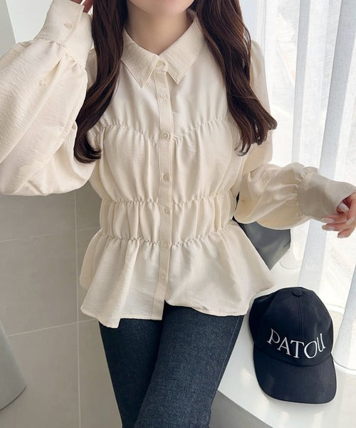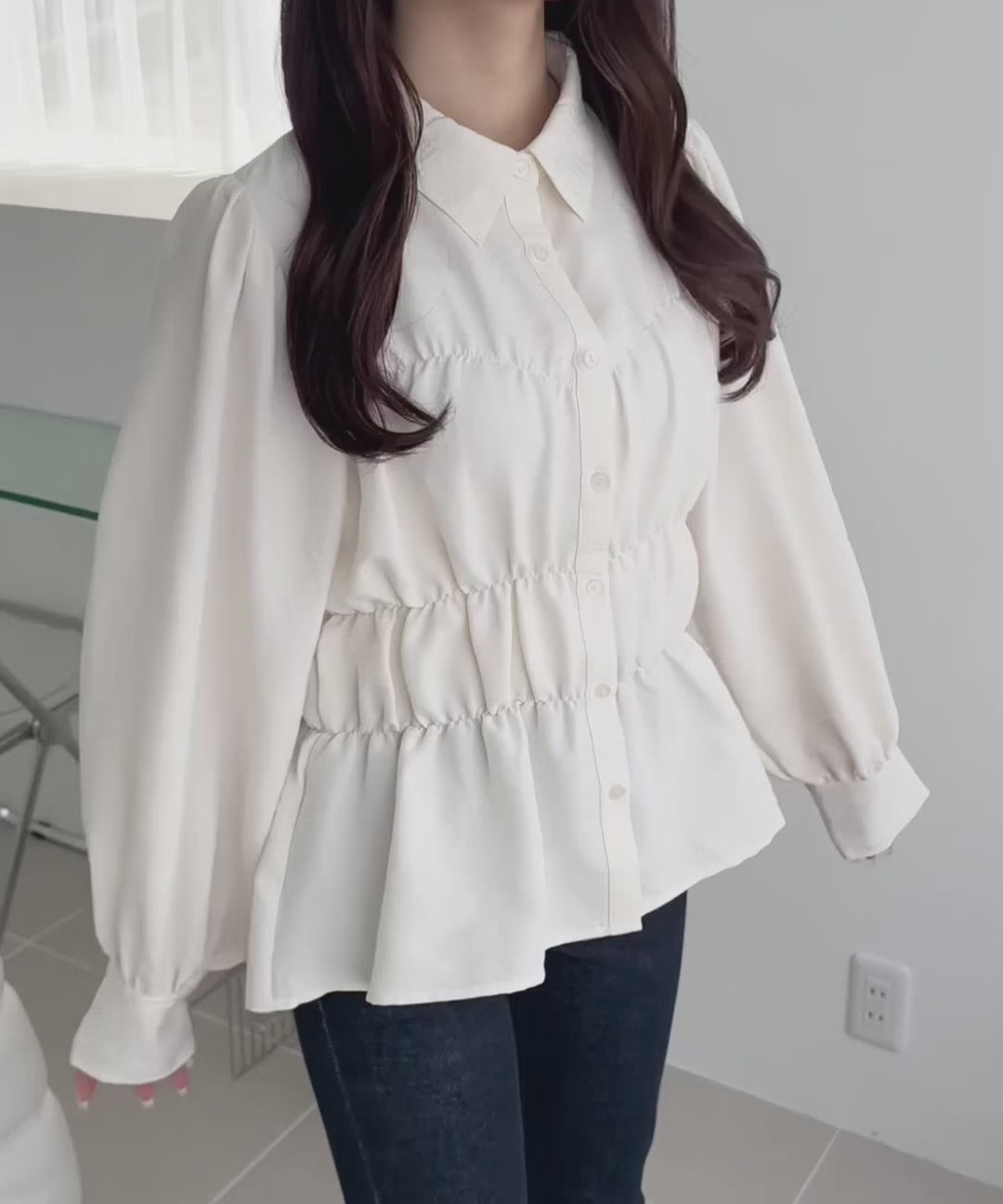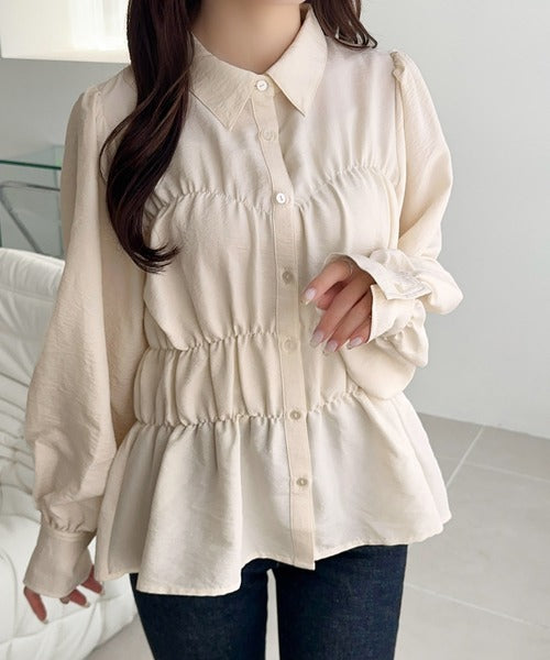 【mily bilet】一枚で、主役級◎。ビスチェ見えパフスリーブペプラム裾シャーリングブラウス(長袖) mi1019100