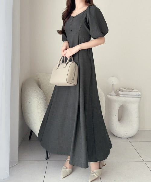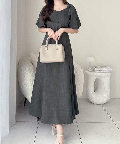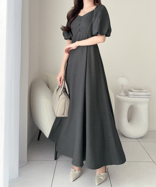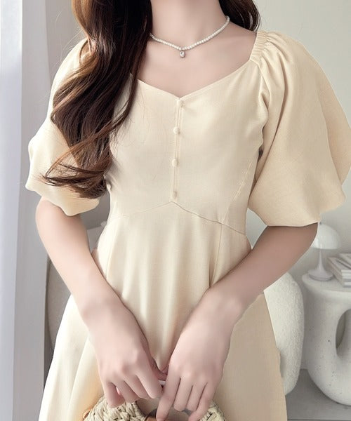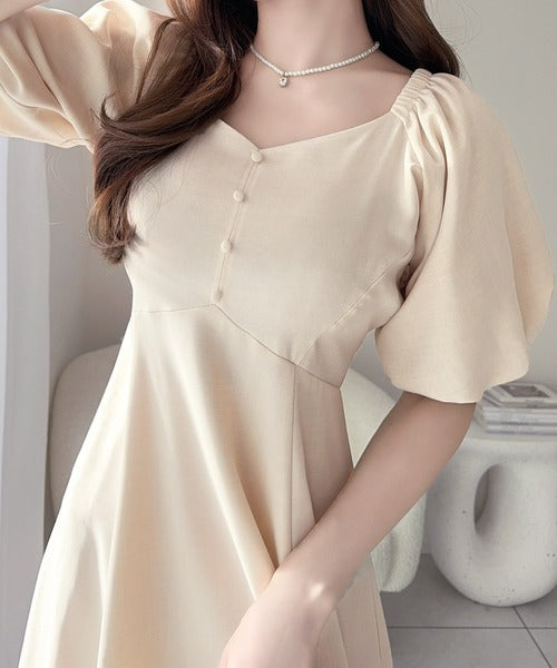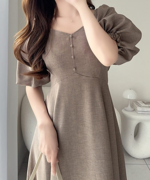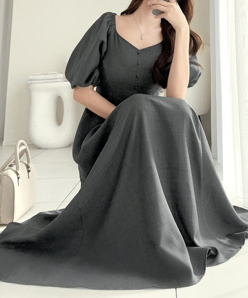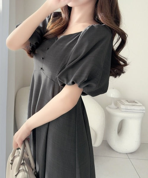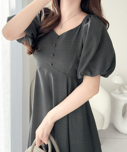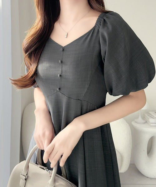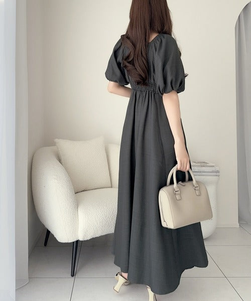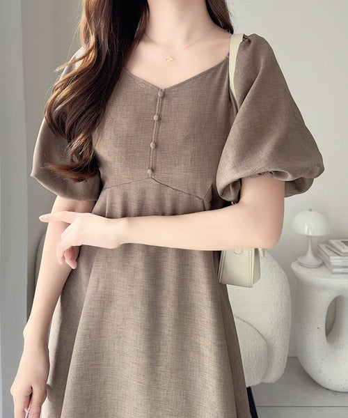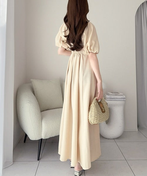 デコルテを綺麗に魅せるVネックとパフスリーブが印象的♪