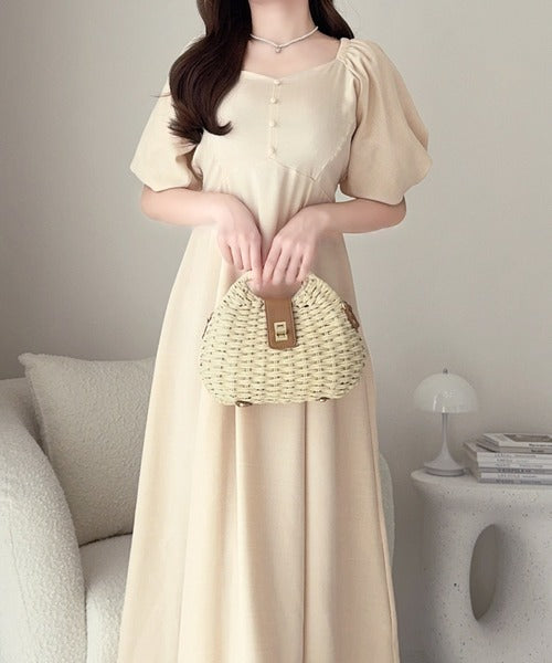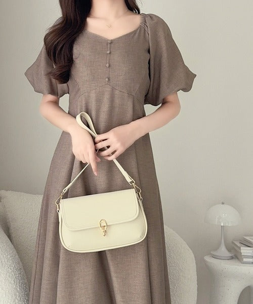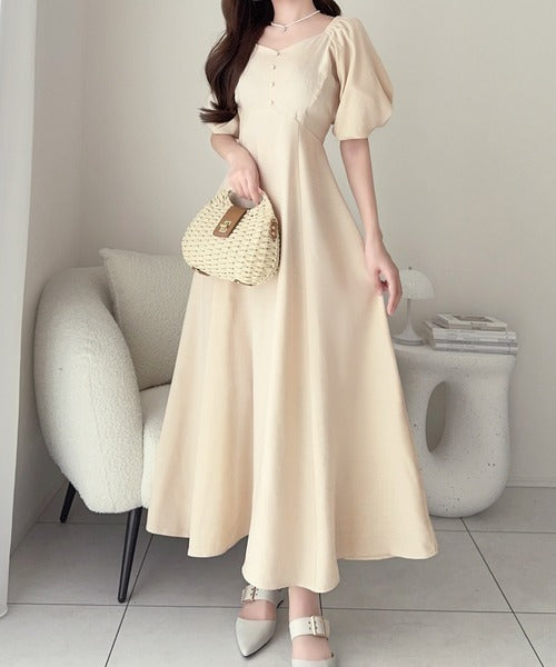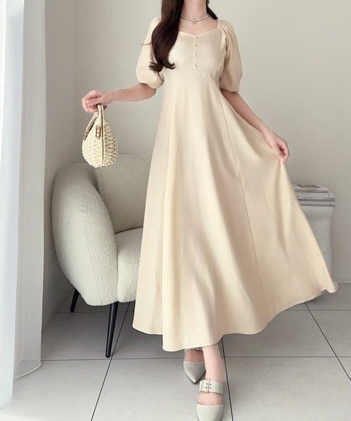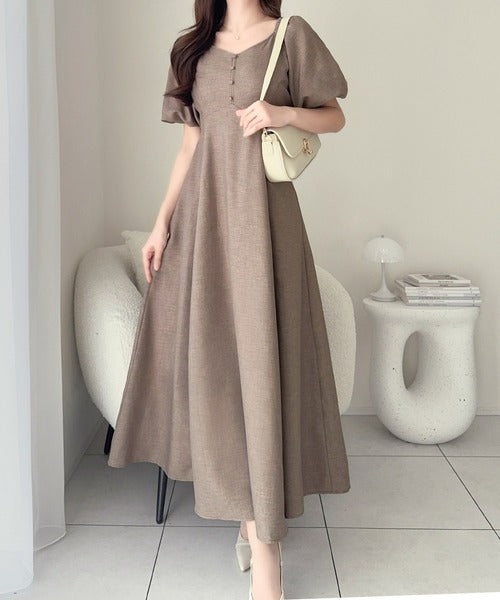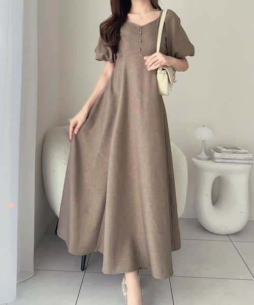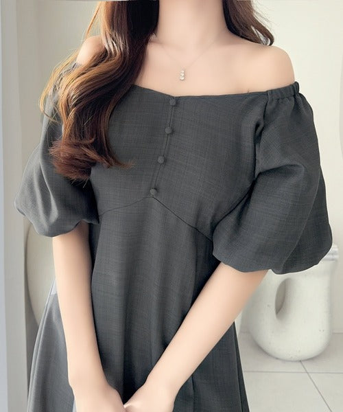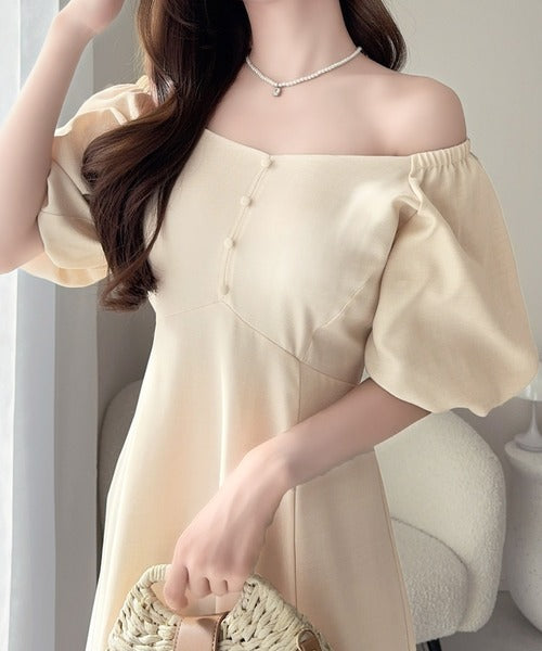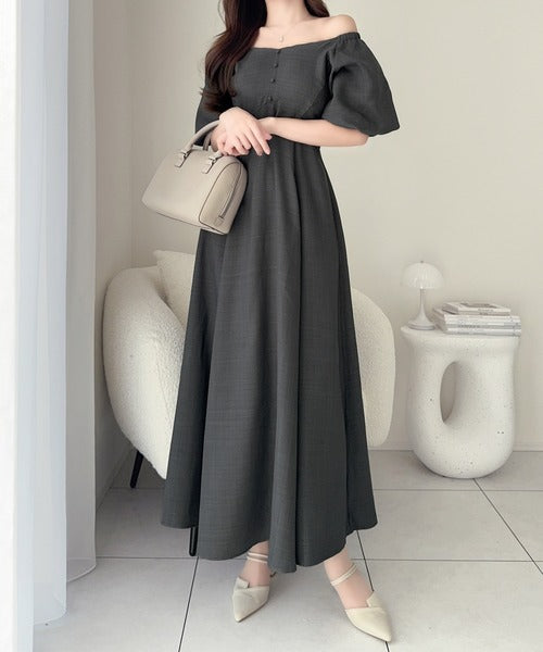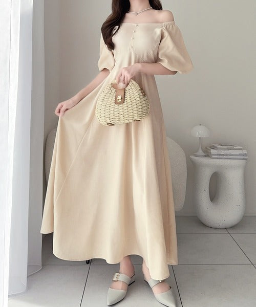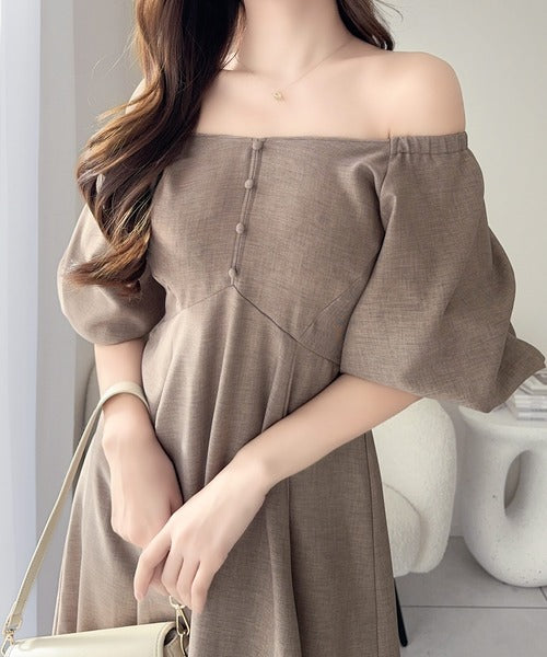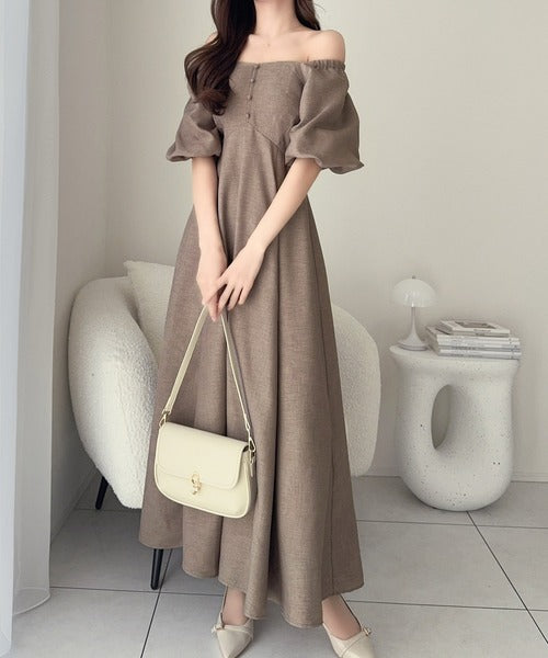 【mily bilet】大人可愛いパフスリーブが印象的。オフショル2wayパフスリーブリネンライクワンピース (ロング丈) mi1019128