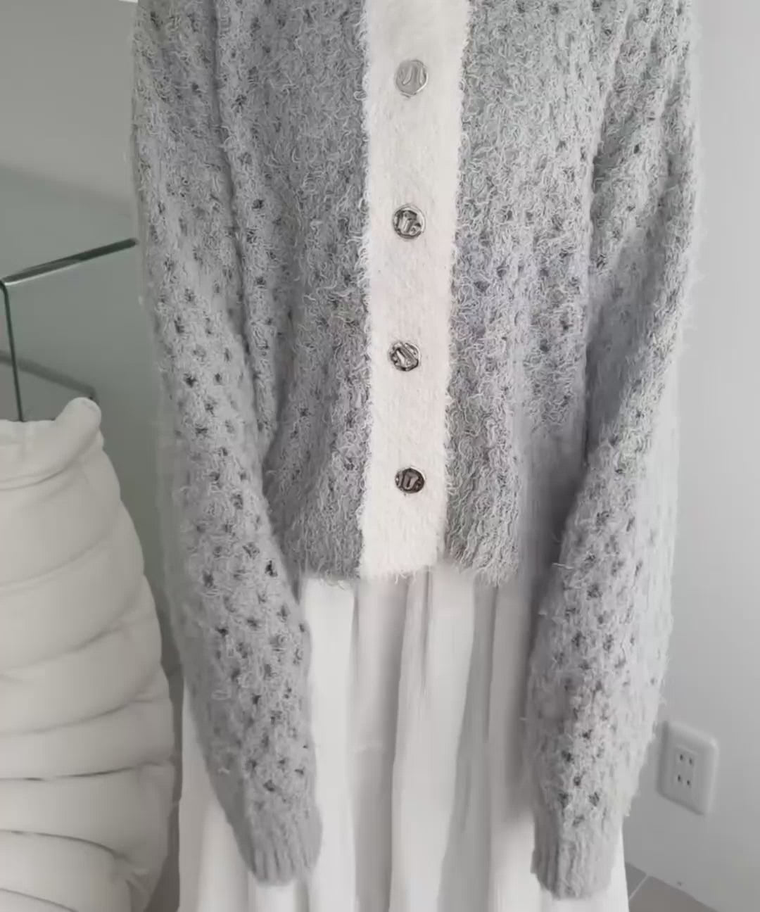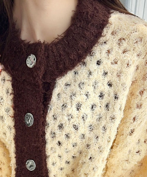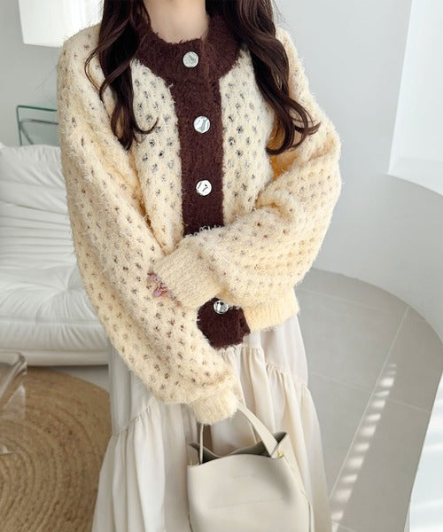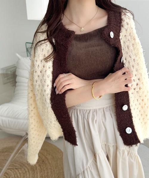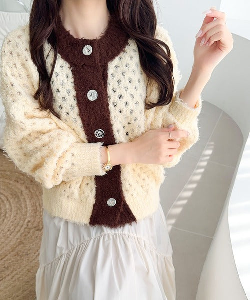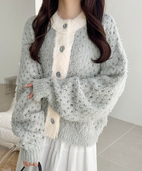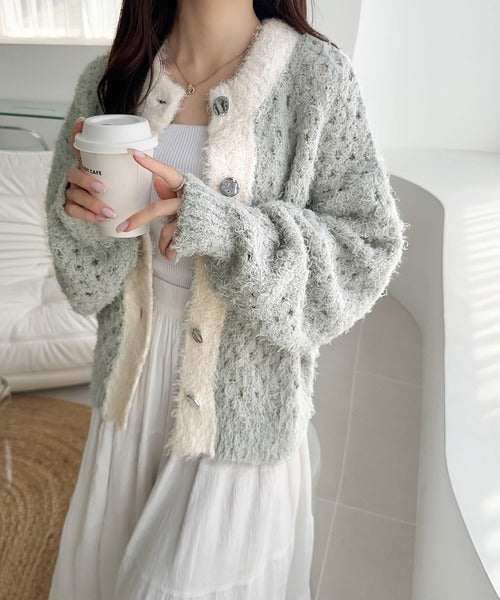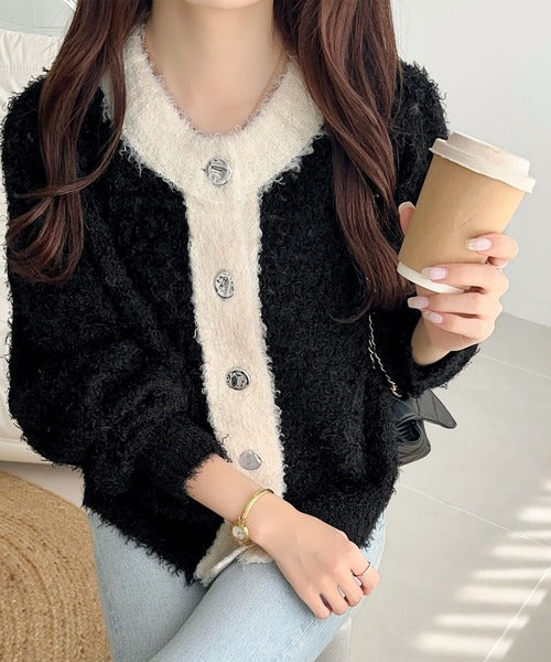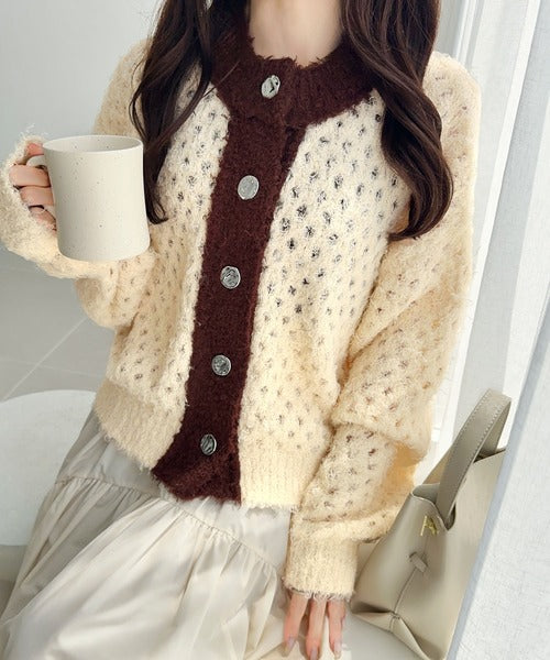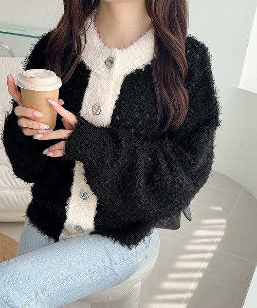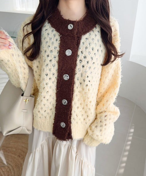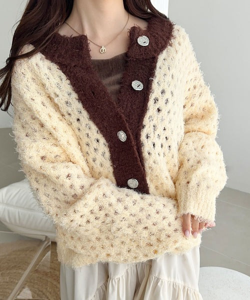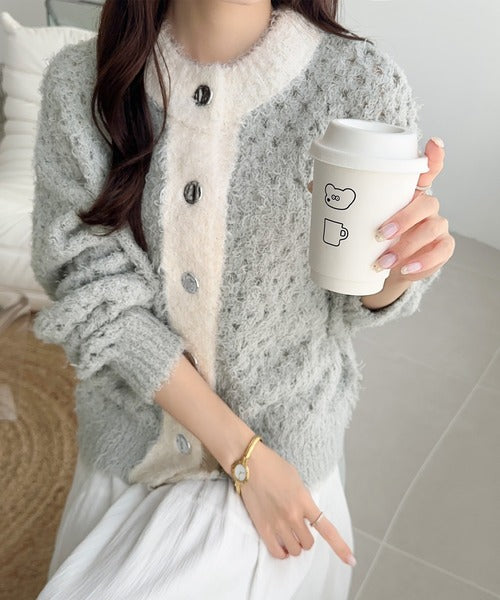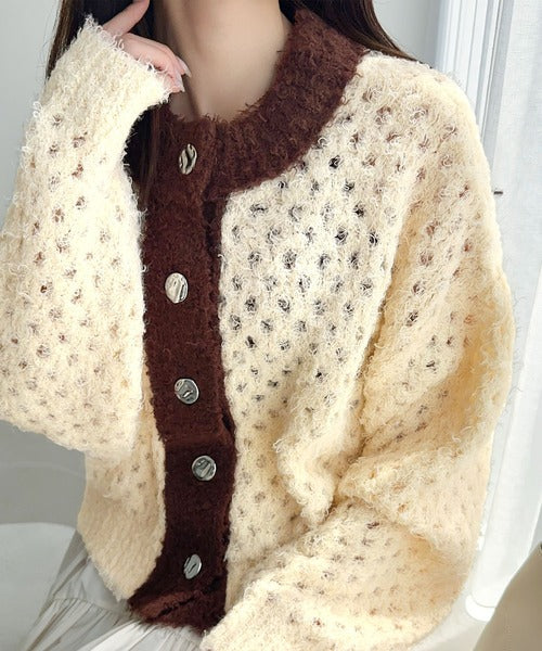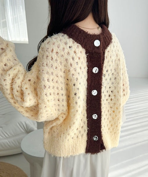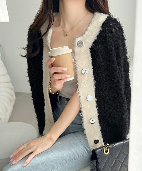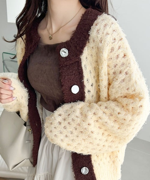 大人可愛い配色バイカラーカーディガン。