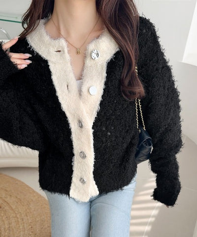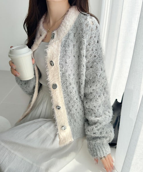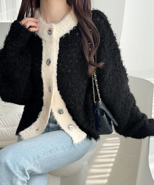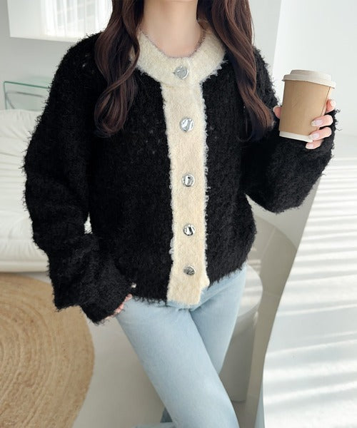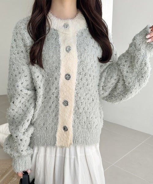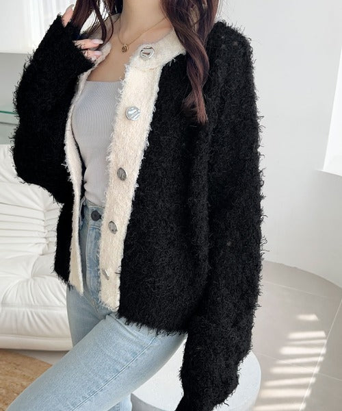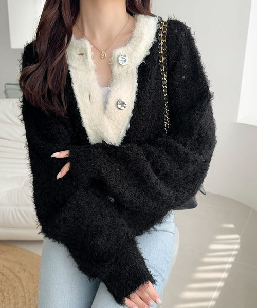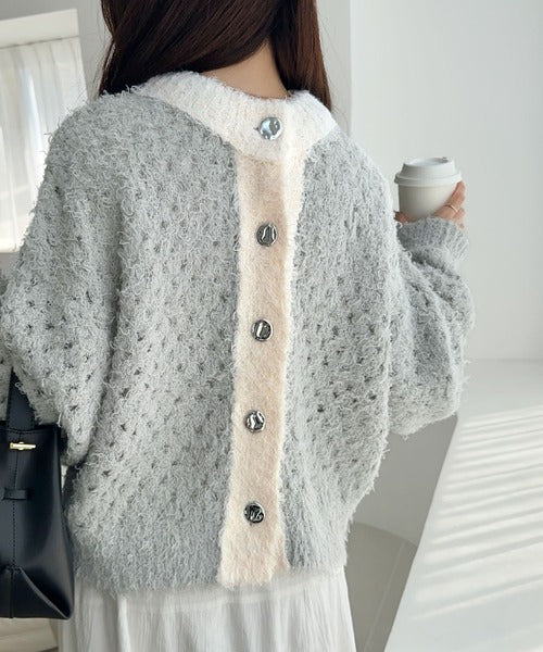 【mily bilet】バイカラー映えがお洒落見えの鍵。メタルボタン使いフェザーヤーン前後2wayニットカーディガン mi1029157