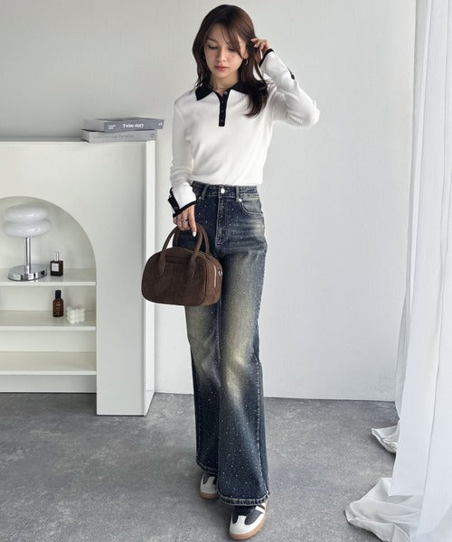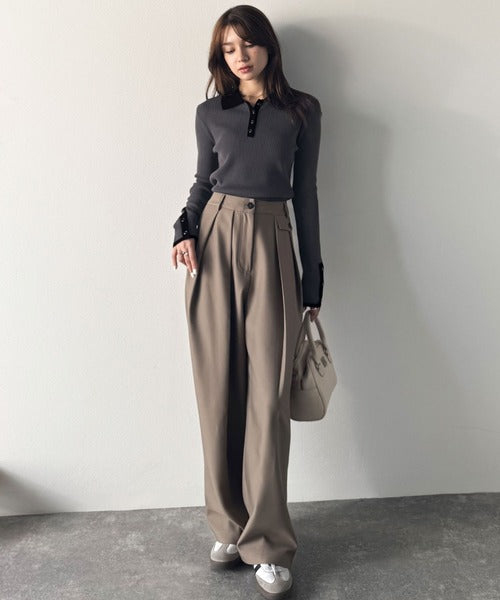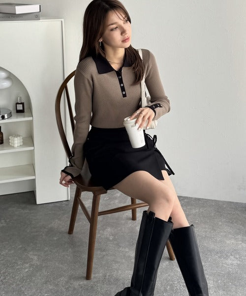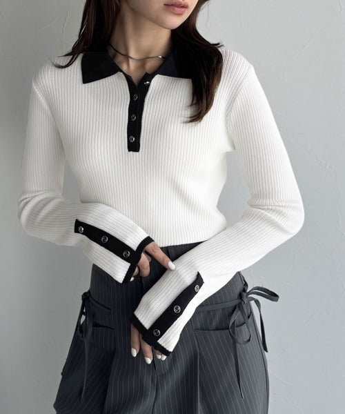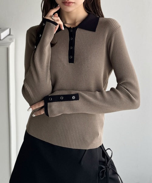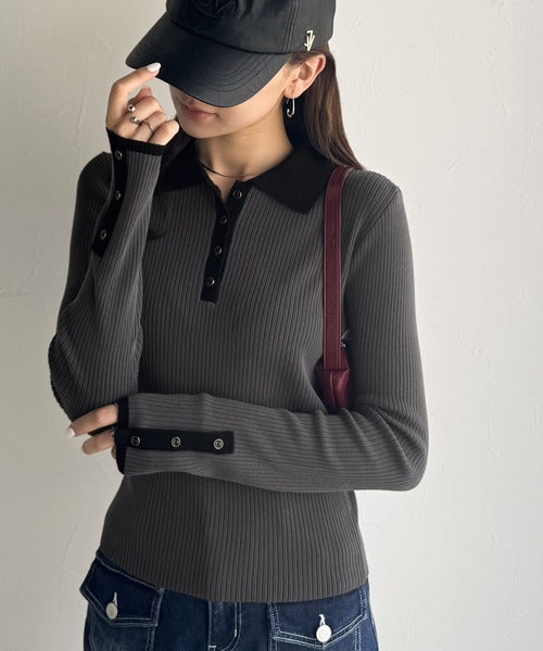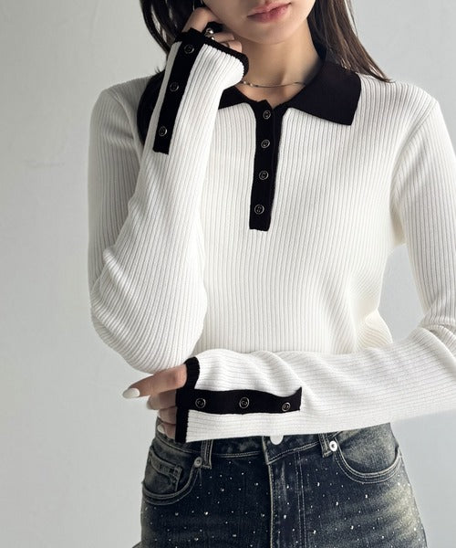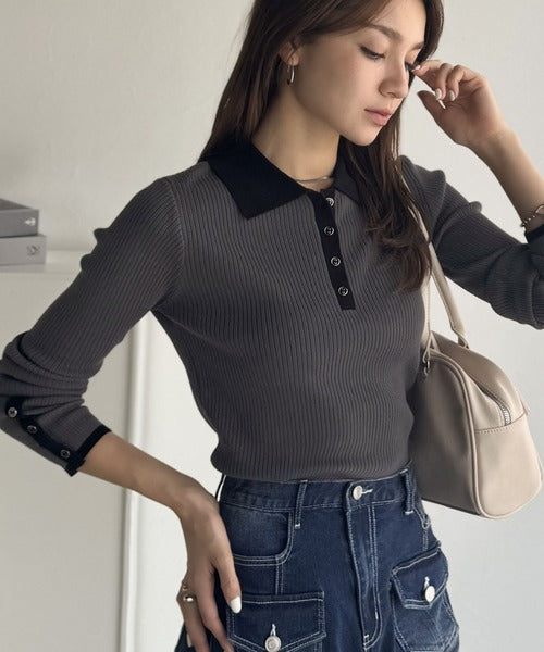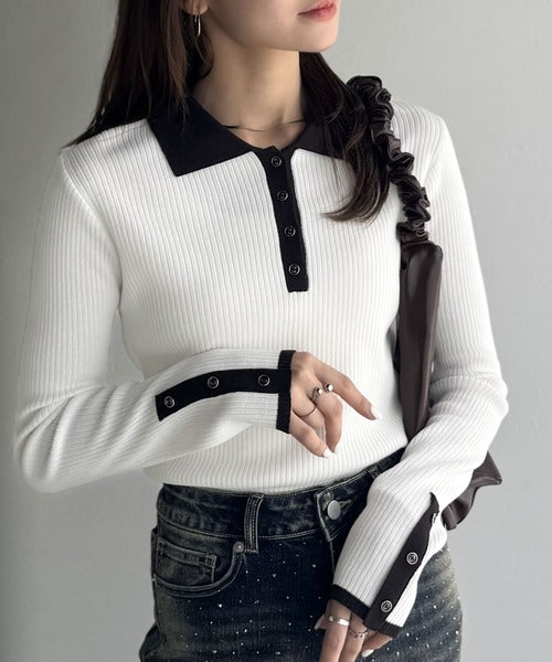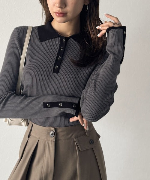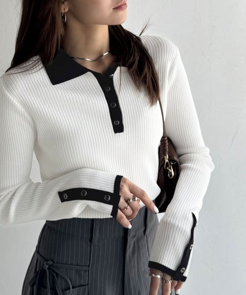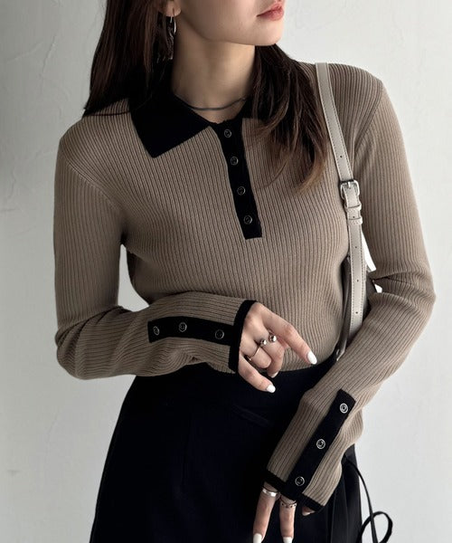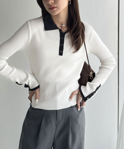 この季節に大活躍のリブ編みバイカラーポロニット。