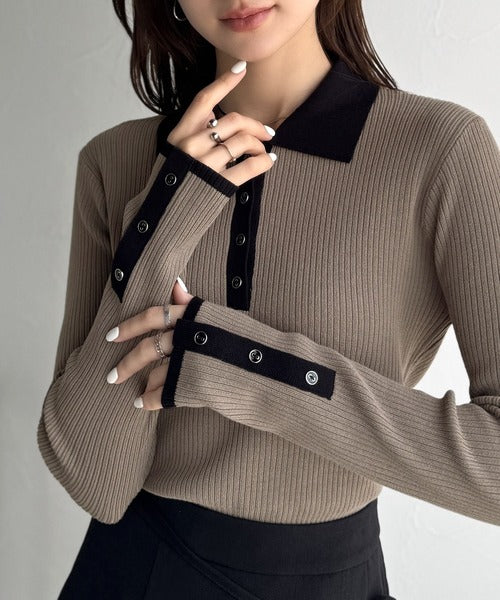 【mily bilet】トレンドの襟付きデザインで洗練されたスタイルに♪金縁ボタン使いリブポロニット(長袖) mi1029162