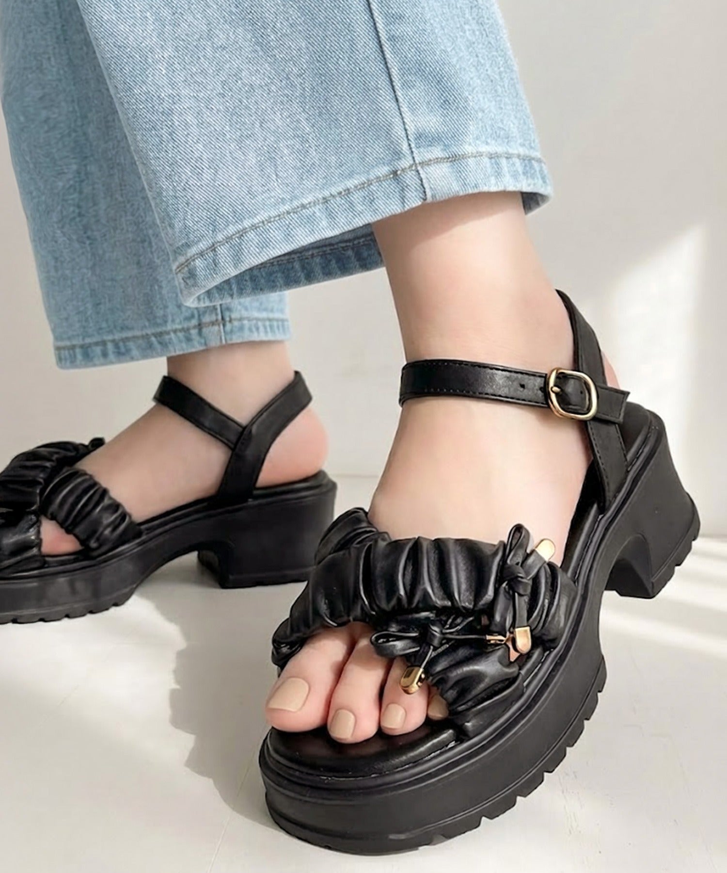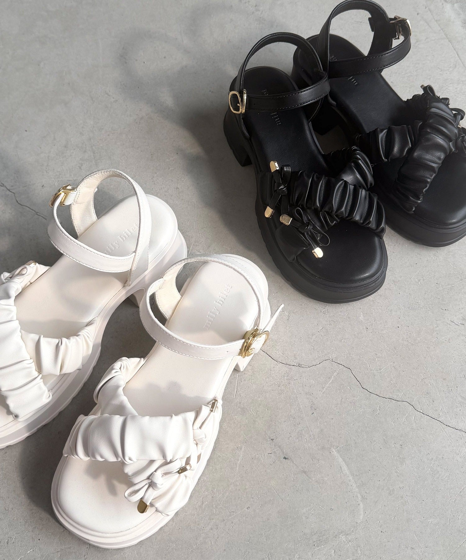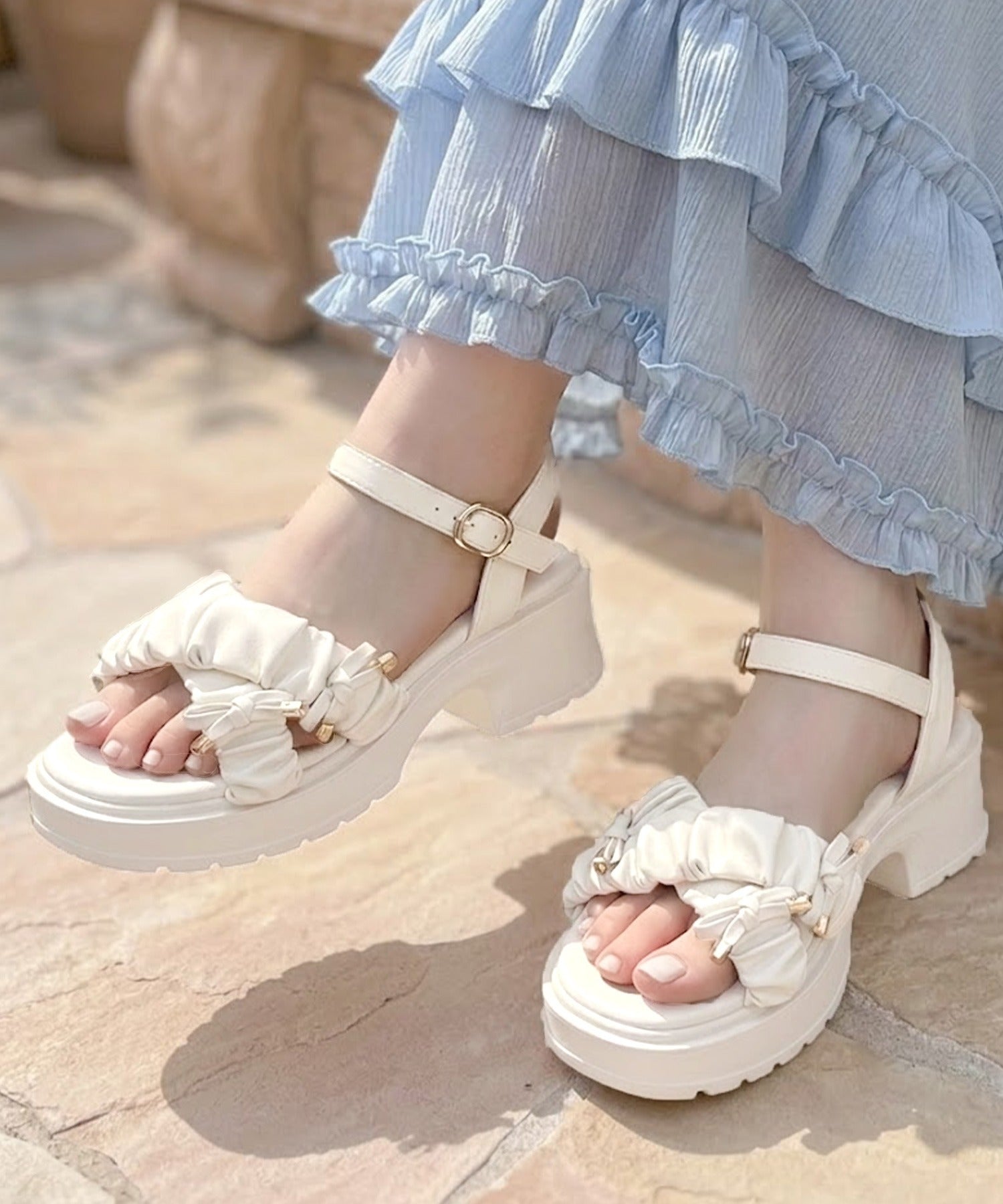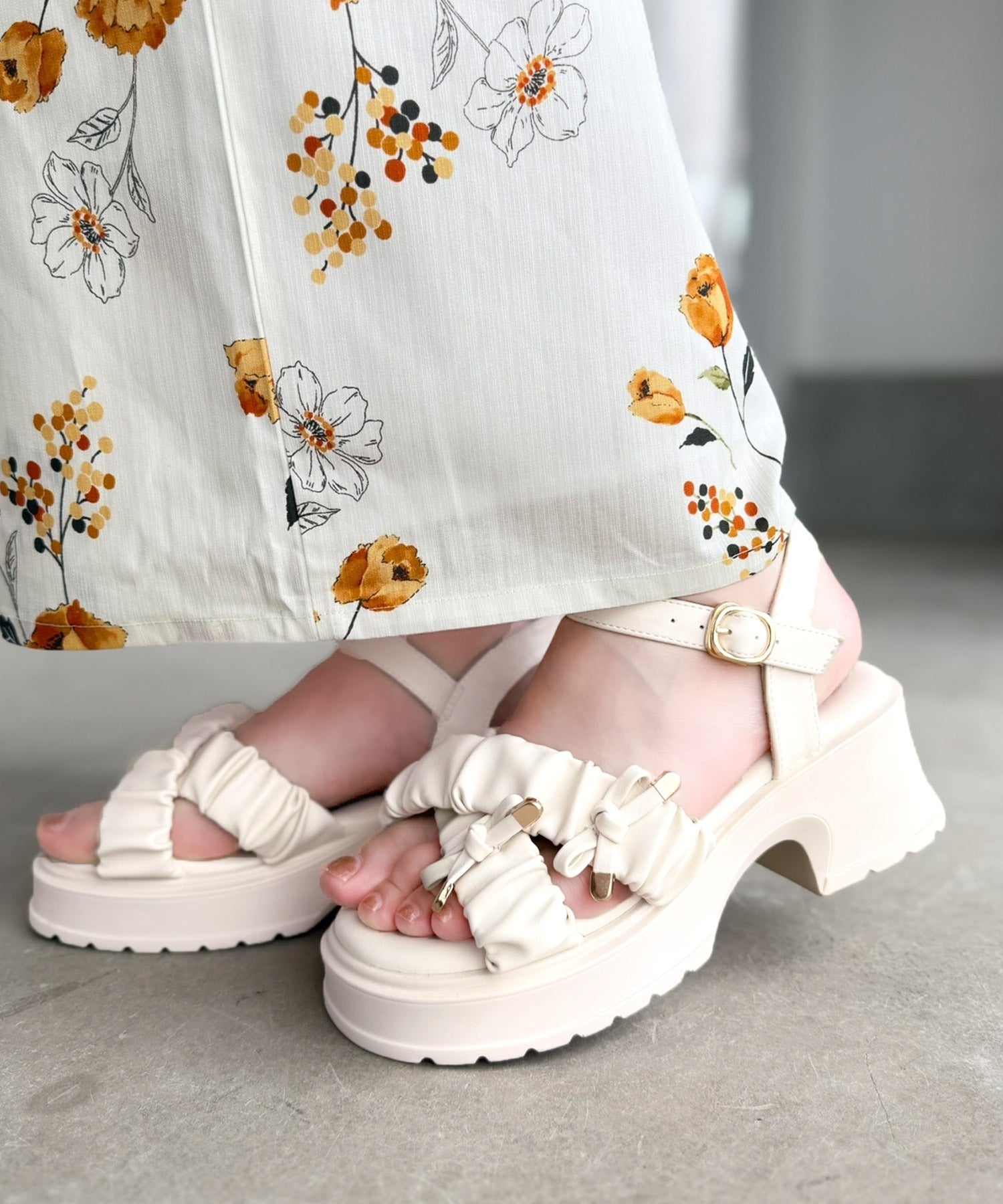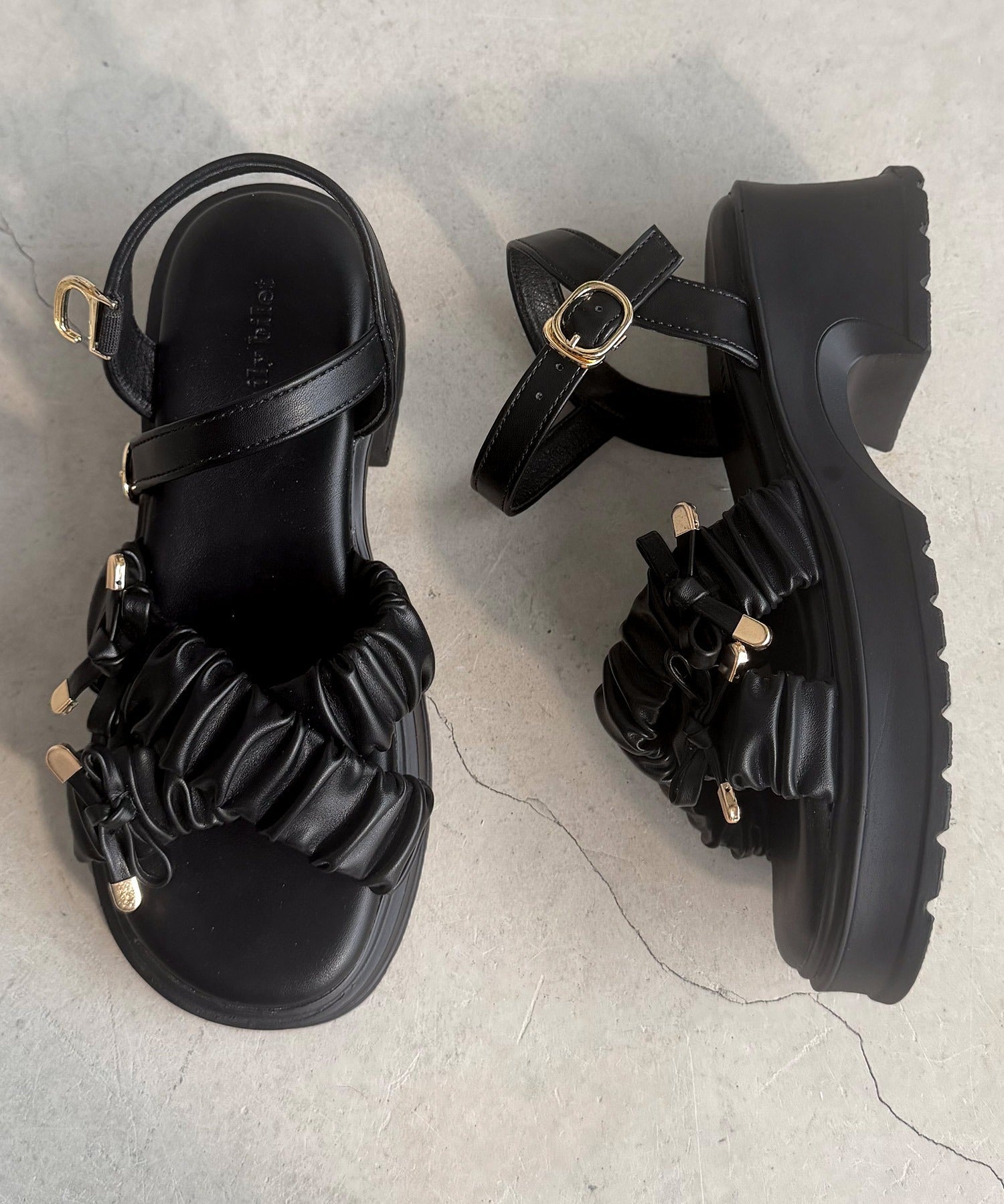 ふっくらとしたギャザーストラップが足元を華やかに演出。