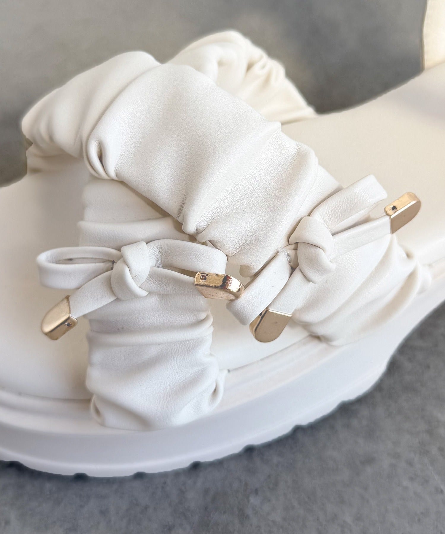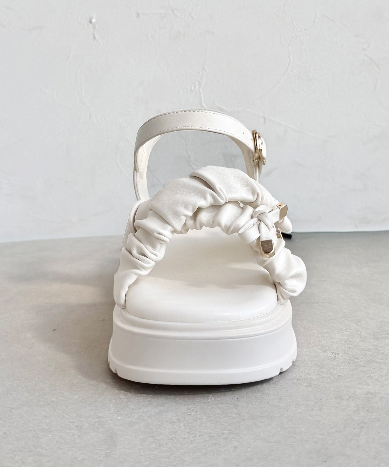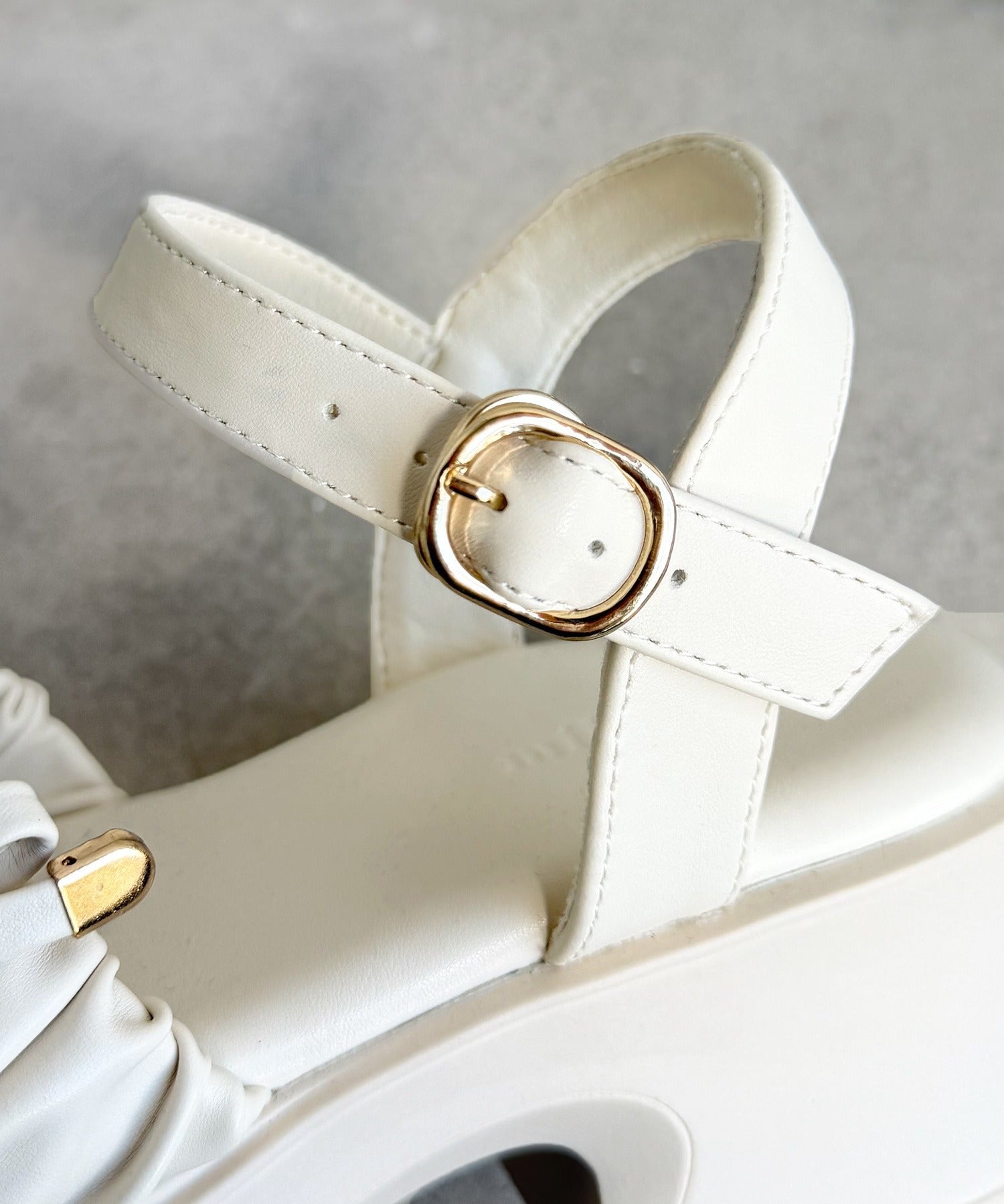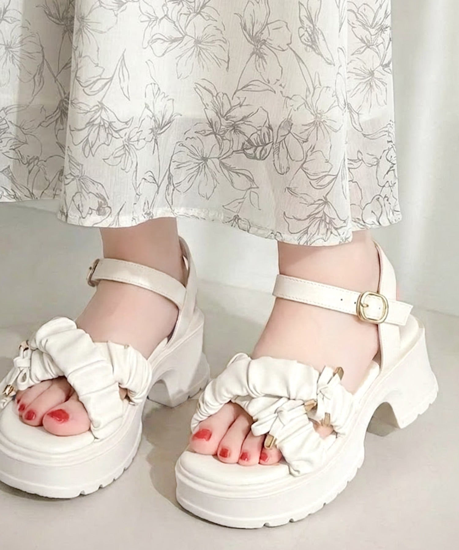 ふっくらとしたギャザーストラップが足元を華やかに演出。