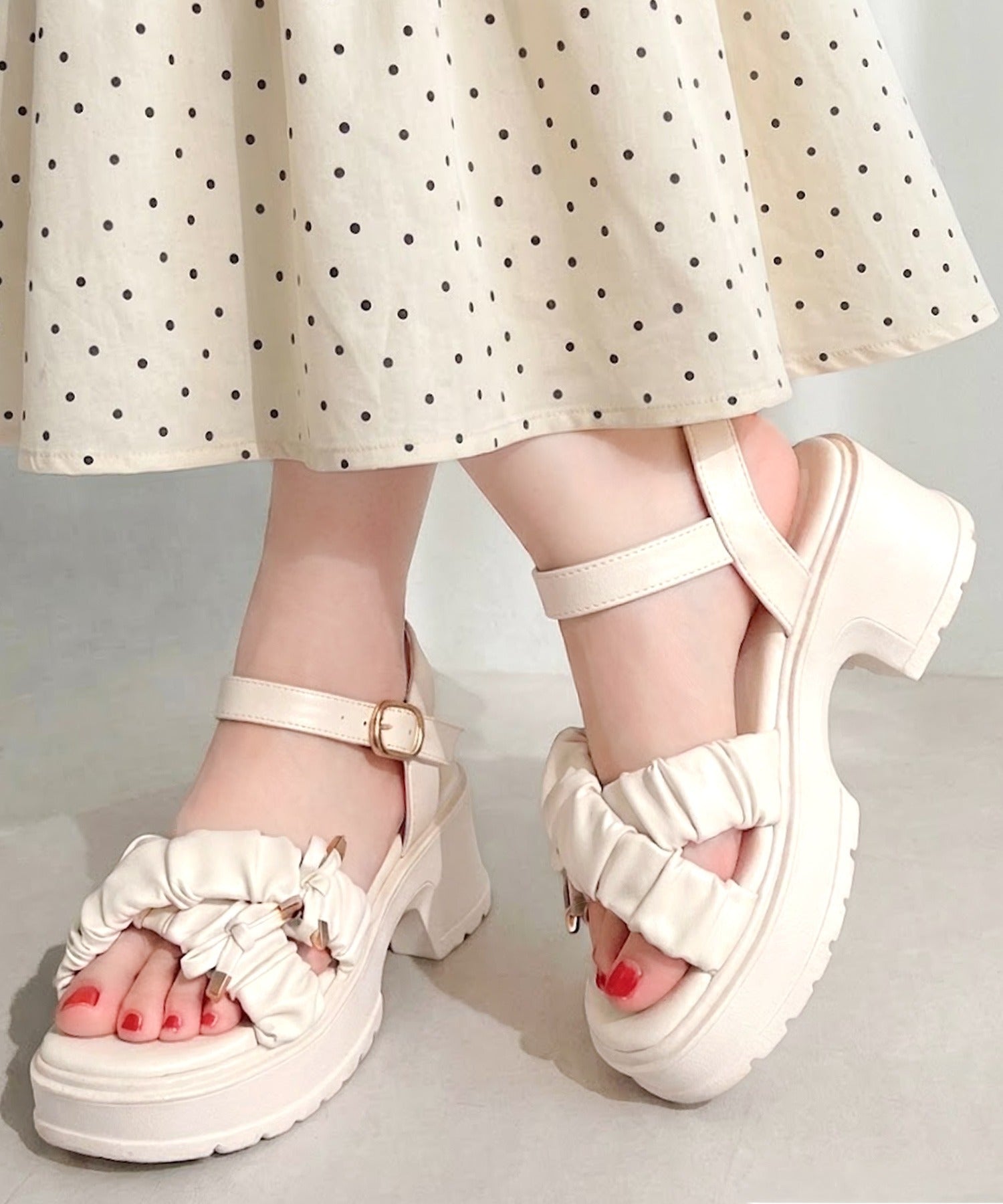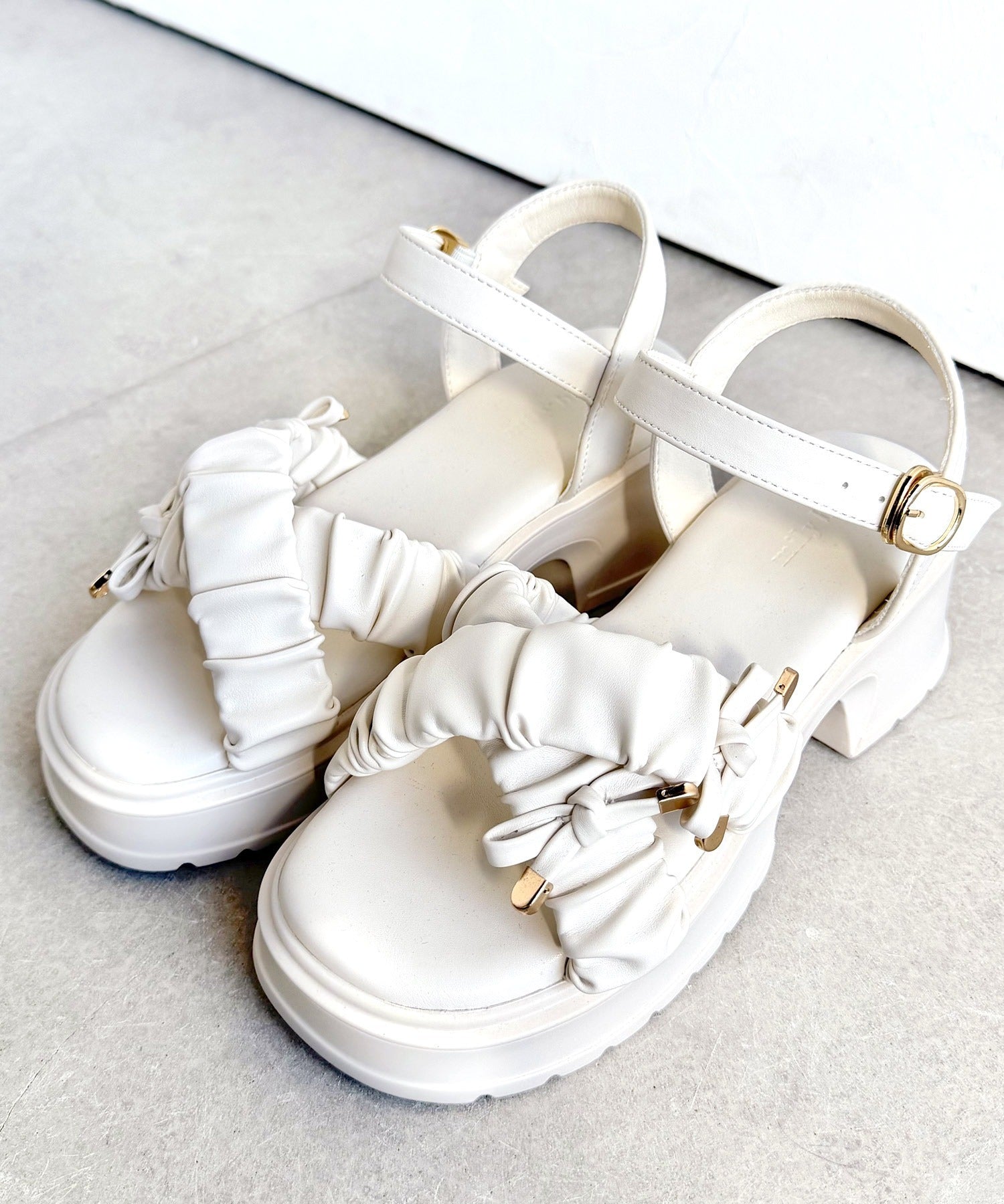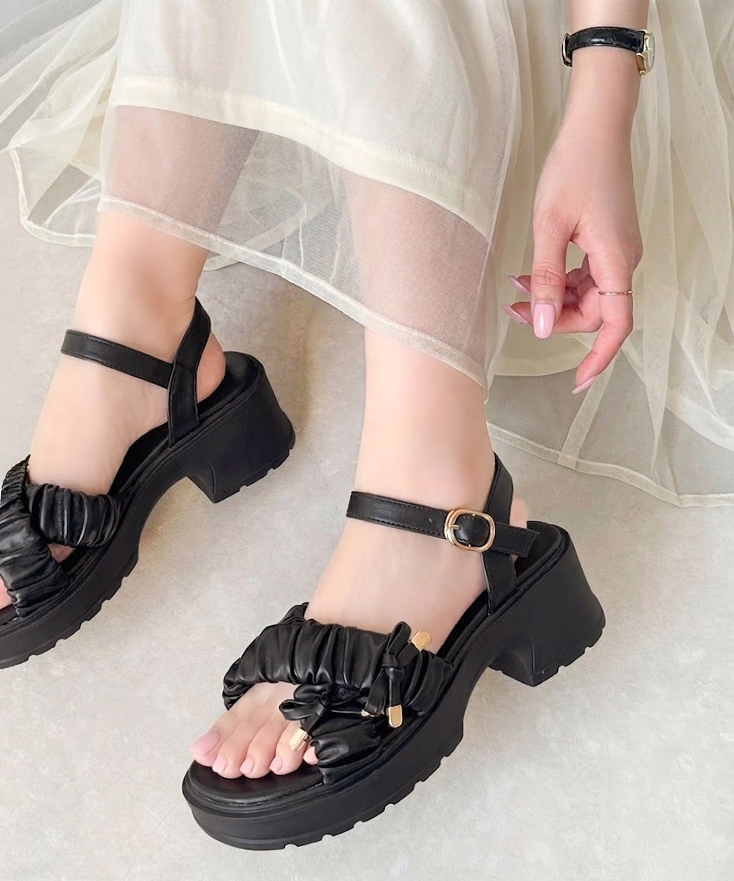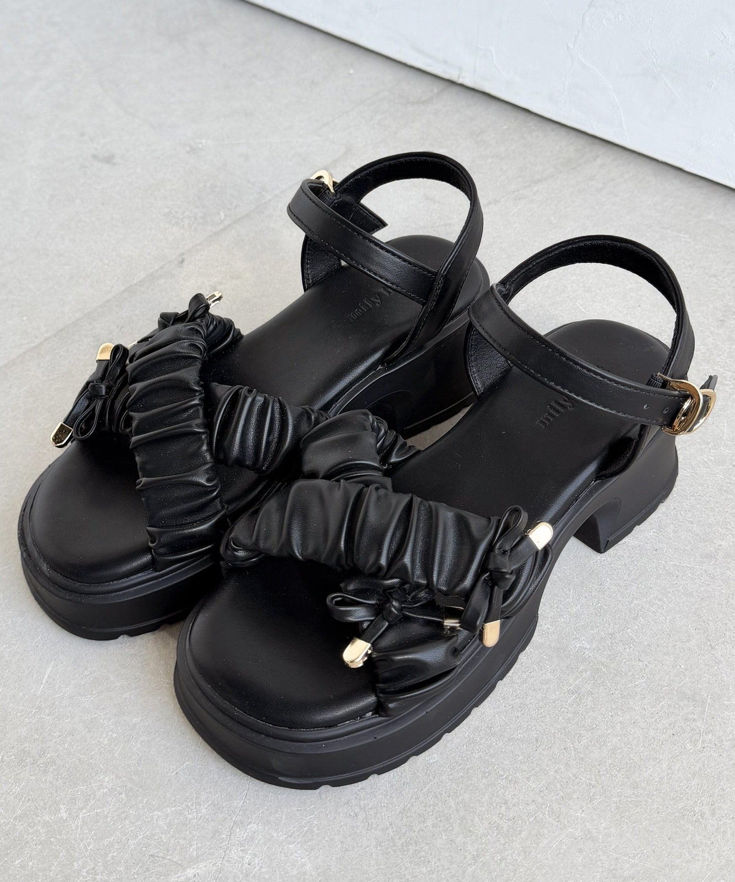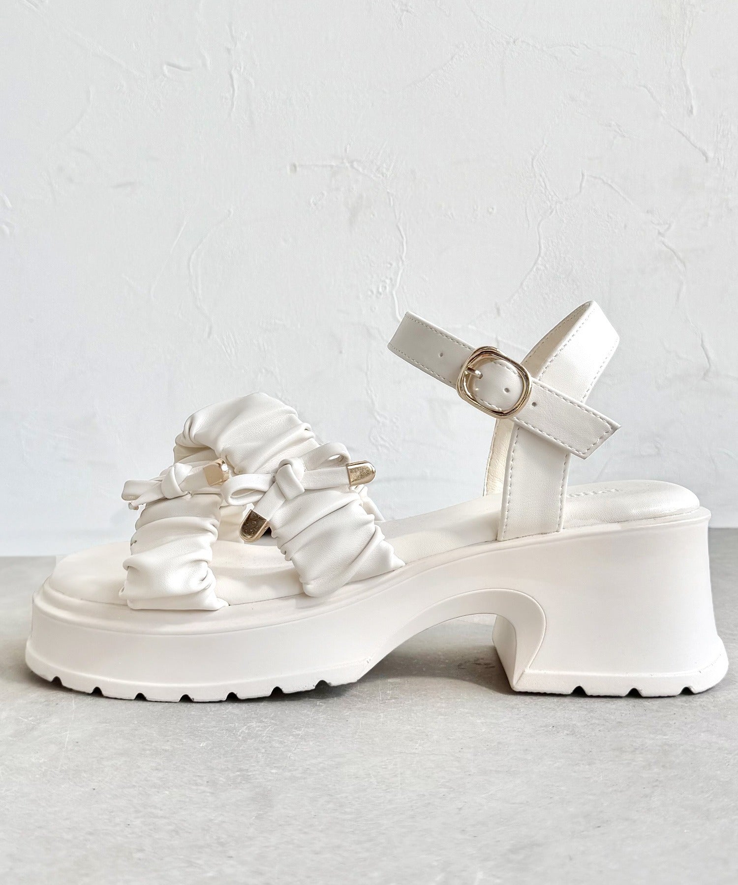 ふっくらとしたギャザーストラップが足元を華やかに演出。